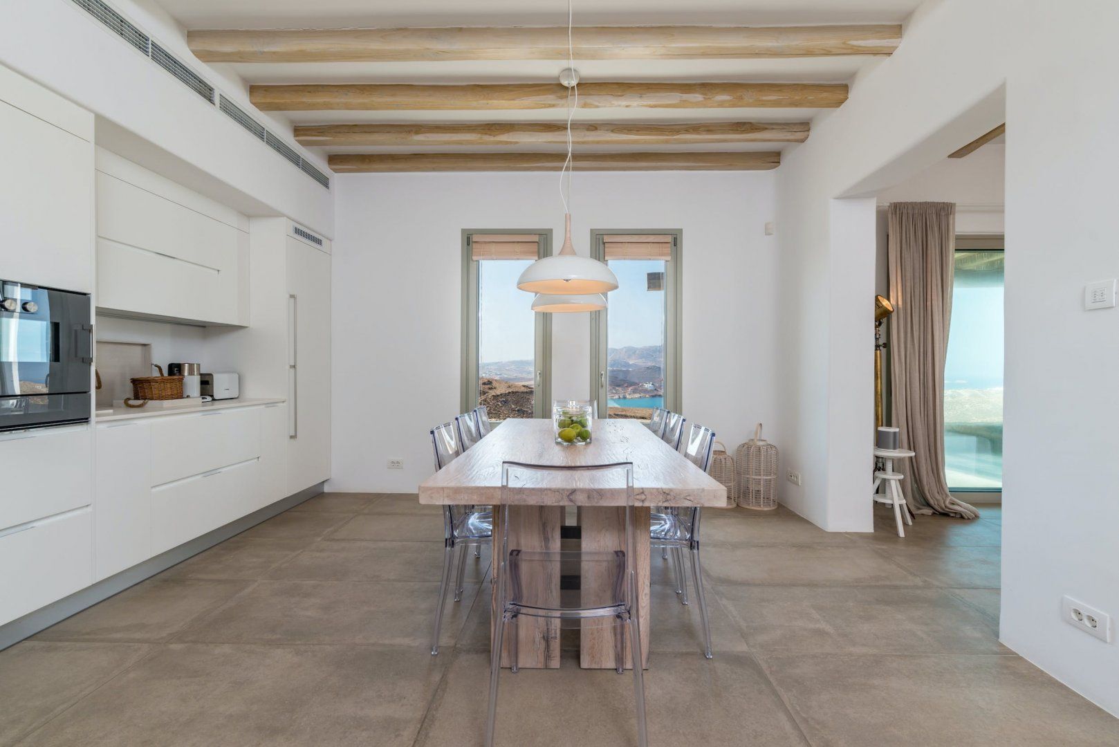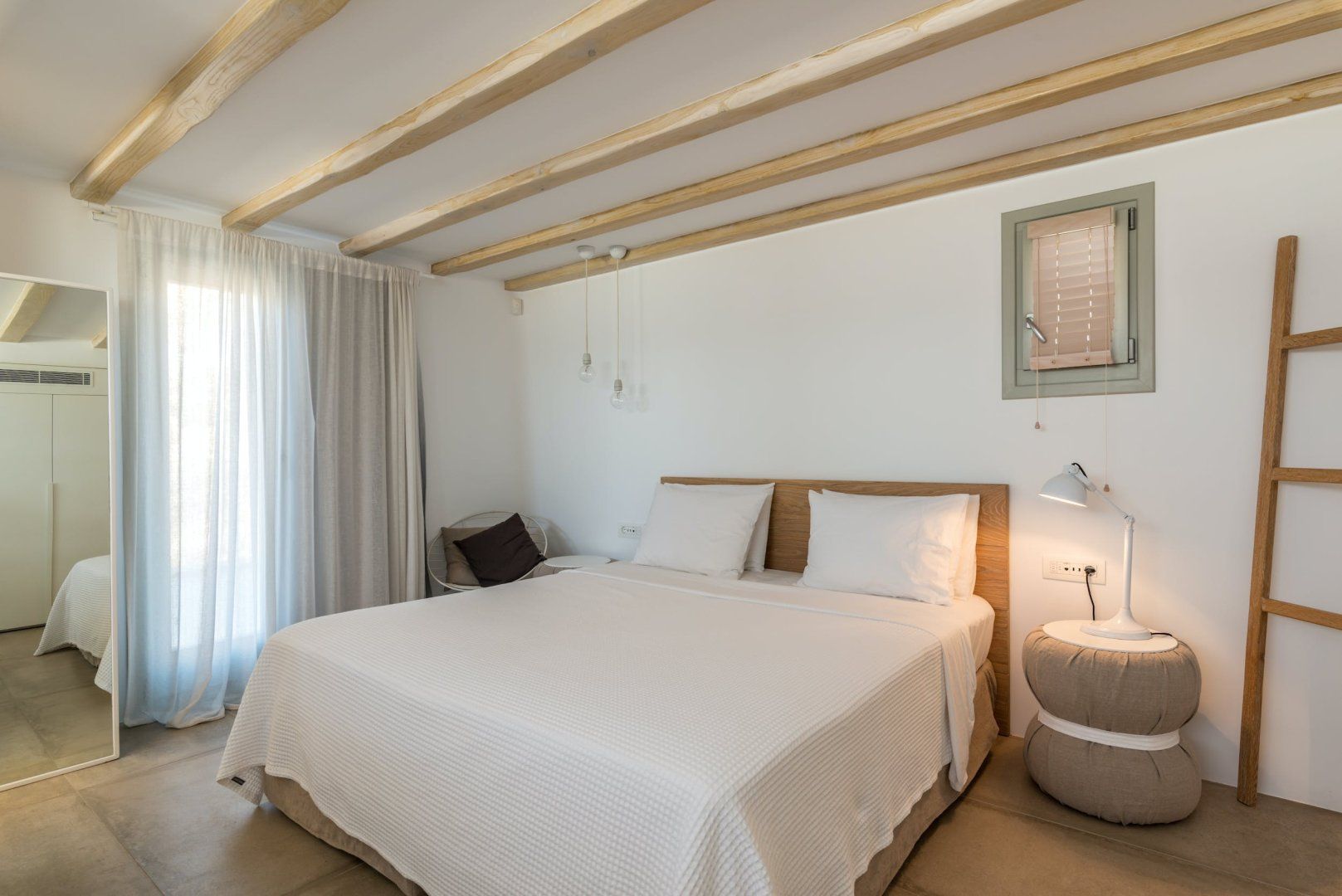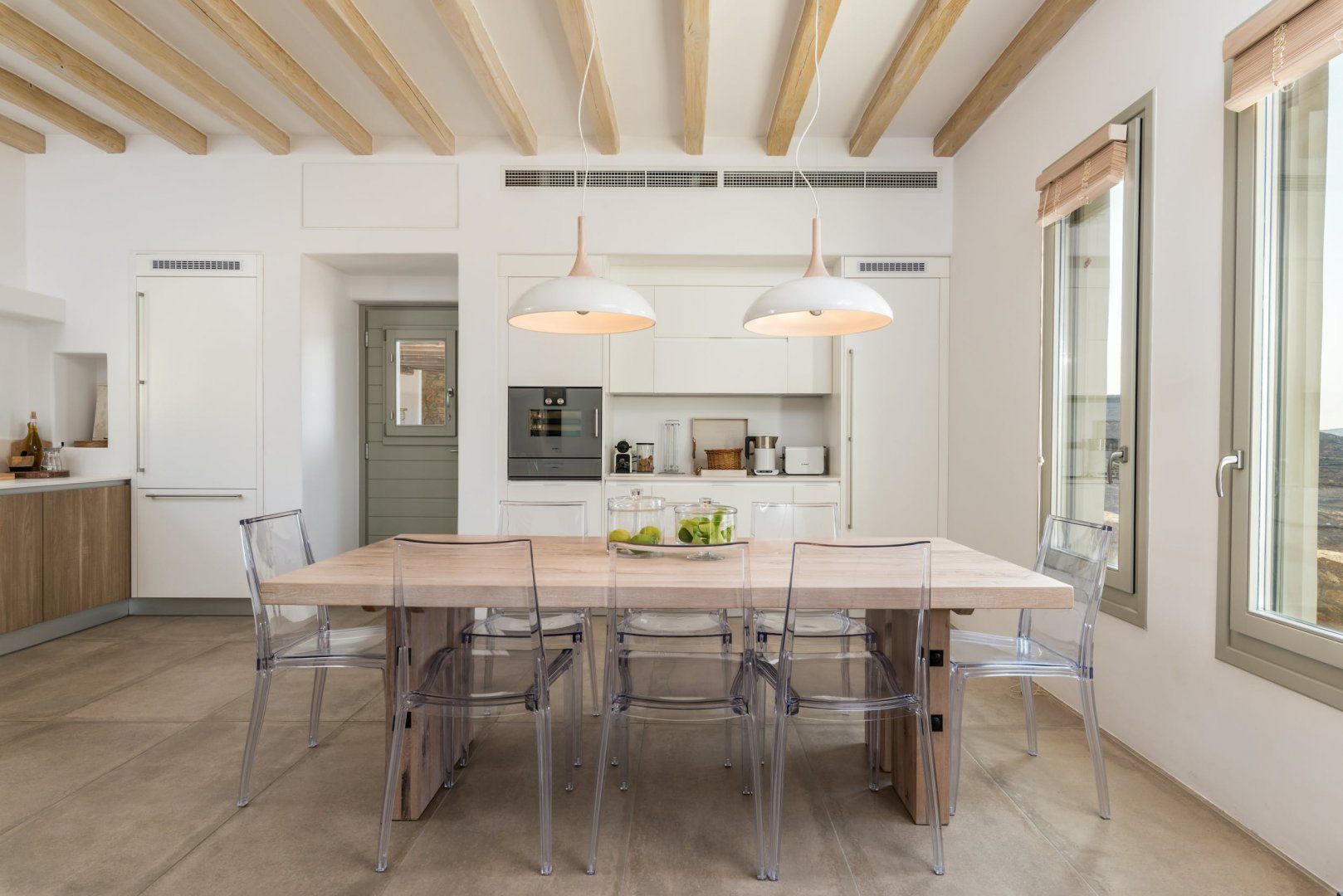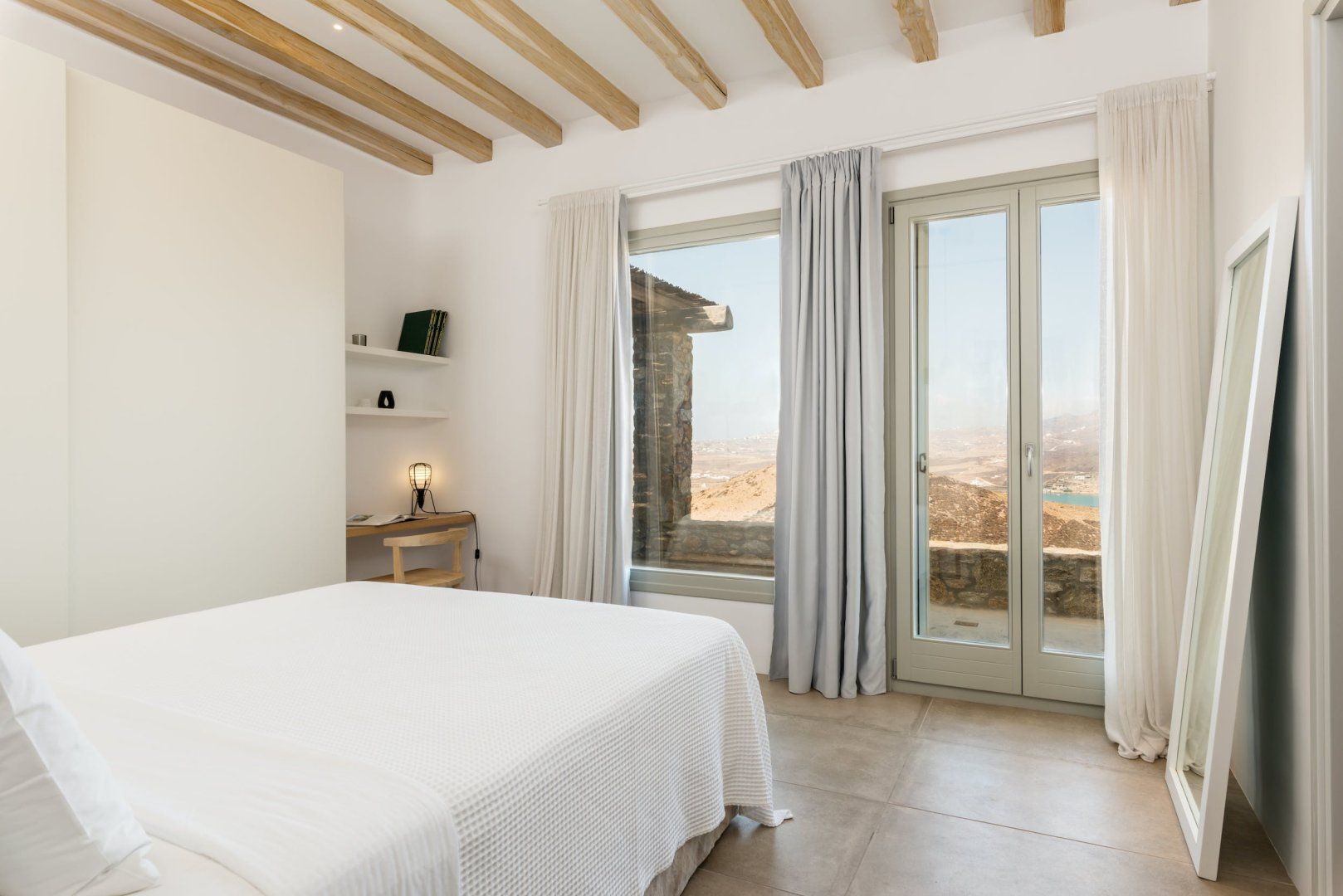 Forget beach clubs, glitzy bars and being seen, this beautiful home is showing us a quieter side of Mykonos. A ten-minute drive from Ftelia beach, the plot is carved into an arid hillside, giving you beautiful views of the Aegean ocean and the town below from every angle. Built in the traditional Cyclades style, the home incorporates white-washed and stone walls with French doors to create big, breathy rooms. A plush L-shaped sofa sits under wooden beams - and with sliding doors across one wall, it may be hard to pay attention to the TV with the stunning vistas in front of you. Arches, rather than doors, connect living areas giving an easy sense of flow in the home, without it feeling too cramped. Beds face towards the sea too, though are split into various outbuildings to give some privacy. Even the gym, with its floor-to-ceiling windows, makes working out a cinch thanks to the background scenes. Step outside to really soak up the panoramas, whether it's in the infinity pool, the plunge pool, or the hot tub.