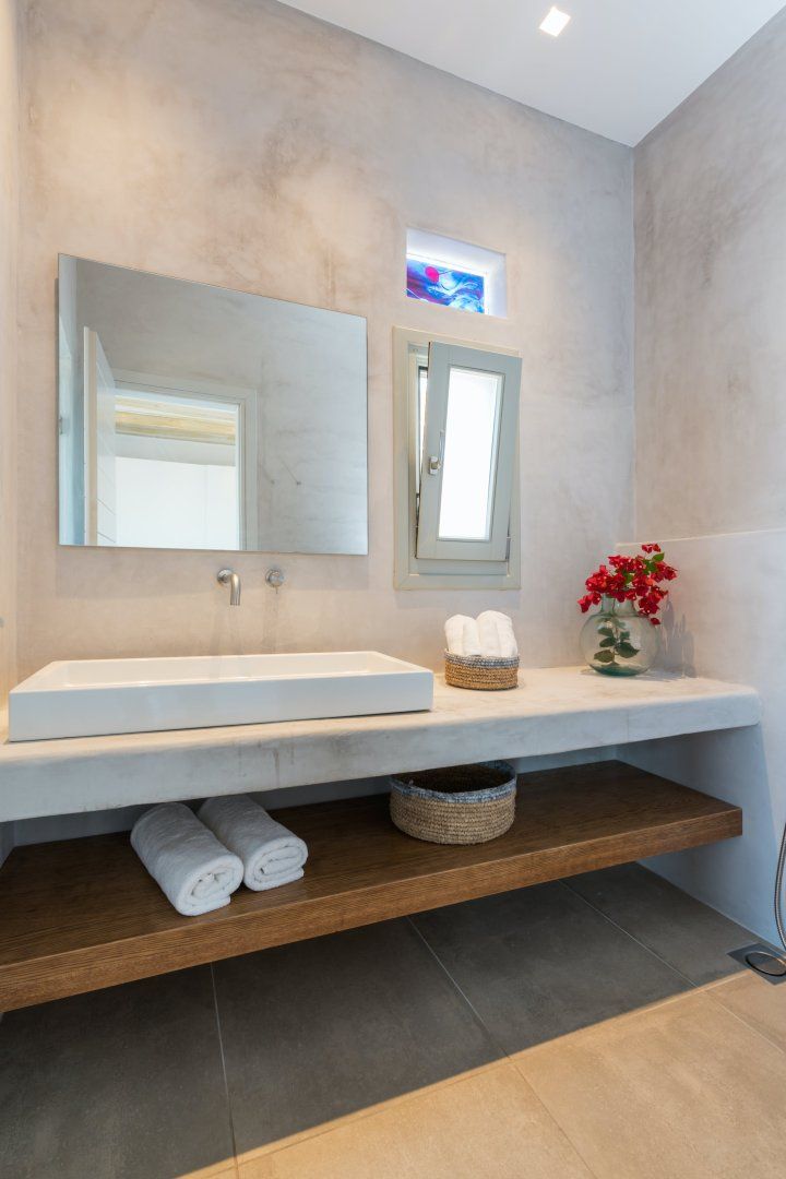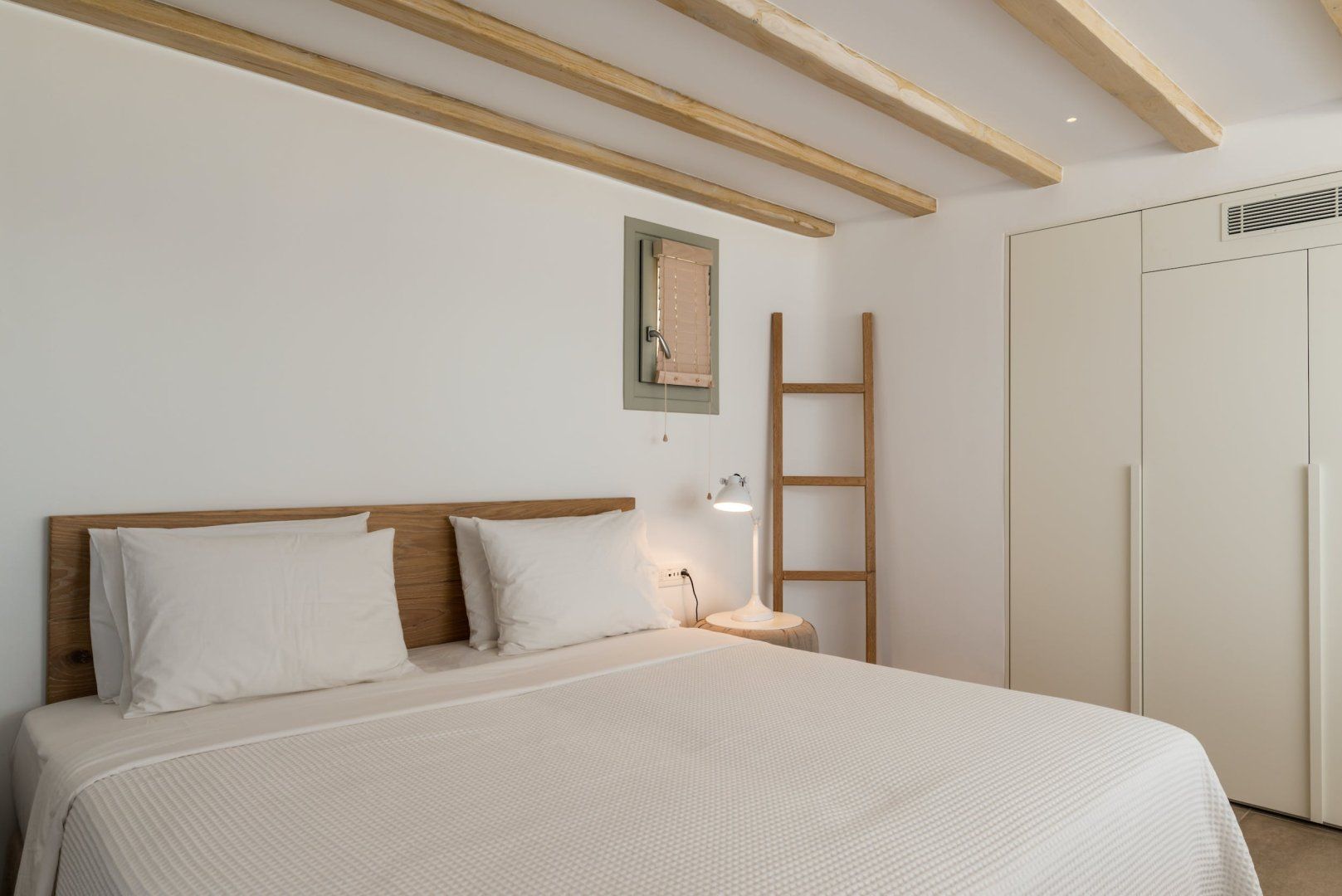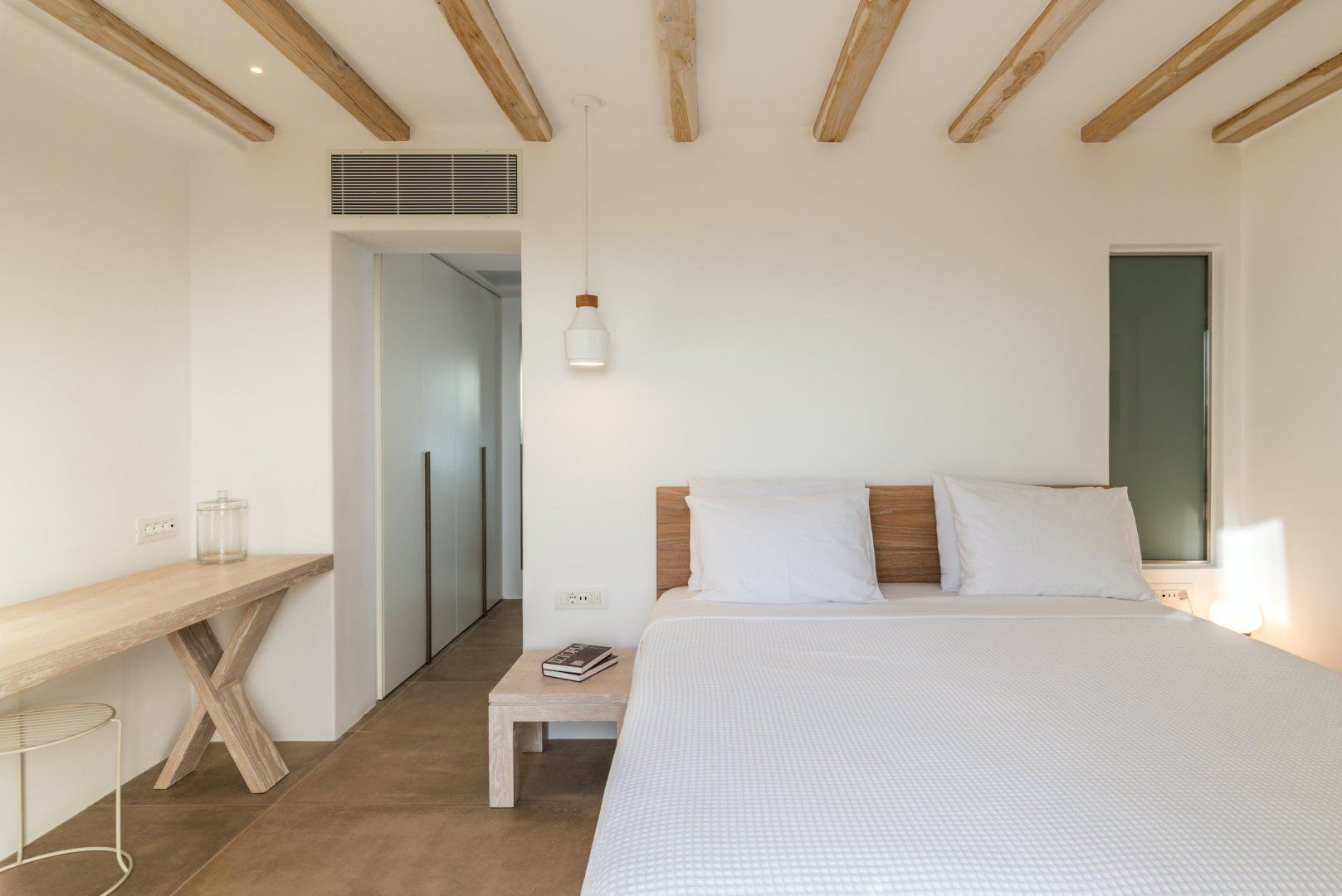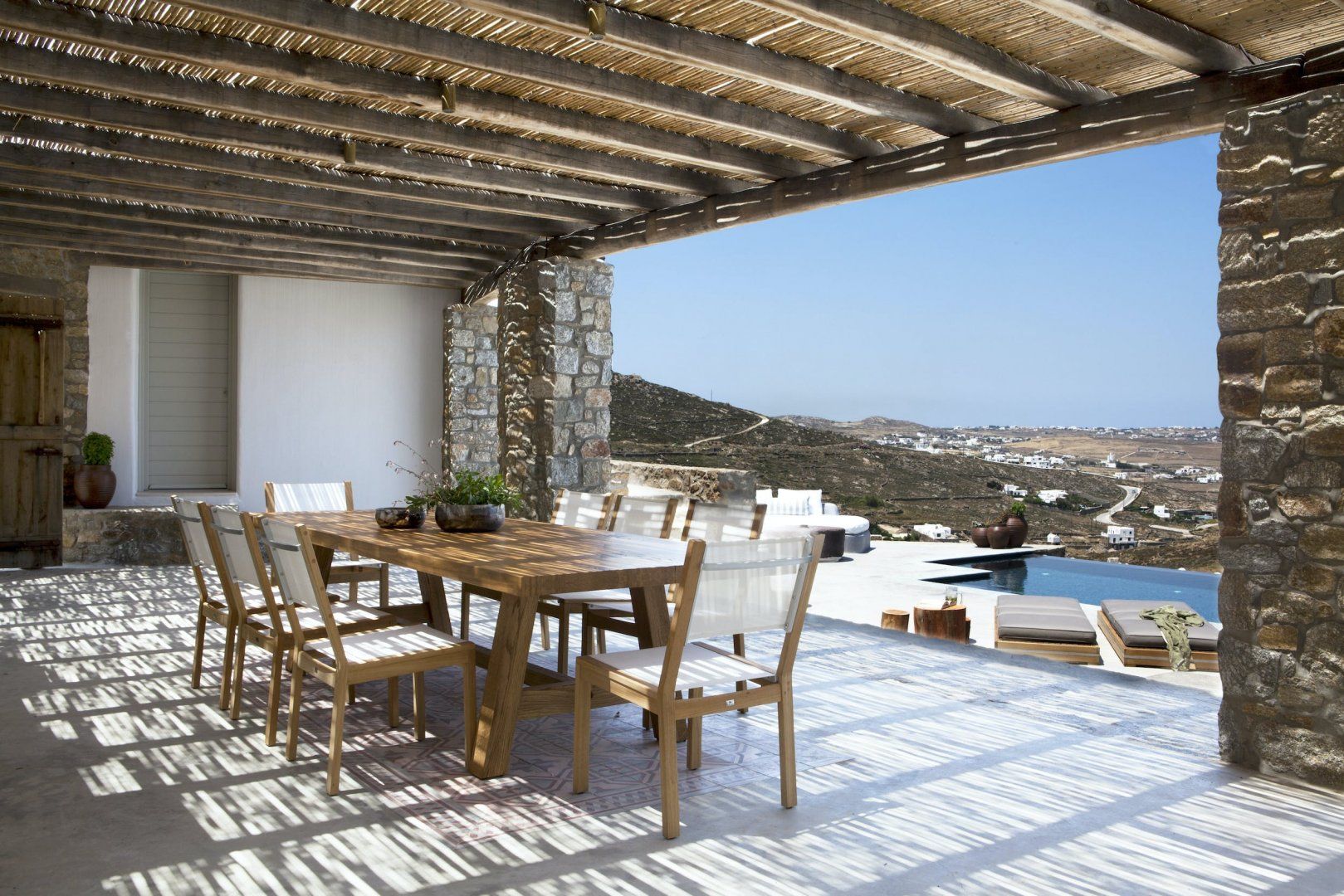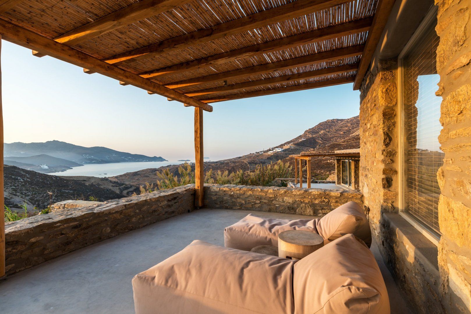 Forget beach clubs, glitzy bars and being seen, this beautiful home is showing us a quieter side of Mykonos. A ten-minute drive from Ftelia beach, the plot is carved into an arid hillside, giving you beautiful views of the Aegean ocean and the town below from every angle. Built in the traditional Cyclades style, the home incorporates white-washed and stone walls with French doors to create big, breathy rooms. A plush L-shaped sofa sits under wooden beams - and with sliding doors across one wall, it may be hard to pay attention to the TV with the stunning vistas in front of you. Arches, rather than doors, connect living areas giving an easy sense of flow in the home, without it feeling too cramped. Beds face towards the sea too, though are split into various outbuildings to give some privacy. Even the gym, with its floor-to-ceiling windows, makes working out a cinch thanks to the background scenes. Step outside to really soak up the panoramas, whether it's in the infinity pool, the plunge pool, or the hot tub.