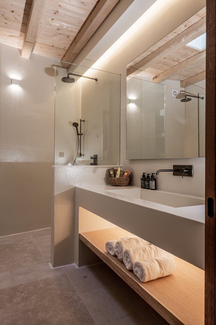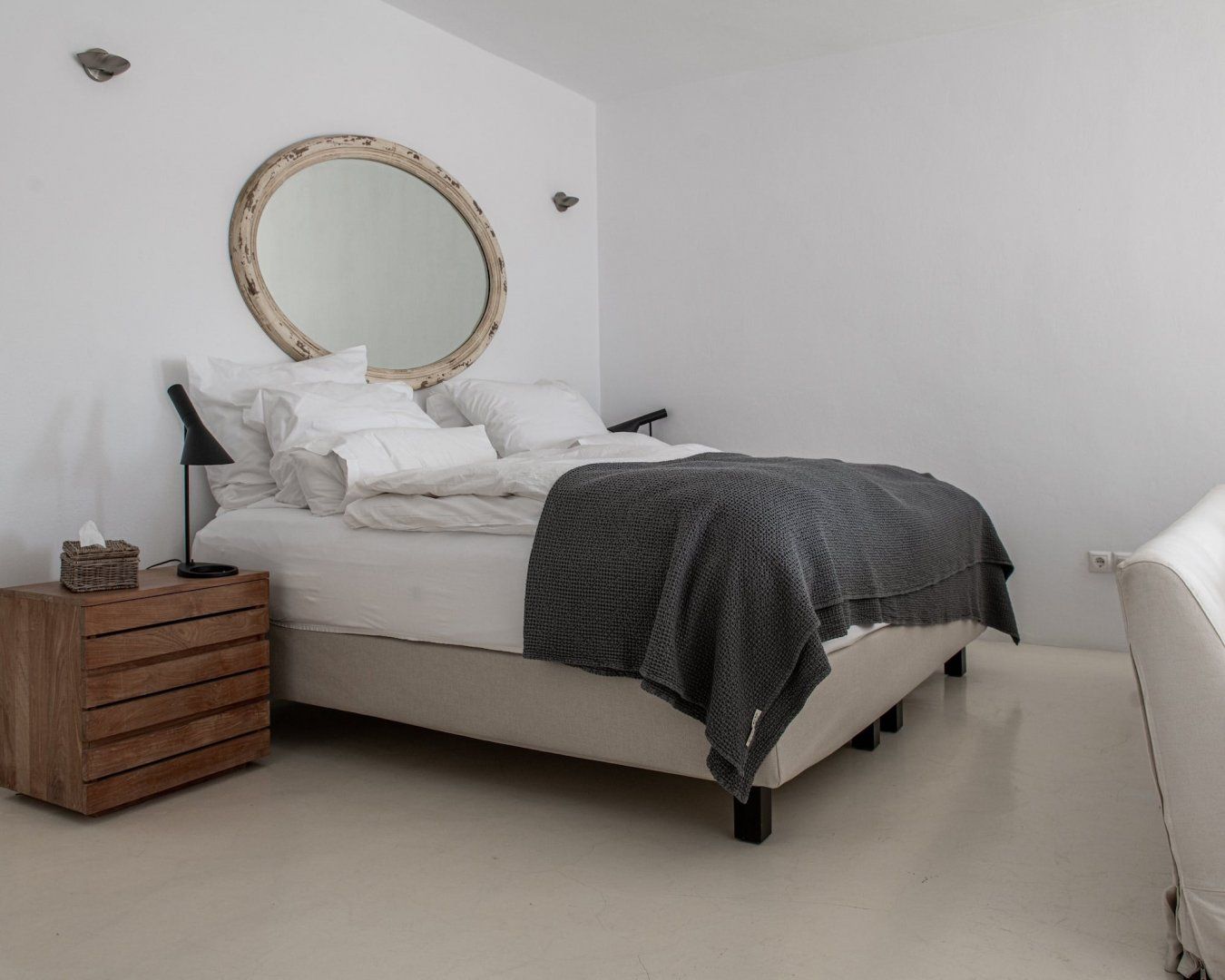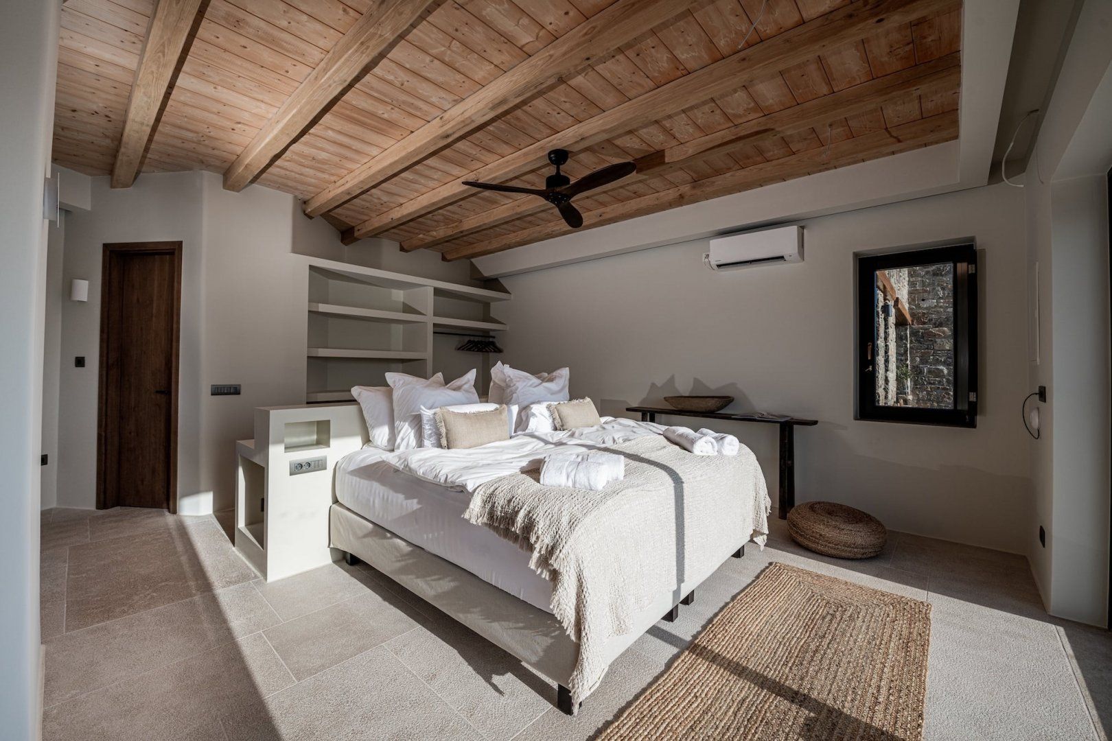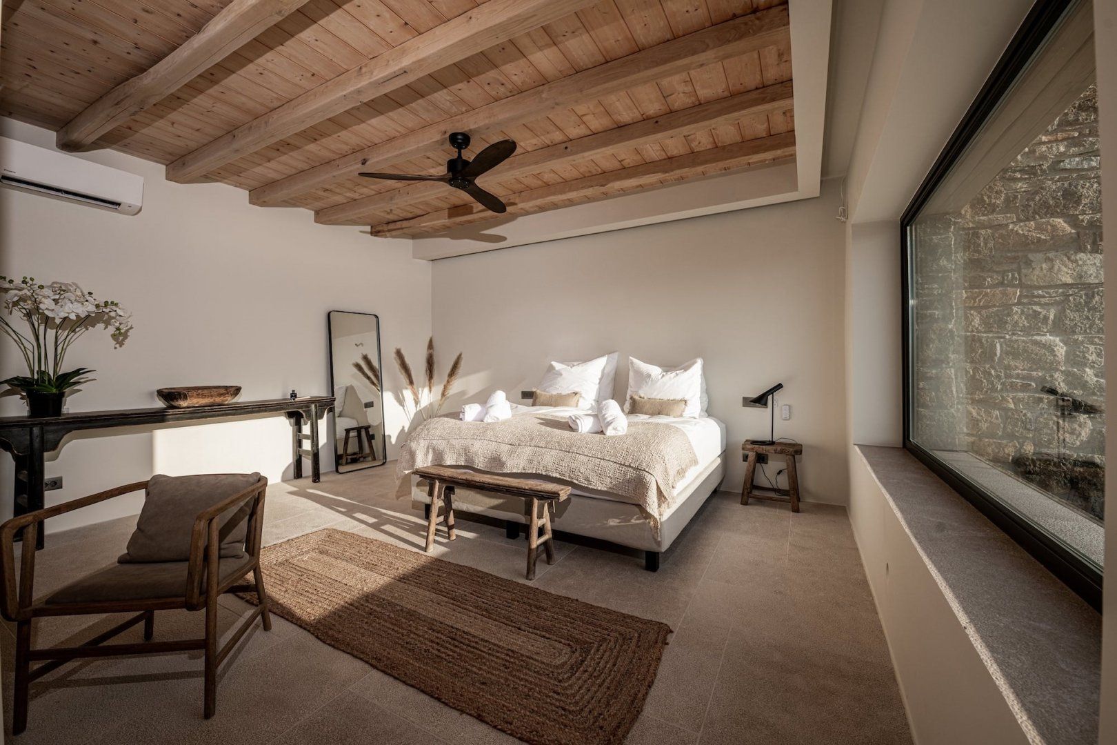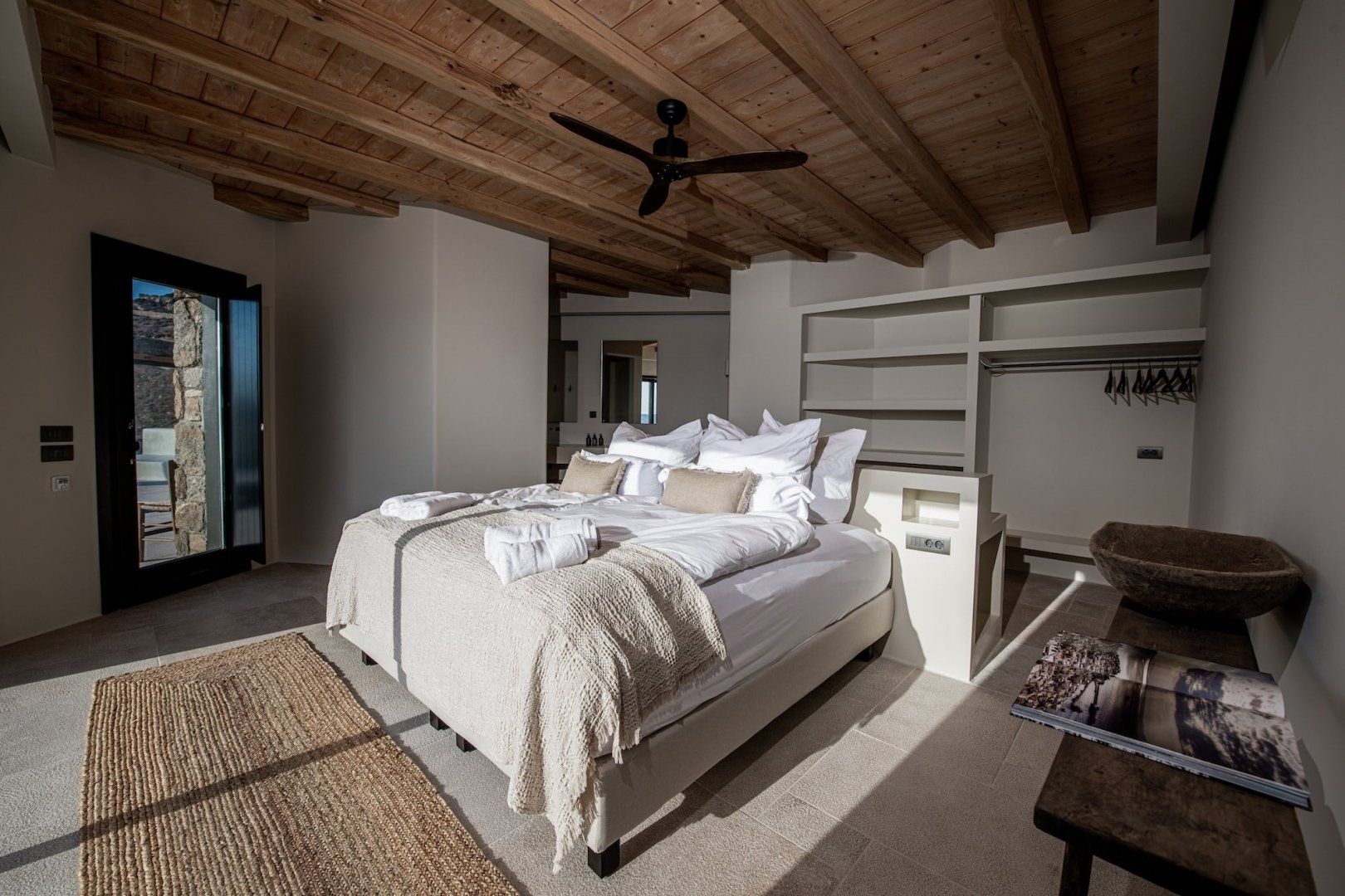 Situated in an eight-acre private estate, it faces the beautiful sandy beaches of Panormos and Agios Sostis. Have a seat by one of the old knarled olive trees or perch on one of the boulders and read a book – this place is designed for complete relaxation. Inside, the white beams add character and the large picture windows frame the sea and landscape vistas perfectly.