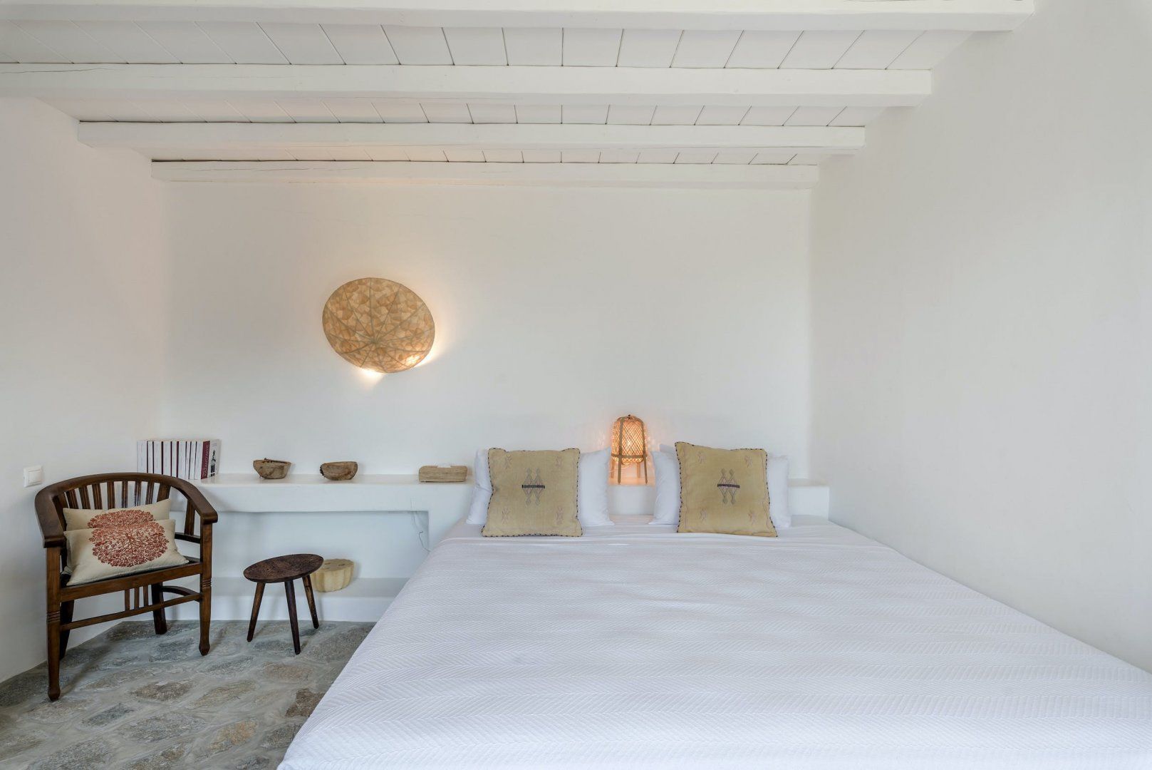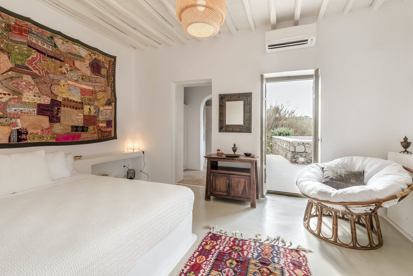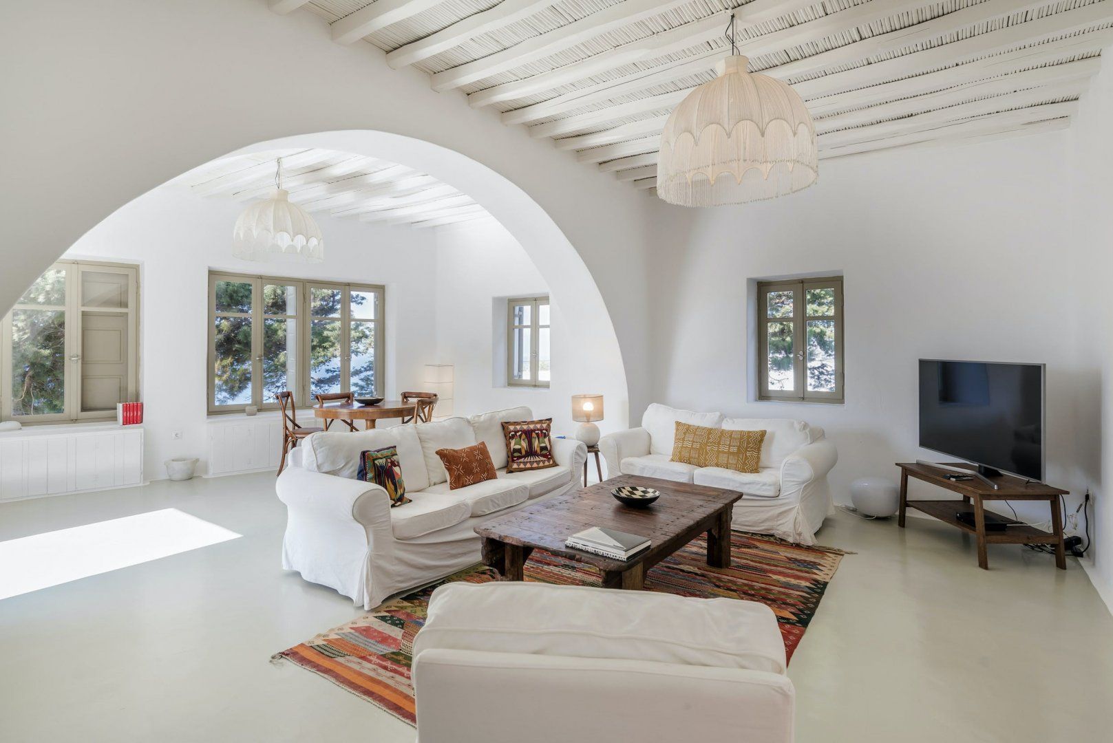 Glistening turquoise water, clean white lines and endless wild greenery; this is what it’s like to be tucked away in a remote part of Greece. This Cycladic villa is perfectly situated to combine the rural tranquility and peace of Mykonos with its famous town. For the interior, think traditional, with whitewashed walls, plus beam and archway ceilings that give way for minimalist, simple wooden furnishings, antique ornaments, and quirky rugs that create a stylish yet homely ambiance. Designed with space and comfort in mind, the home is divided into two separate buildings – the main villa and a guest house – with all bedrooms benefiting from en-suite bathrooms and king-sized beds, so you can slow right down and unwind with ease. Speaking of unwinding, the outside living space is lined by lush trees and greenery, downhill views of the Aegean Sea fit for the Gods, and a crystalline swimming pool. Escape from the midday heat in the cooling chill-out area shaded by a thatched pergola – this spot is ideal for alfresco lunches in the sun. Secluded yet conveniently located, when dinner time arrives you’ll be a short drive away from the delights of Mykonos town, an area famous for its glorious local cuisine, hip bars and authentic sugar-cube buildings.