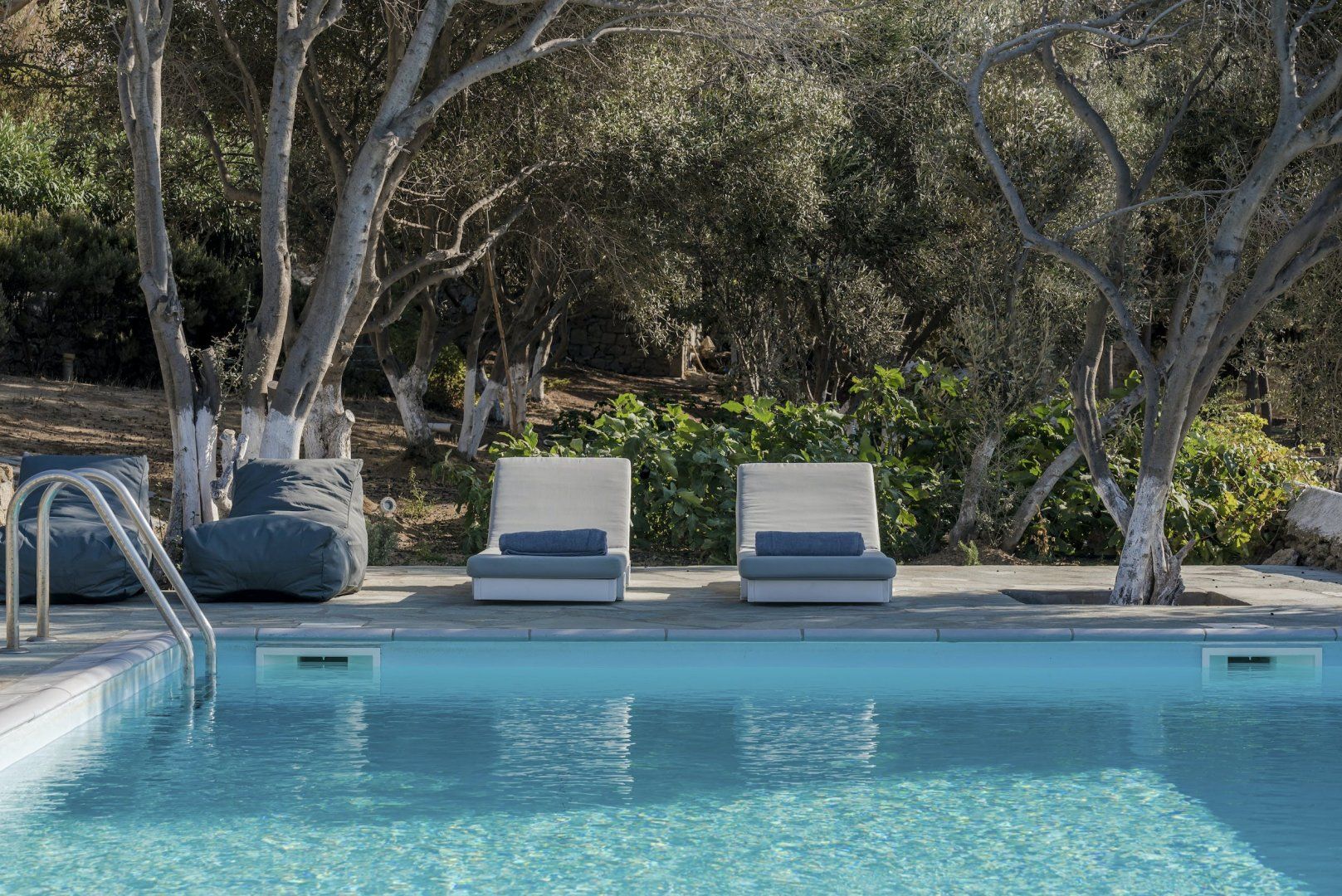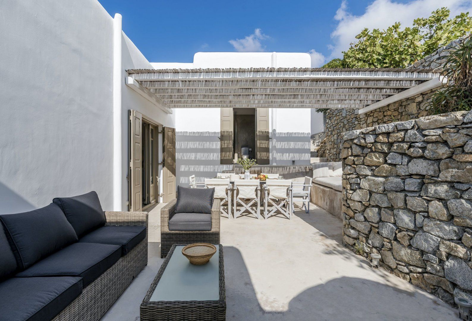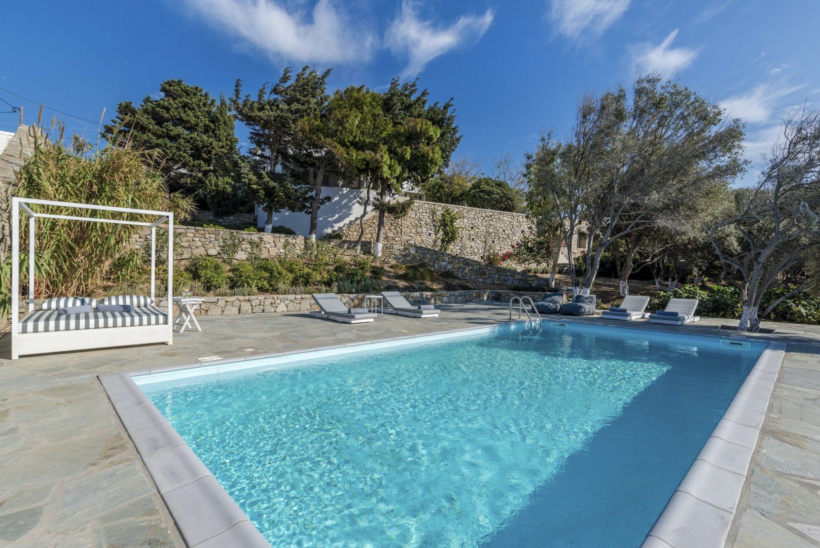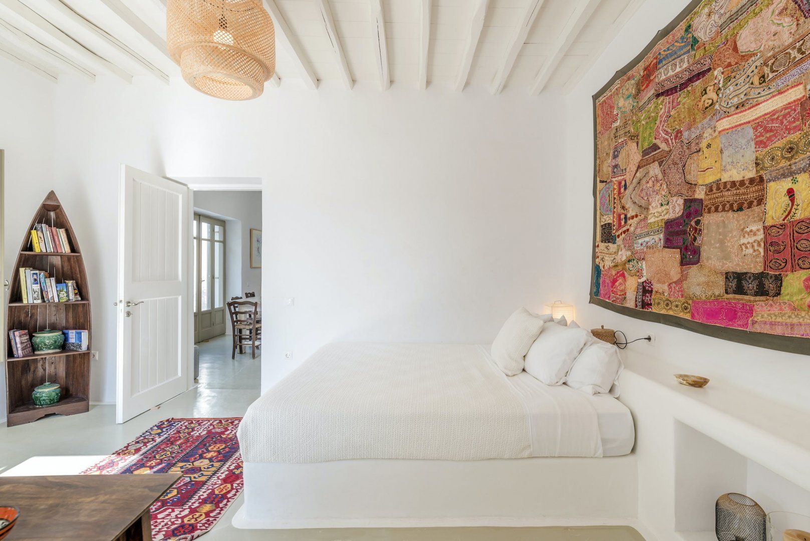 Glistening turquoise water, clean white lines and endless wild greenery; this is what it’s like to be tucked away in a remote part of Greece. This Cycladic villa is perfectly situated to combine the rural tranquility and peace of Mykonos with its famous town. For the interior, think traditional, with whitewashed walls, plus beam and archway ceilings that give way for minimalist, simple wooden furnishings, antique ornaments, and quirky rugs that create a stylish yet homely ambiance. Designed with space and comfort in mind, the home is divided into two separate buildings – the main villa and a guest house – with all bedrooms benefiting from en-suite bathrooms and king-sized beds, so you can slow right down and unwind with ease. Speaking of unwinding, the outside living space is lined by lush trees and greenery, downhill views of the Aegean Sea fit for the Gods, and a crystalline swimming pool. Escape from the midday heat in the cooling chill-out area shaded by a thatched pergola – this spot is ideal for alfresco lunches in the sun. Secluded yet conveniently located, when dinner time arrives you’ll be a short drive away from the delights of Mykonos town, an area famous for its glorious local cuisine, hip bars and authentic sugar-cube buildings.
