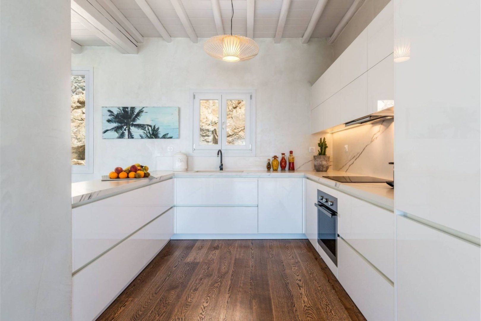 Located on the outskirts of Mykonos Town, just a fifteen-minute stroll to the town hall and Old Port, this home offers quiet surroundings while being within easy commuting distance of all necessary amenities. The home’s design, with exposed stonework, wooden beams, and classic, Grecian white walls perfectly encapsulate its natural surroundings, while the interiors are simply refreshing, with splashes of bright white, ample space and furnishings you can just sink into.