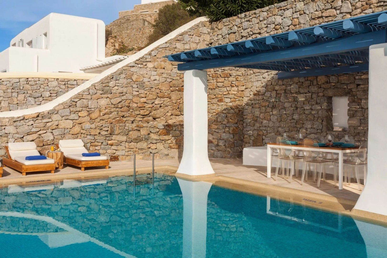 Location-wise, the sea is just a short stroll down the craggy cliffs, while popular beaches like Ornos and Korfos are ten minutes by car. Lively Mykonos Town is also reachable in ten – perfect if you fancy delicious restaurants, high-end boutiques and vibrant nightlife.