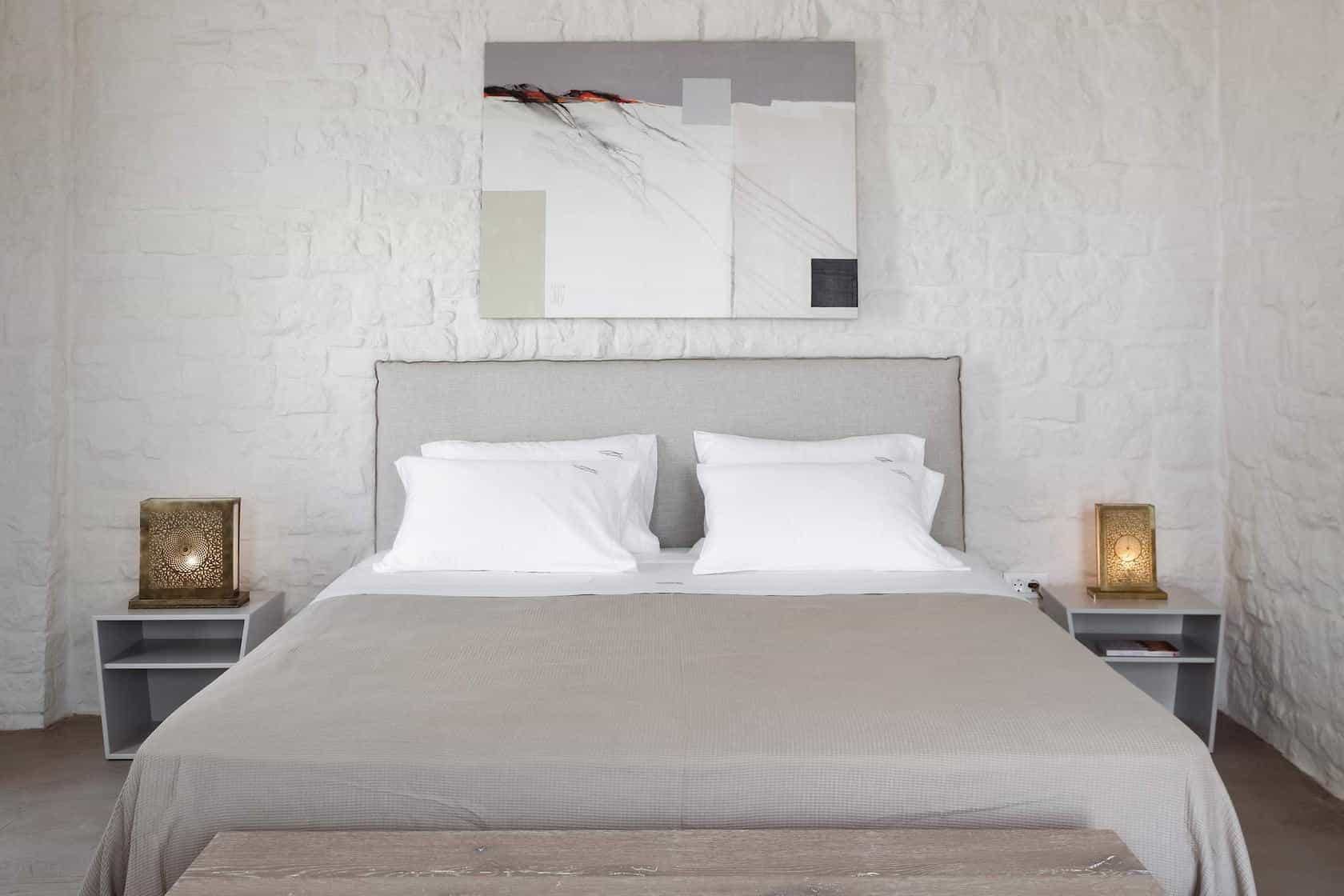 The entertaining spaces are idyllic for the whole group to spend time together – soak up the sun on the sleek loungers, plunge into the shimmering pool or gather on the sofas under the pergola – don’t forget to serve up some margaritas and hit play on the sound system. There are also opportunities for privacy here – dreamy minimalist bedrooms with resort-like ensuites, plush living areas, and secluded nesting spots under the shade of the beams. After a day poolside and now completely sunkissed, head to your outdoor dining room in the casita for a Greek feast prepared by a private chef. And as the golden sky turns inky blue, head to the outdoor lounge to sip sundowners and socialise.