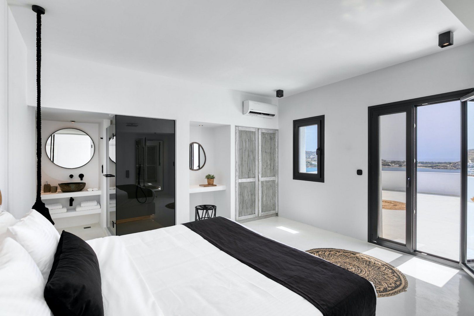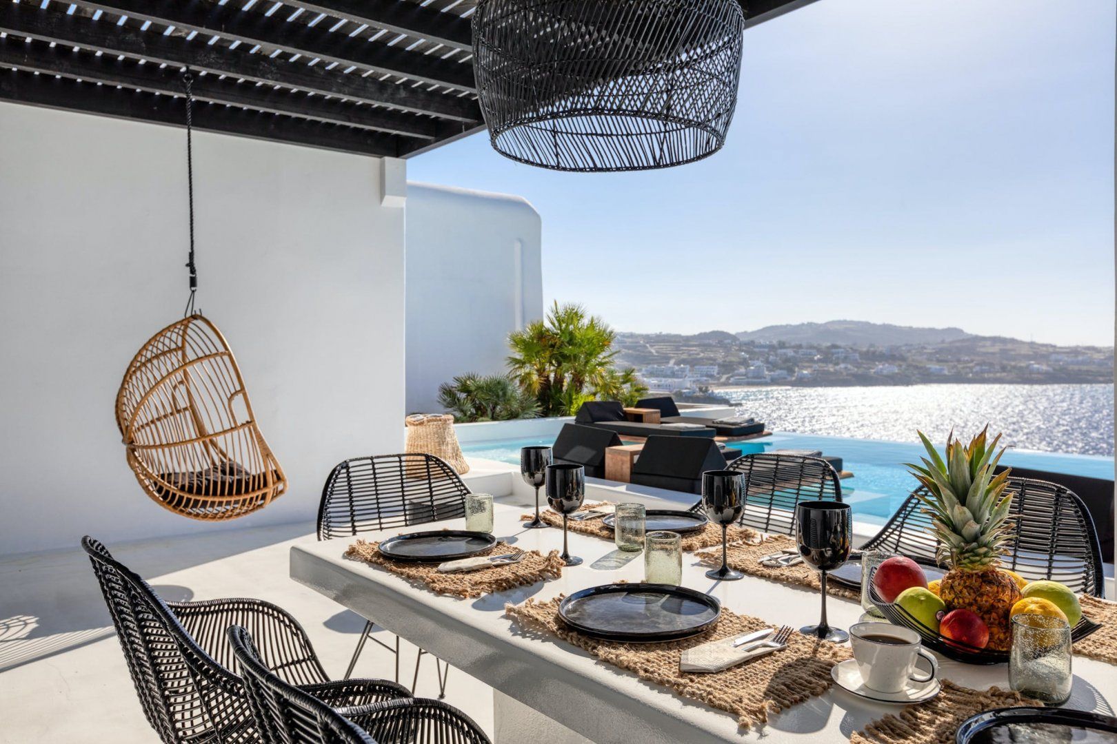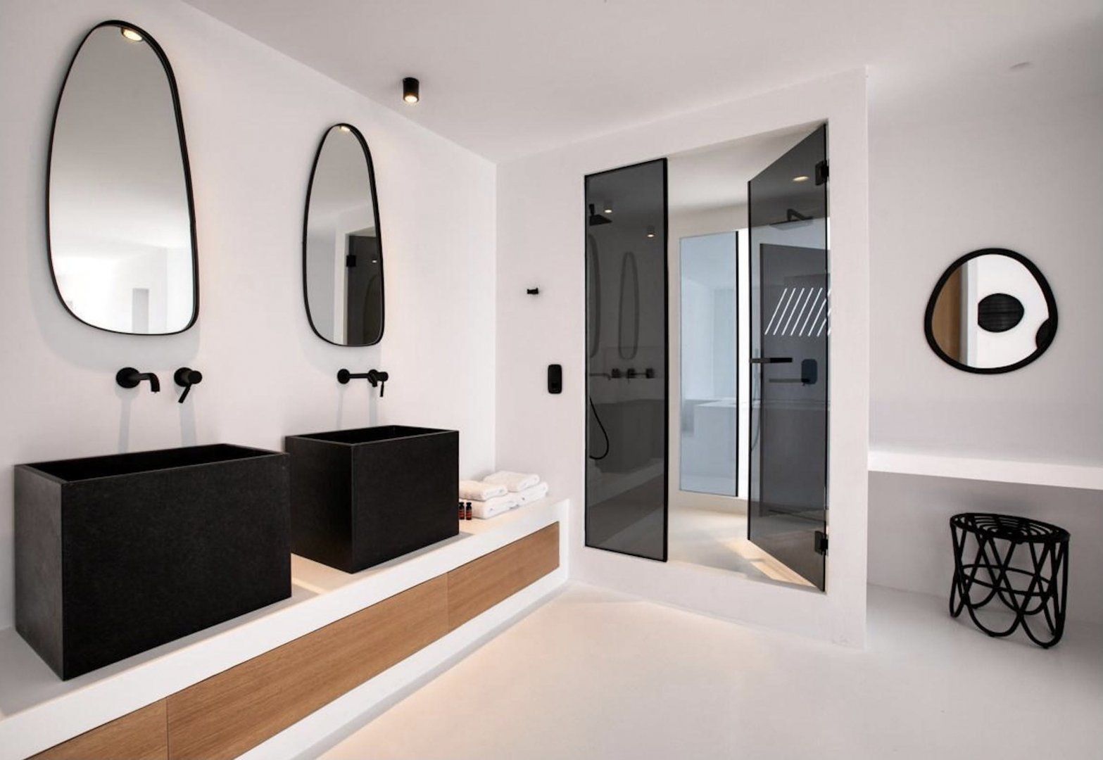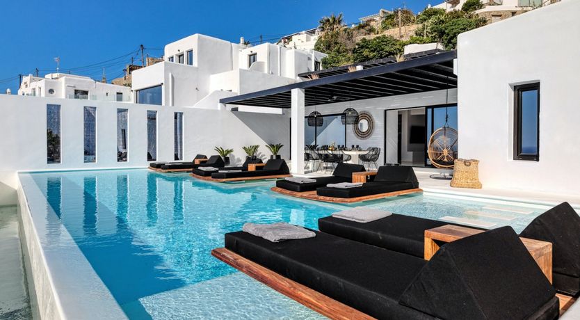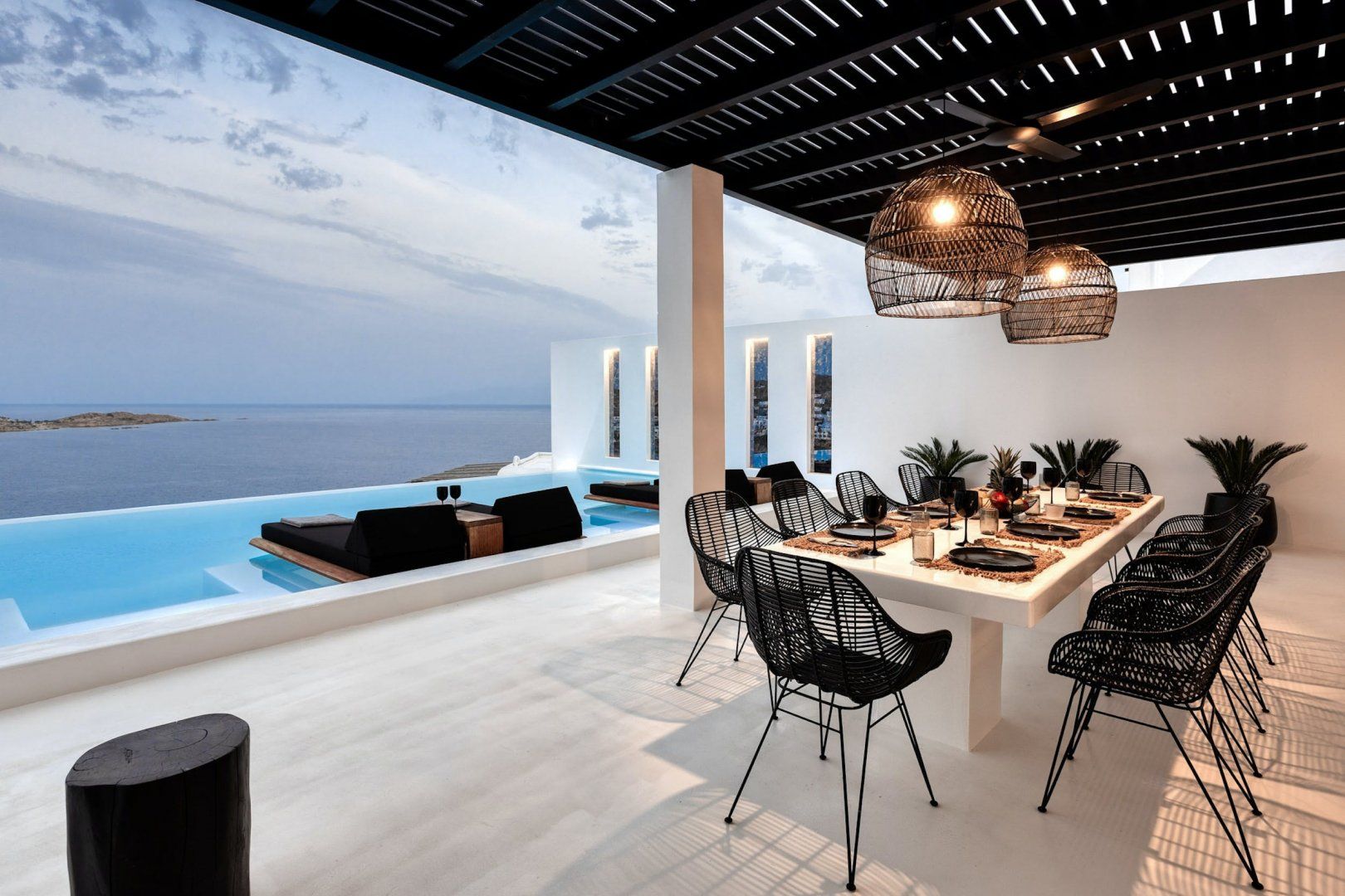 A Poseidon’s palace, right on the sea’s edge, this villa’s panoramic views are fit for the gods. You’re spoilt for choice when it comes to places to relax with luxurious lounge areas, multiple jacuzzis, and an incredible infinity pool, even your own private walkway down to the famous Psarou Beach. Each and every guest is made to feel special, with en-suite, king-sized bedrooms for all, but the master edges it with its private terrace and hot tub access. In the sleek black and white living area, sweeping glass windows take you out onto a grand terrace, where an extensive dining table sits in the shade of the pergola, overlooking the pool. To bask in that Mediterranean sunshine, loungers sit like mini islands on the pool’s surface, surrounded by turquoise water. An upstairs terrace offers a corner sofa and viewpoints of an even higher standard. Stylishly minimalist in its monochrome, open-plan décor, this home most certainly maximises its unrivalled location perched on Mykonos’ coast.