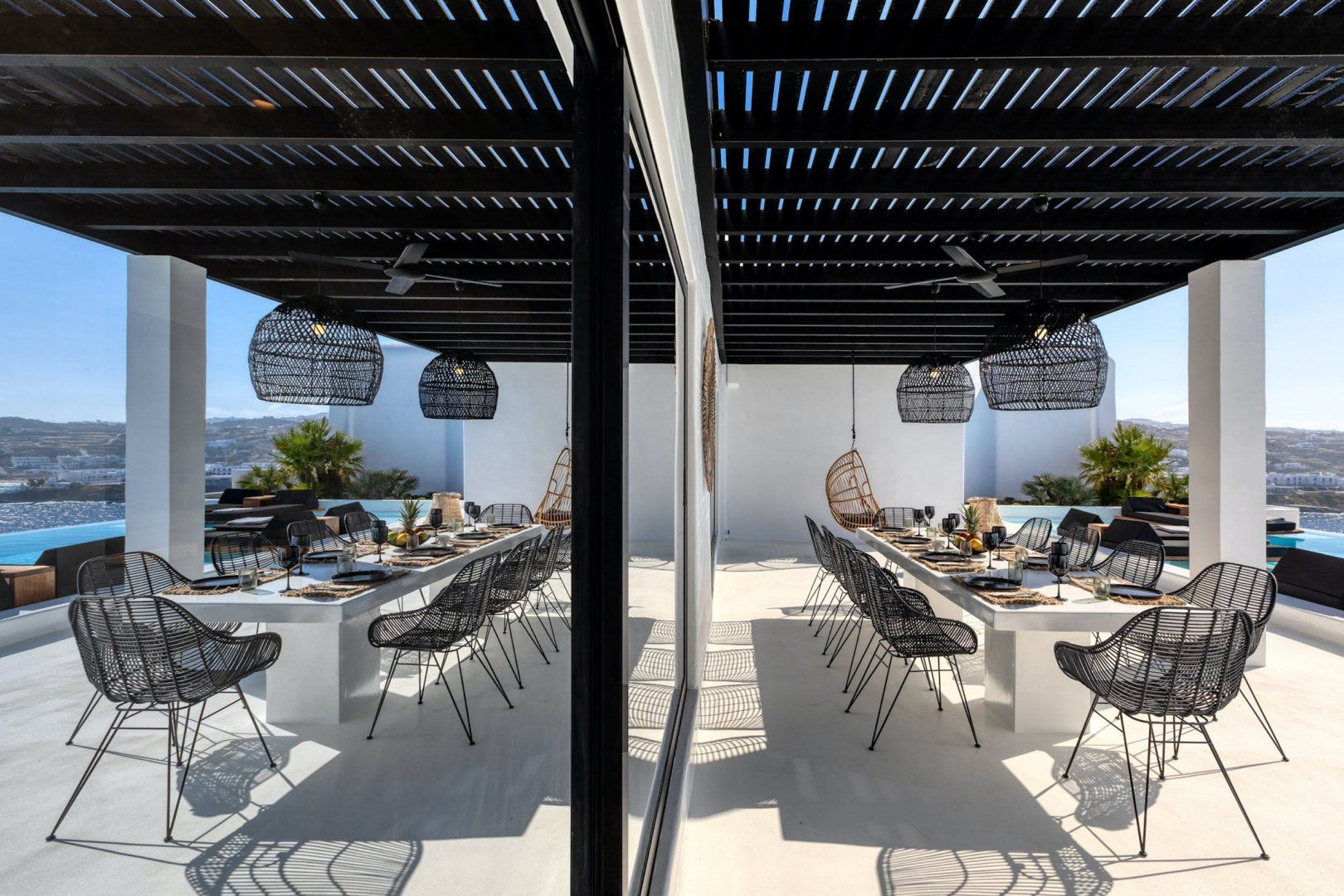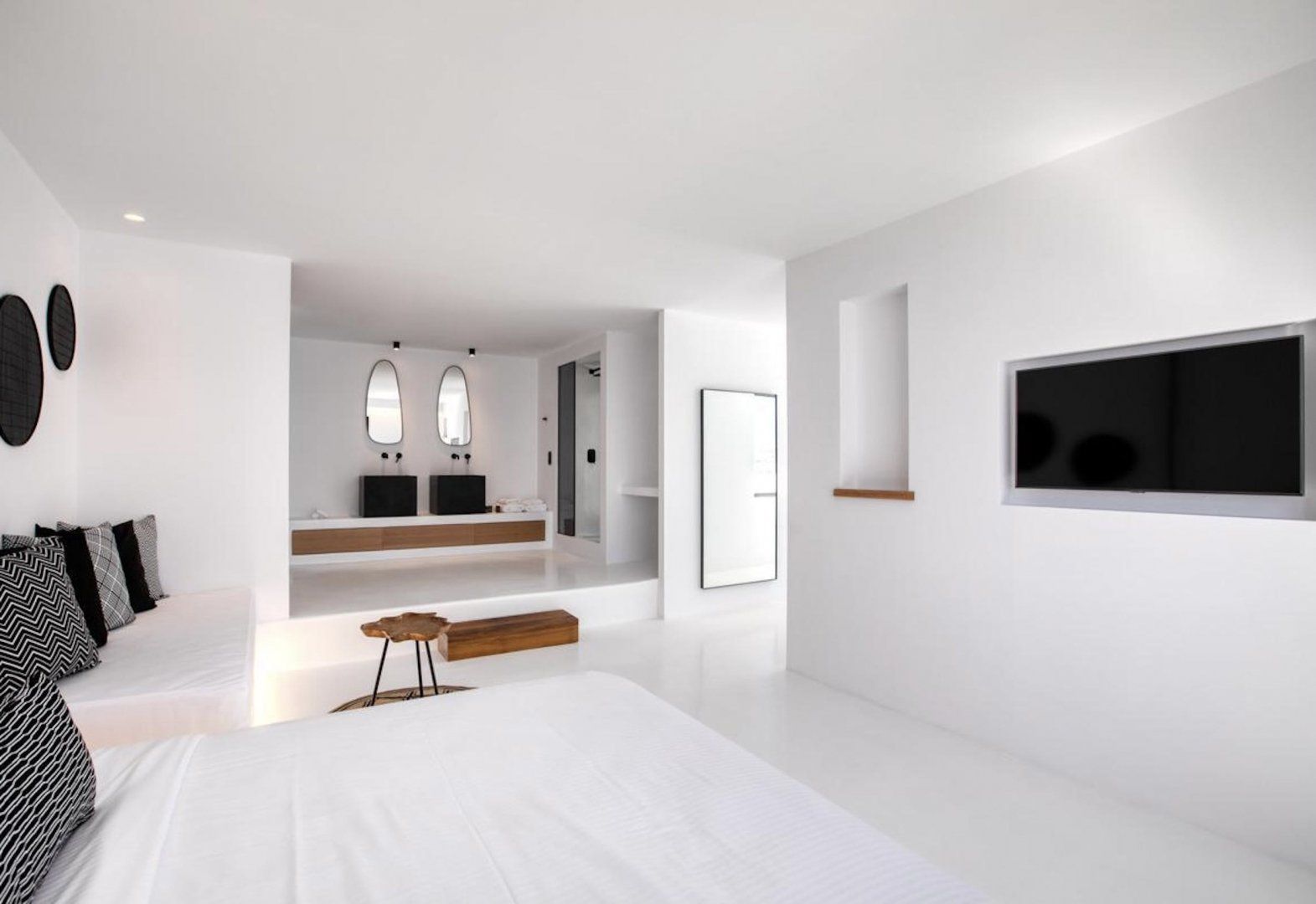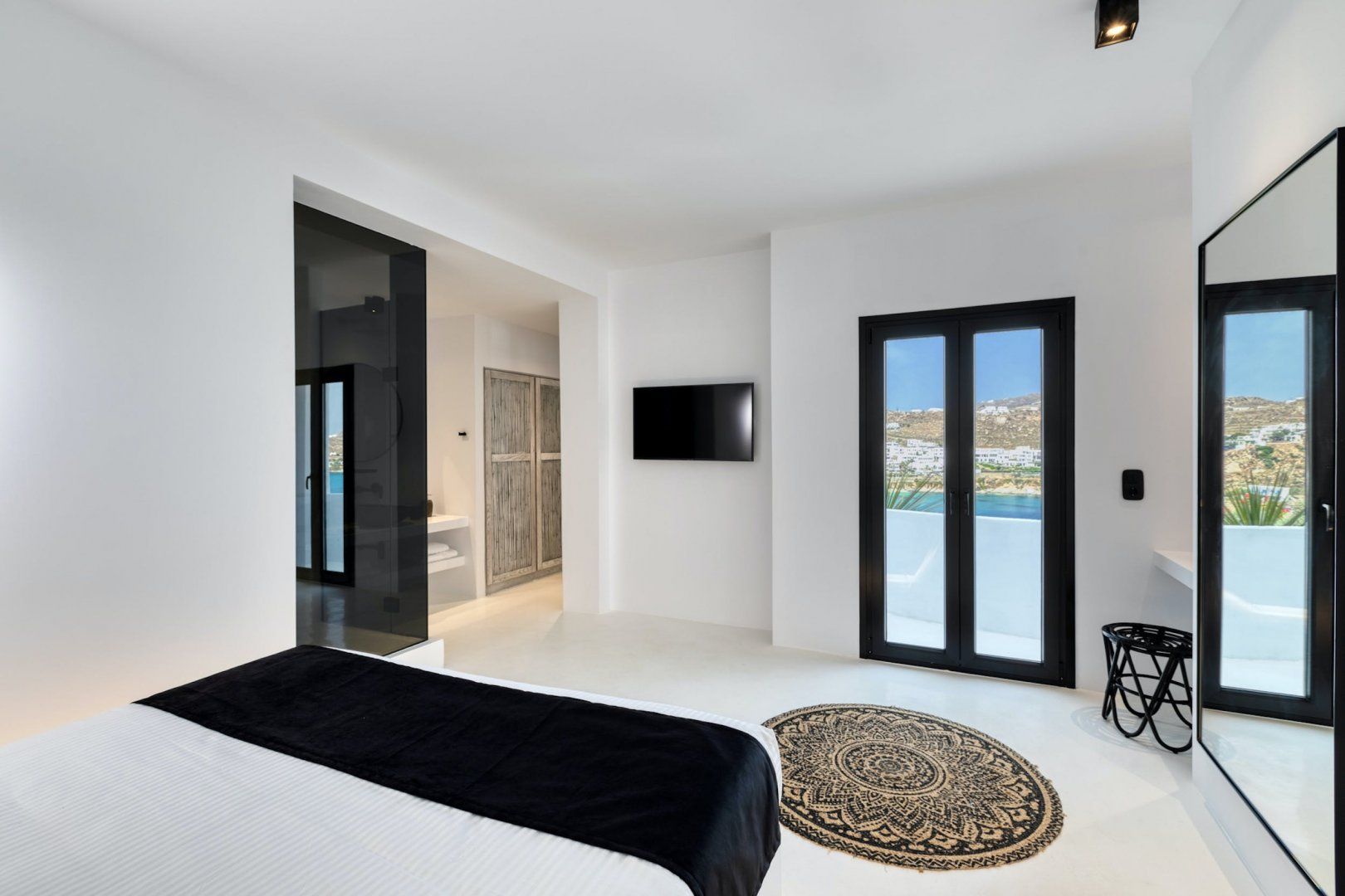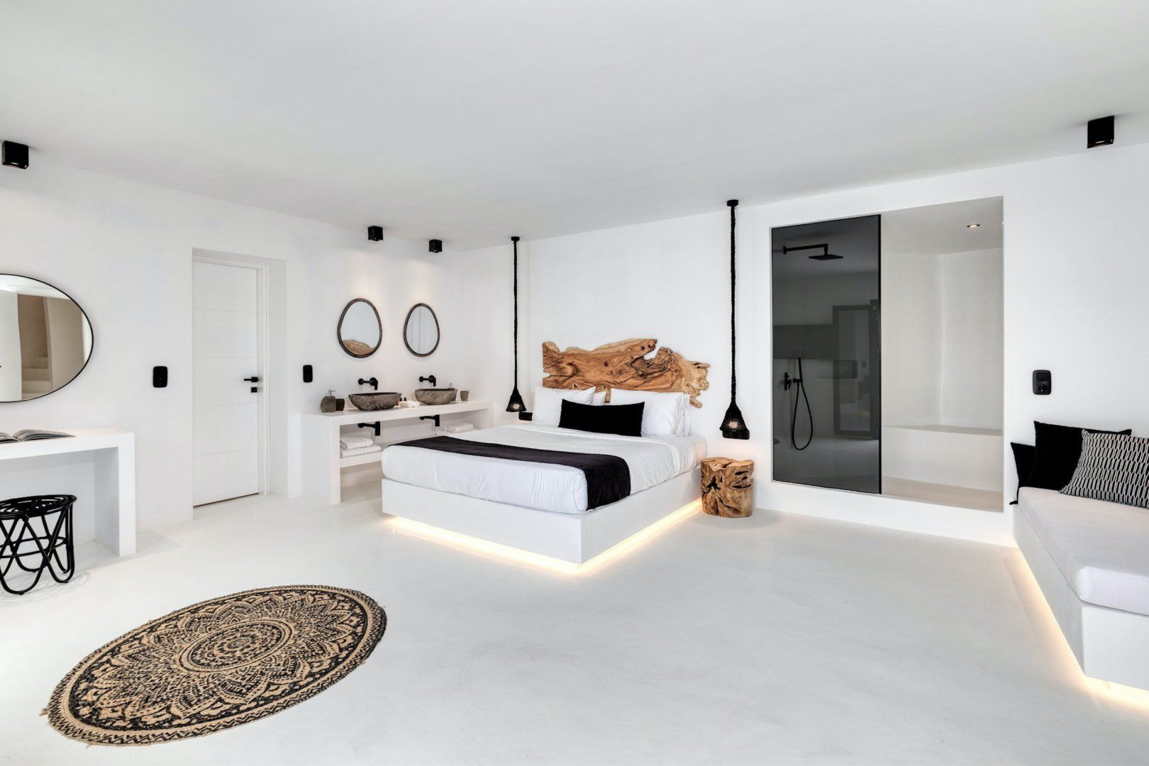 A Poseidon’s palace, right on the sea’s edge, this villa’s panoramic views are fit for the gods. You’re spoilt for choice when it comes to places to relax with luxurious lounge areas, multiple jacuzzis, and an incredible infinity pool, even your own private walkway down to the famous Psarou Beach. Each and every guest is made to feel special, with en-suite, king-sized bedrooms for all, but the master edges it with its private terrace and hot tub access. In the sleek black and white living area, sweeping glass windows take you out onto a grand terrace, where an extensive dining table sits in the shade of the pergola, overlooking the pool. To bask in that Mediterranean sunshine, loungers sit like mini islands on the pool’s surface, surrounded by turquoise water. An upstairs terrace offers a corner sofa and viewpoints of an even higher standard. Stylishly minimalist in its monochrome, open-plan décor, this home most certainly maximises its unrivalled location perched on Mykonos’ coast.
