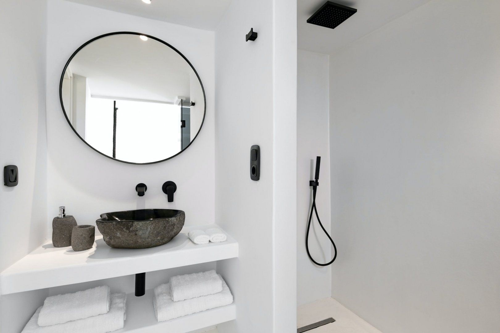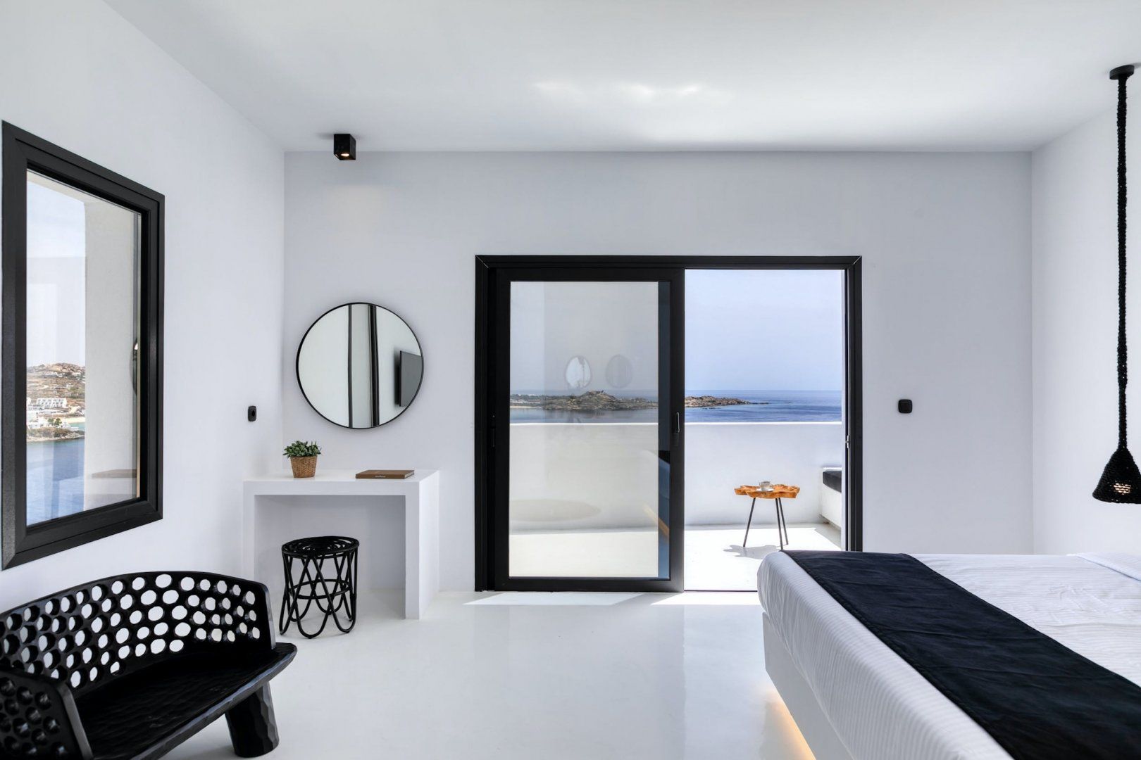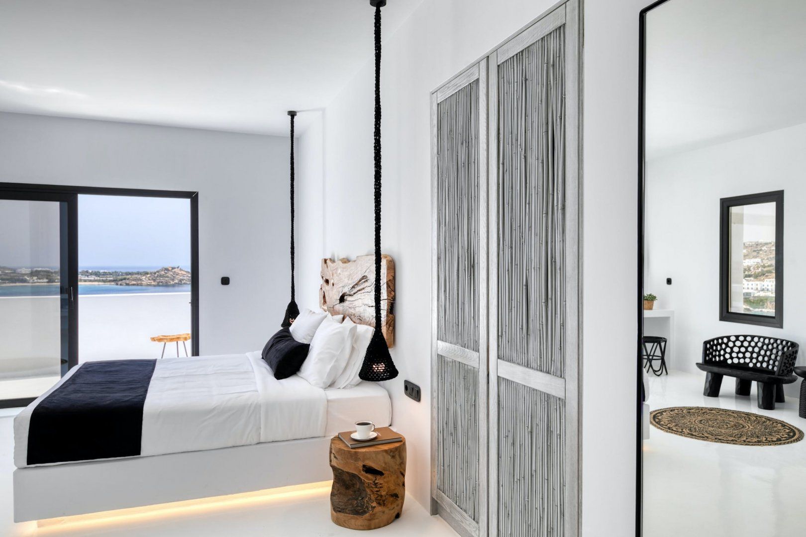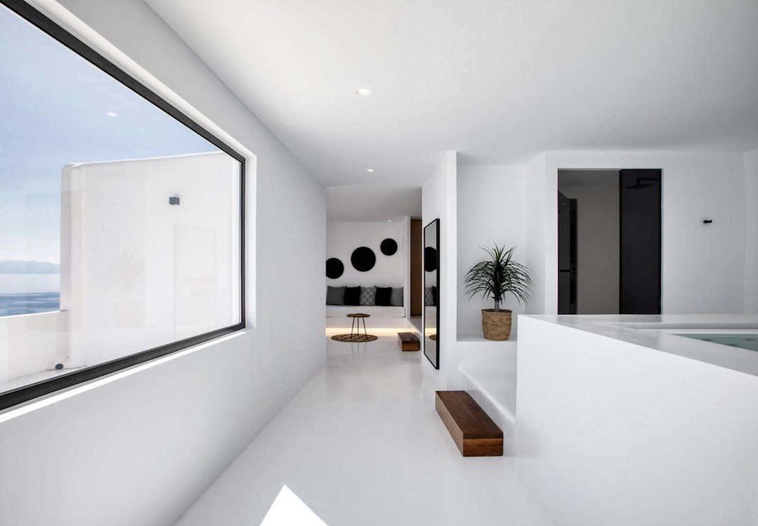 A Poseidon’s palace, right on the sea’s edge, this villa’s panoramic views are fit for the gods. You’re spoilt for choice when it comes to places to relax with luxurious lounge areas, multiple jacuzzis, and an incredible infinity pool, even your own private walkway down to the famous Psarou Beach. Each and every guest is made to feel special, with en-suite, king-sized bedrooms for all, but the master edges it with its private terrace and hot tub access. In the sleek black and white living area, sweeping glass windows take you out onto a grand terrace, where an extensive dining table sits in the shade of the pergola, overlooking the pool. To bask in that Mediterranean sunshine, loungers sit like mini islands on the pool’s surface, surrounded by turquoise water. An upstairs terrace offers a corner sofa and viewpoints of an even higher standard. Stylishly minimalist in its monochrome, open-plan décor, this home most certainly maximises its unrivalled location perched on Mykonos’ coast.