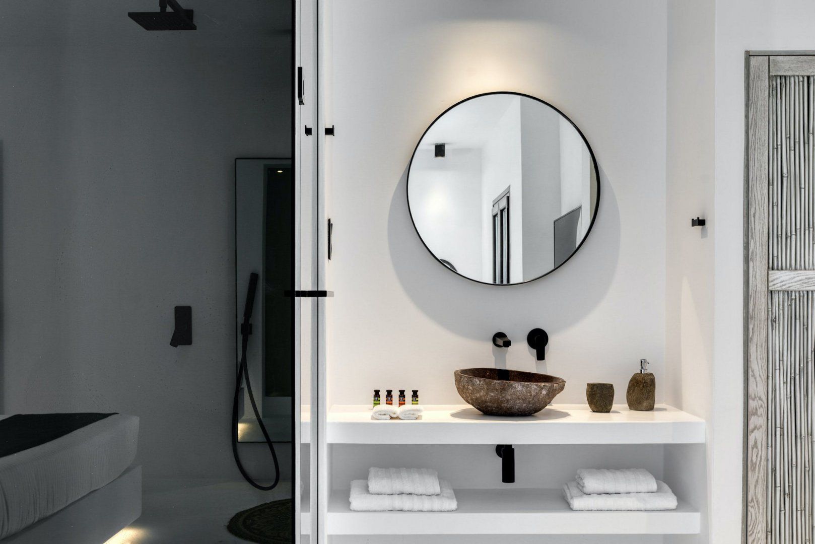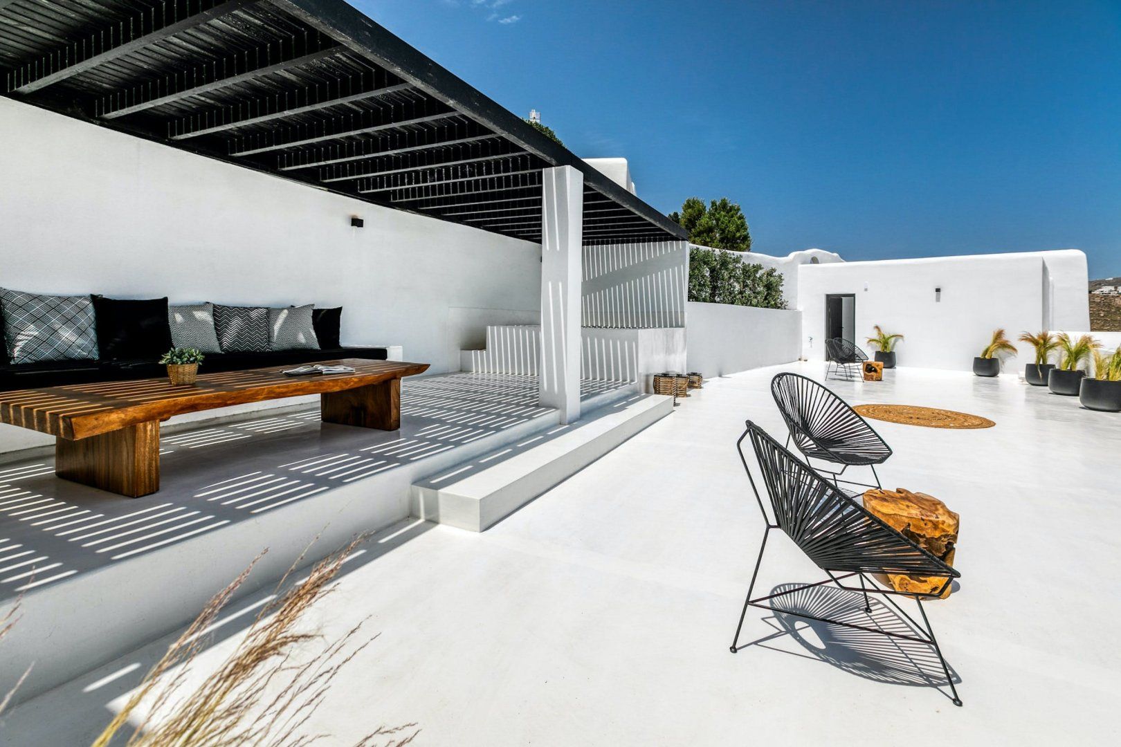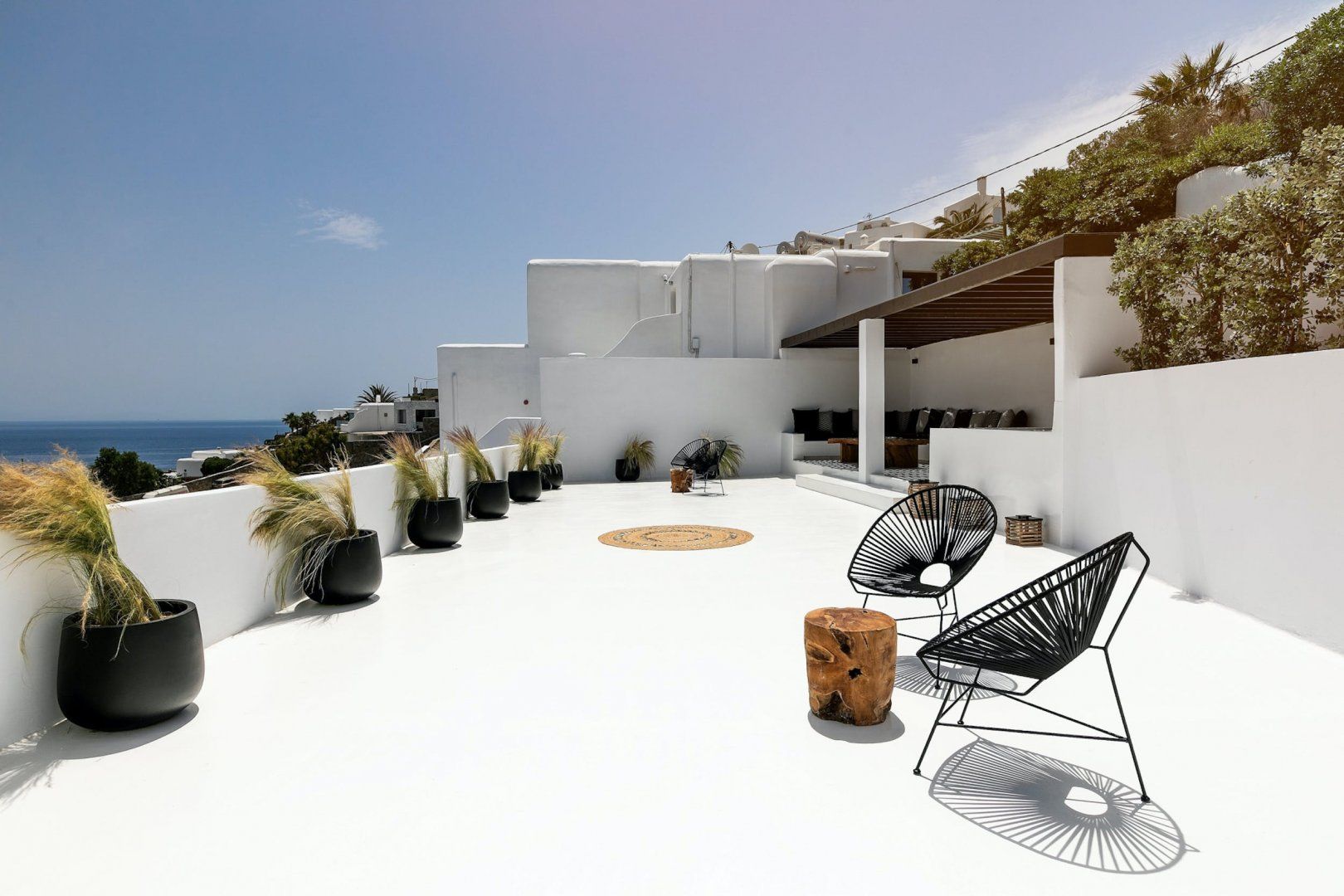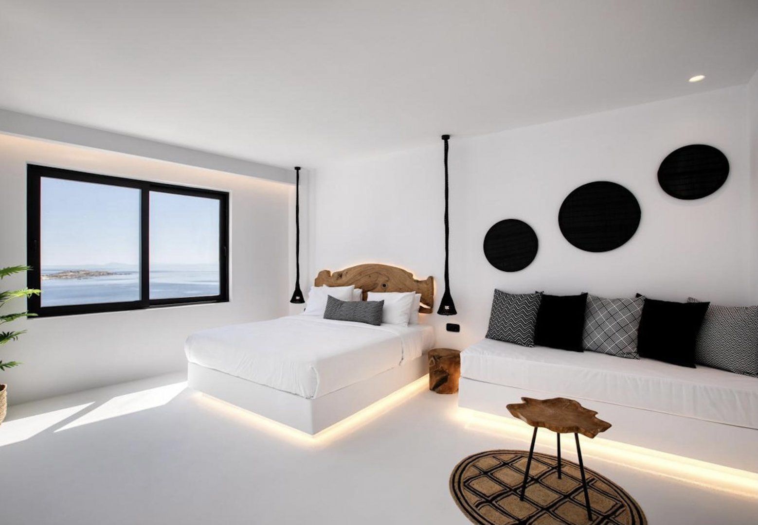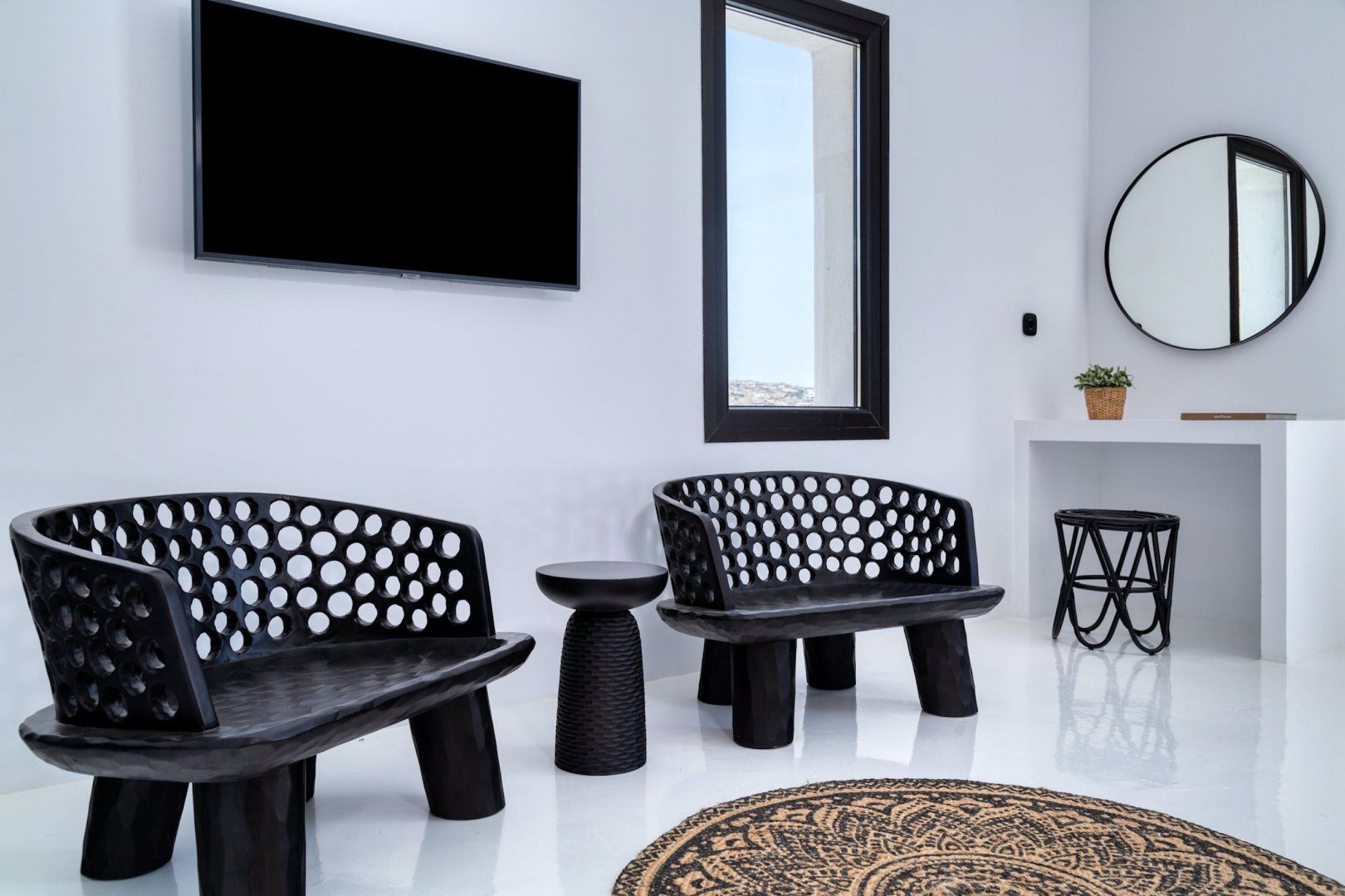 A Poseidon’s palace, right on the sea’s edge, this villa’s panoramic views are fit for the gods. You’re spoilt for choice when it comes to places to relax with luxurious lounge areas, multiple jacuzzis, and an incredible infinity pool, even your own private walkway down to the famous Psarou Beach. Each and every guest is made to feel special, with en-suite, king-sized bedrooms for all, but the master edges it with its private terrace and hot tub access. In the sleek black and white living area, sweeping glass windows take you out onto a grand terrace, where an extensive dining table sits in the shade of the pergola, overlooking the pool. To bask in that Mediterranean sunshine, loungers sit like mini islands on the pool’s surface, surrounded by turquoise water. An upstairs terrace offers a corner sofa and viewpoints of an even higher standard. Stylishly minimalist in its monochrome, open-plan décor, this home most certainly maximises its unrivalled location perched on Mykonos’ coast.