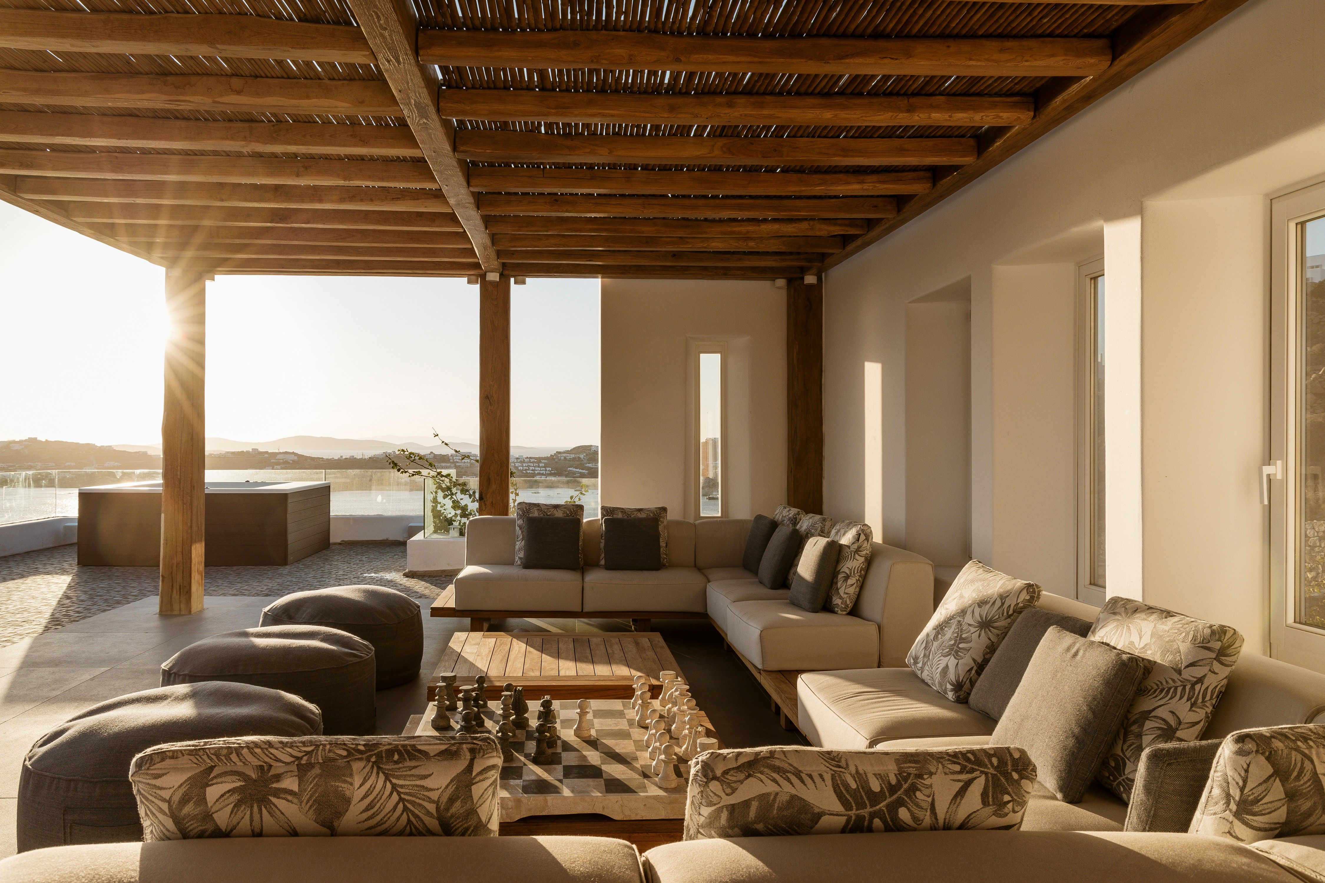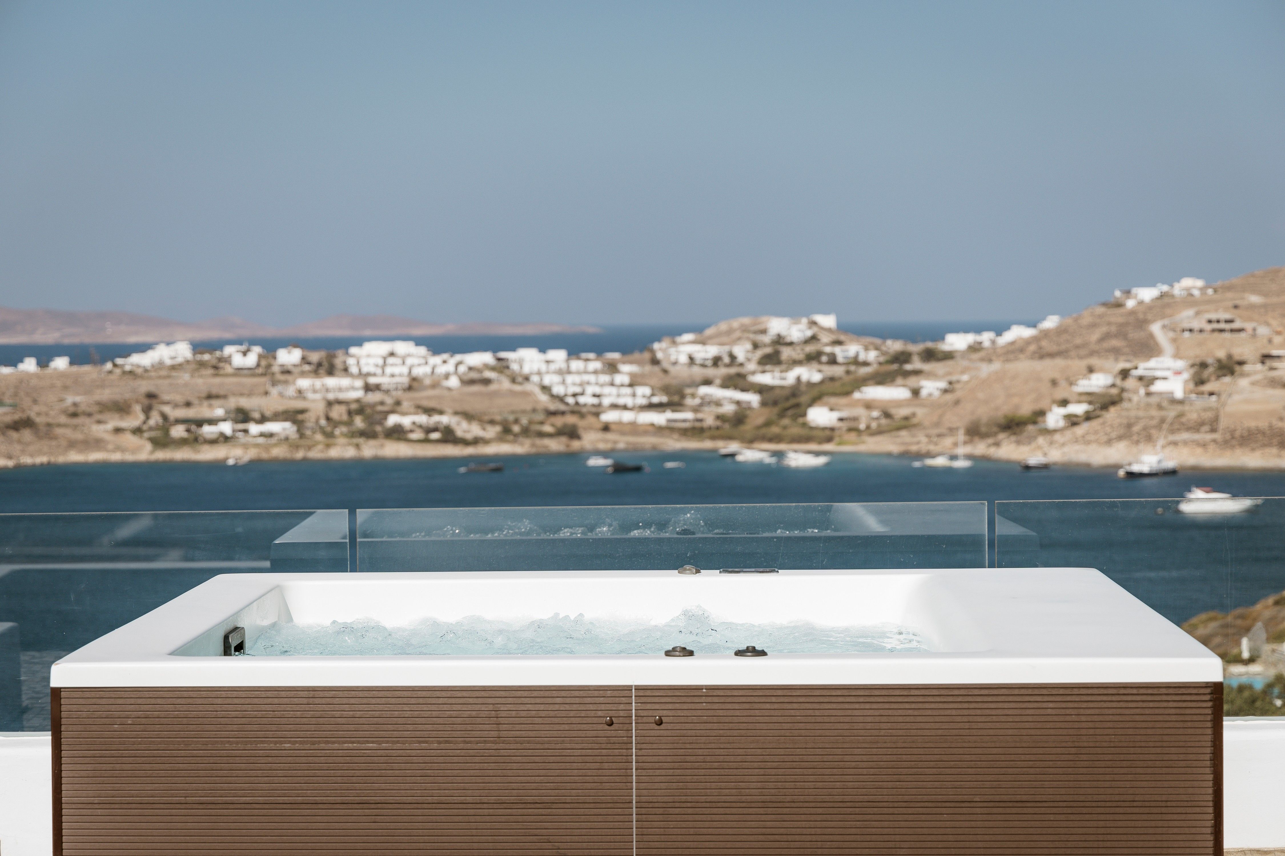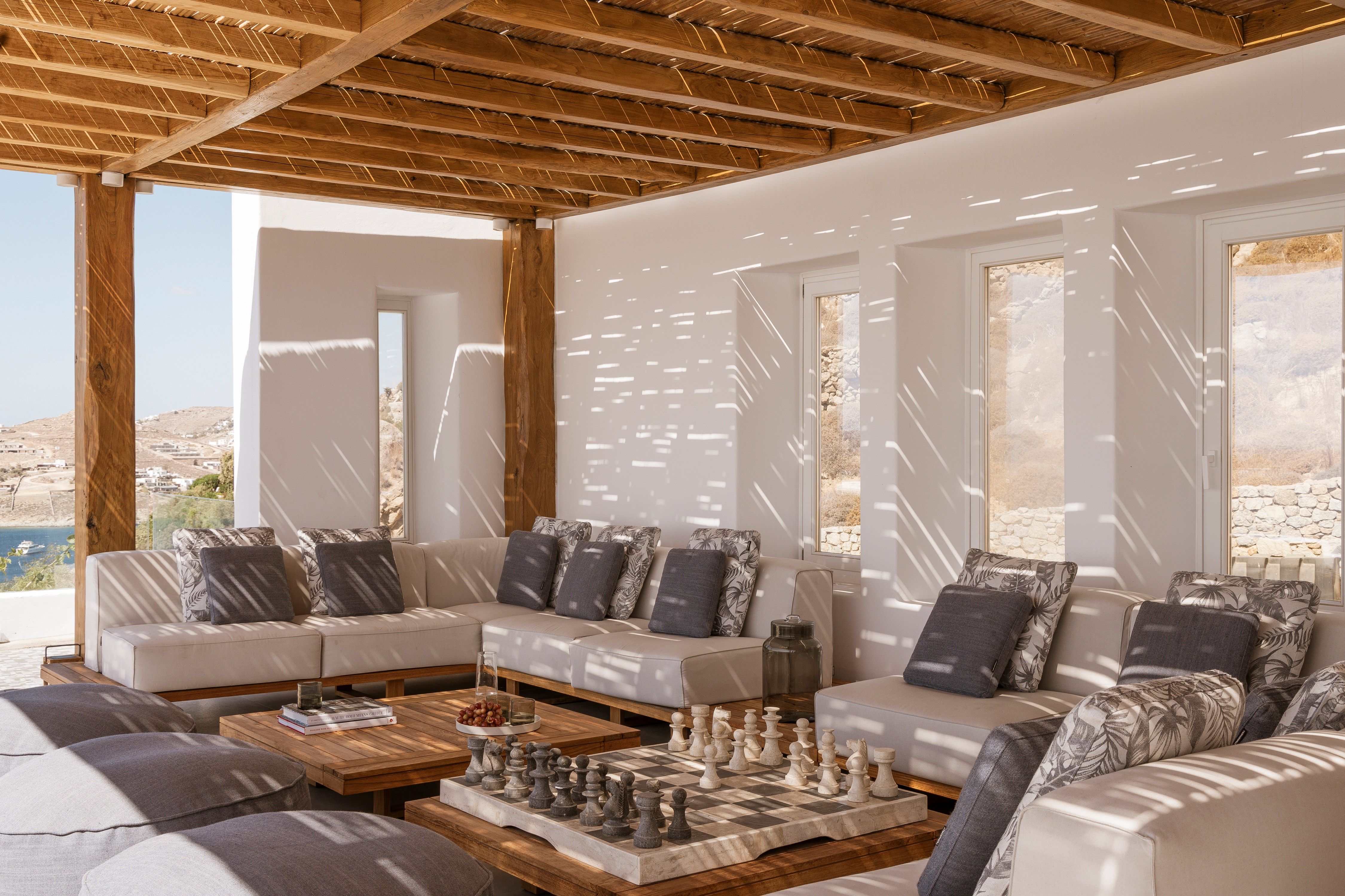 Although the villa feels perfectly private from the clifftop position, it actually sits within the Agios Lazaros resort and Psarou Beach can be reached easily on foot. In addition, the bright lights of Mykonos Town take just over ten minutes in the car.