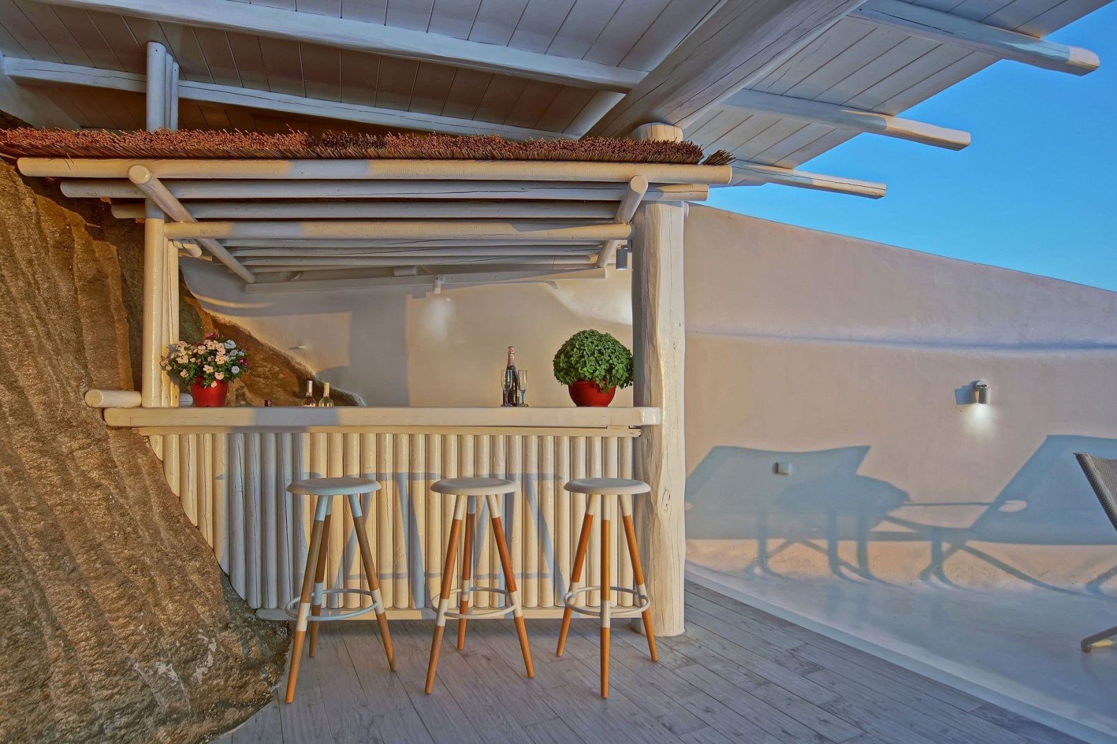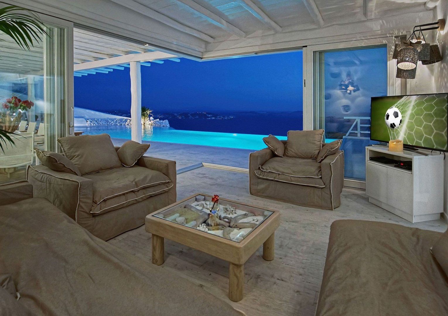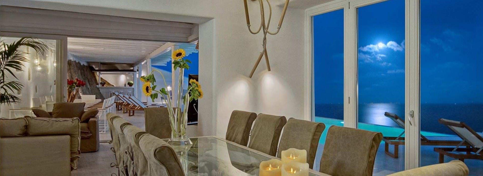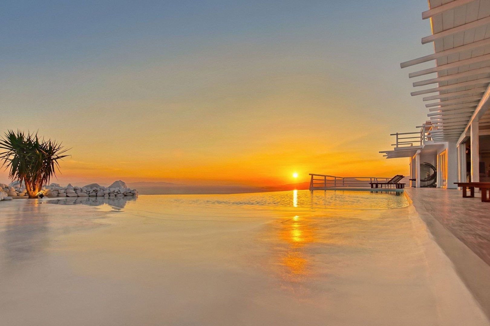 Sometimes, despite convention and societal norms, we fall madly in love with a swimming pool. Looking at this perfect, infinite rectangle of turquoise water blending with the Aegean Sea, we think we’ve found our new beau. It’s the view that seals it; taking in the dramatic Mykonos coastline and islands floating on the horizon from this hilltop perch. The rest of the villa is equally as impressive.