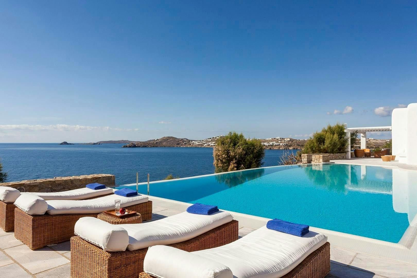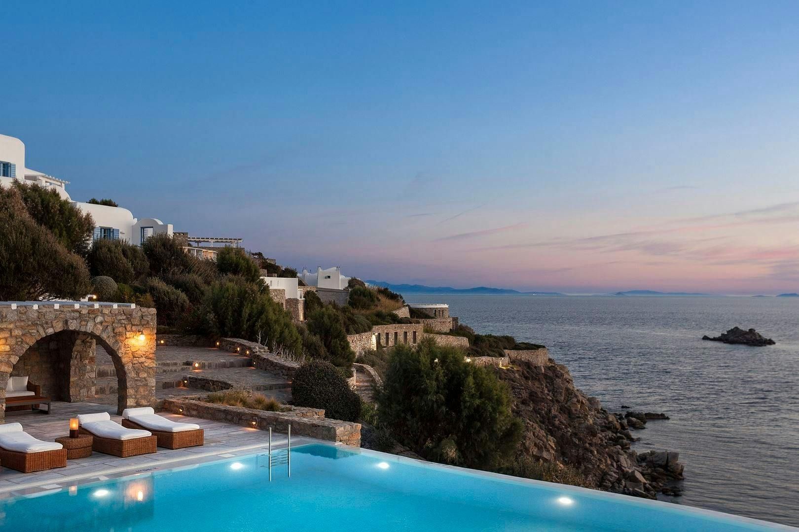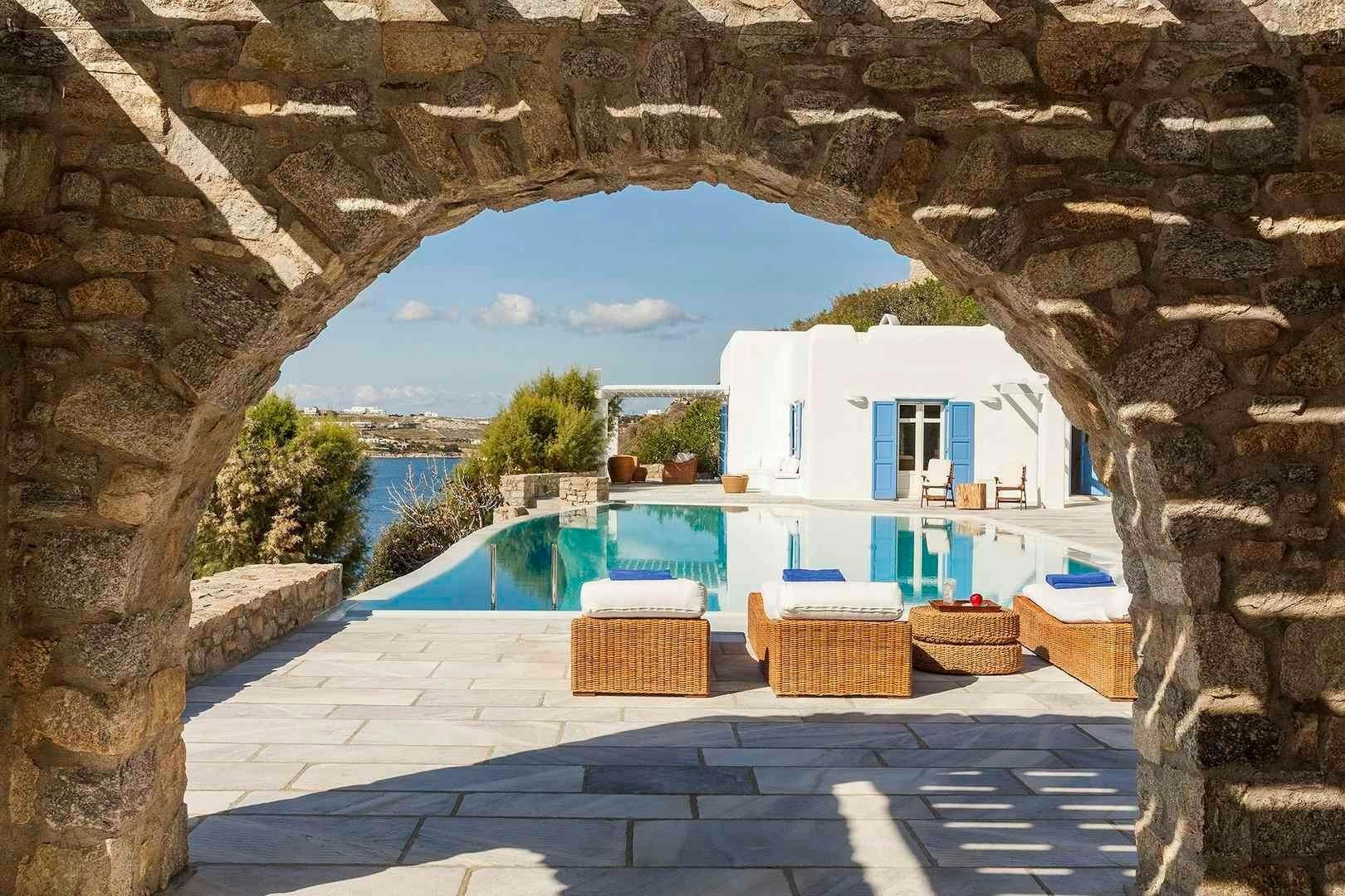 Perched on the edge of Agios Lazaros, this home perfectly embodies the magic of Cycladic living. From the sweeping sea views and the private pool to the traditional rooms, the owners have created the ideal island escape. There is also a path that leads down to the sea, plus the estate includes a jetty for dinghy pick-ups and drop-offs as well as a helipad. We recommend hiring a car to get the most out of your stay, but you’ll find it’s just a short drive to Mykonos Town and Psarou Beach.