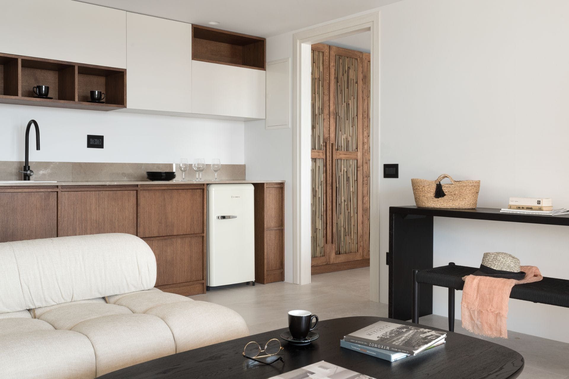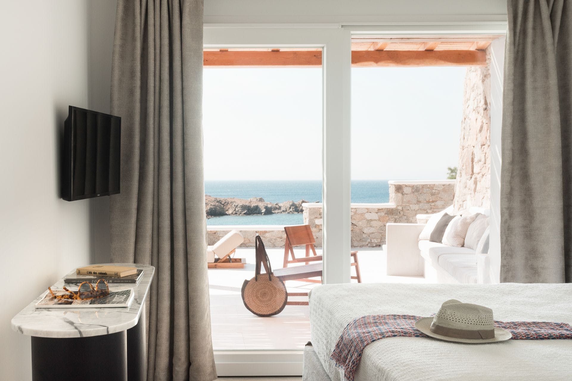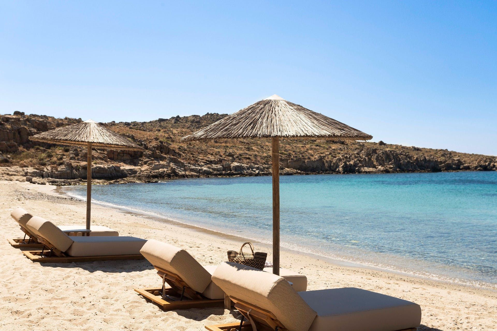 Best of all, the resort has plenty to keep you busy. It's just a ten-minute drive from the nightlife and history in Mykonos town, but chances are, you'll find it hard to leave this little slice of paradise. Sprawl out in the sand on the private beach (umbrellas and sun-loungers included), unwind in the shared hammam, enjoy a massage in the on-site spa, work out in the communal fitness centre and treat yourself to dinner at the resort's restaurant and cocktail bar. A stay here is the definition of laid-back living, and your hosts are more than happy to arrange yacht rentals, personal trainers and drivers for an extra fee, making this the ideal Mykonos escape.