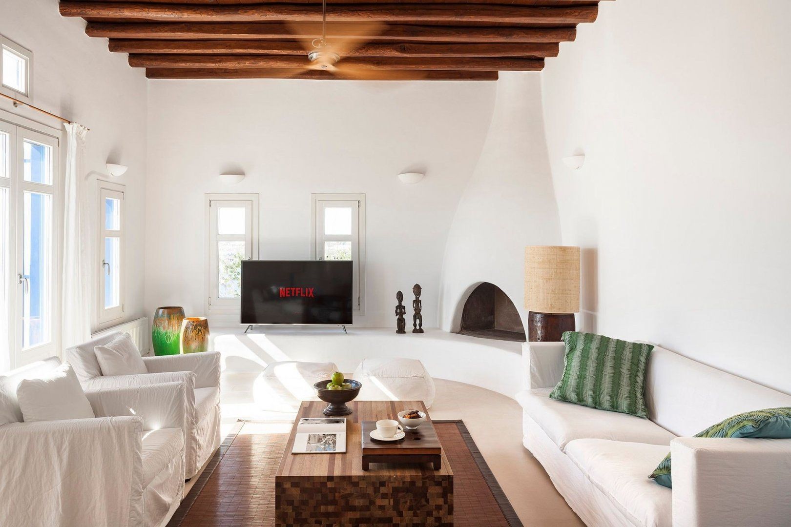 And it's not just the scenery we're fond of. The interiors are the essence of cool, Cycladic design – white-washed walls, curved archways and plenty of light, bright spaces to kick back and relax in. Each stylish bedroom has an equally lavish en-suite bathroom, while the cosy lounge boasts Netflix on the TV and a fireplace for chillier nights. And the resort has direct access to the crystal-clear sea and a small dock – perfect if you want to dip your toes.