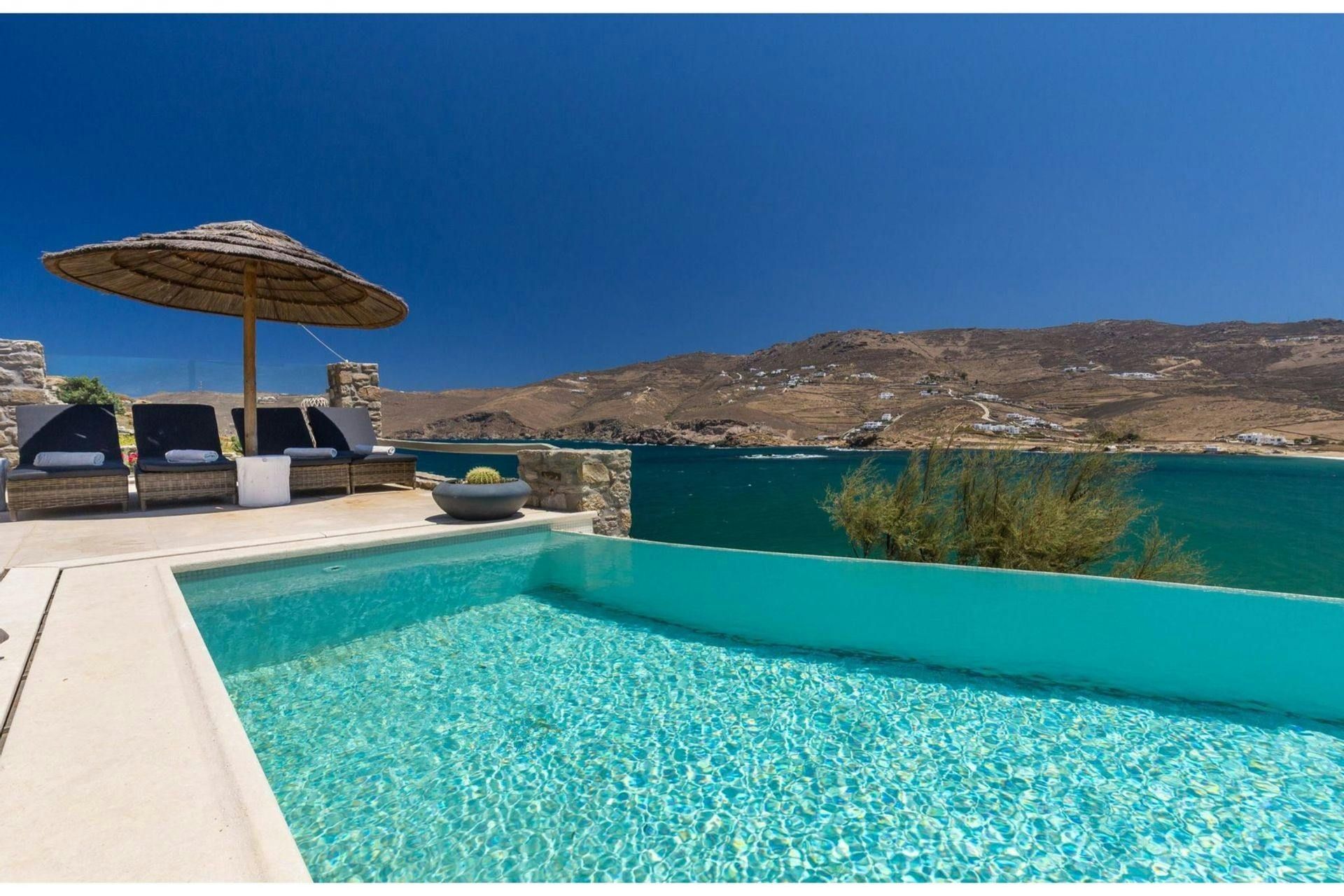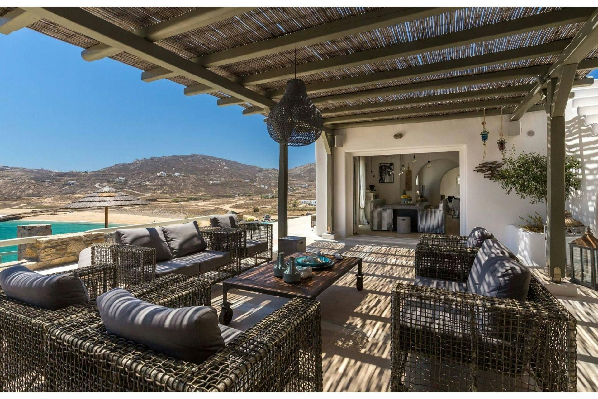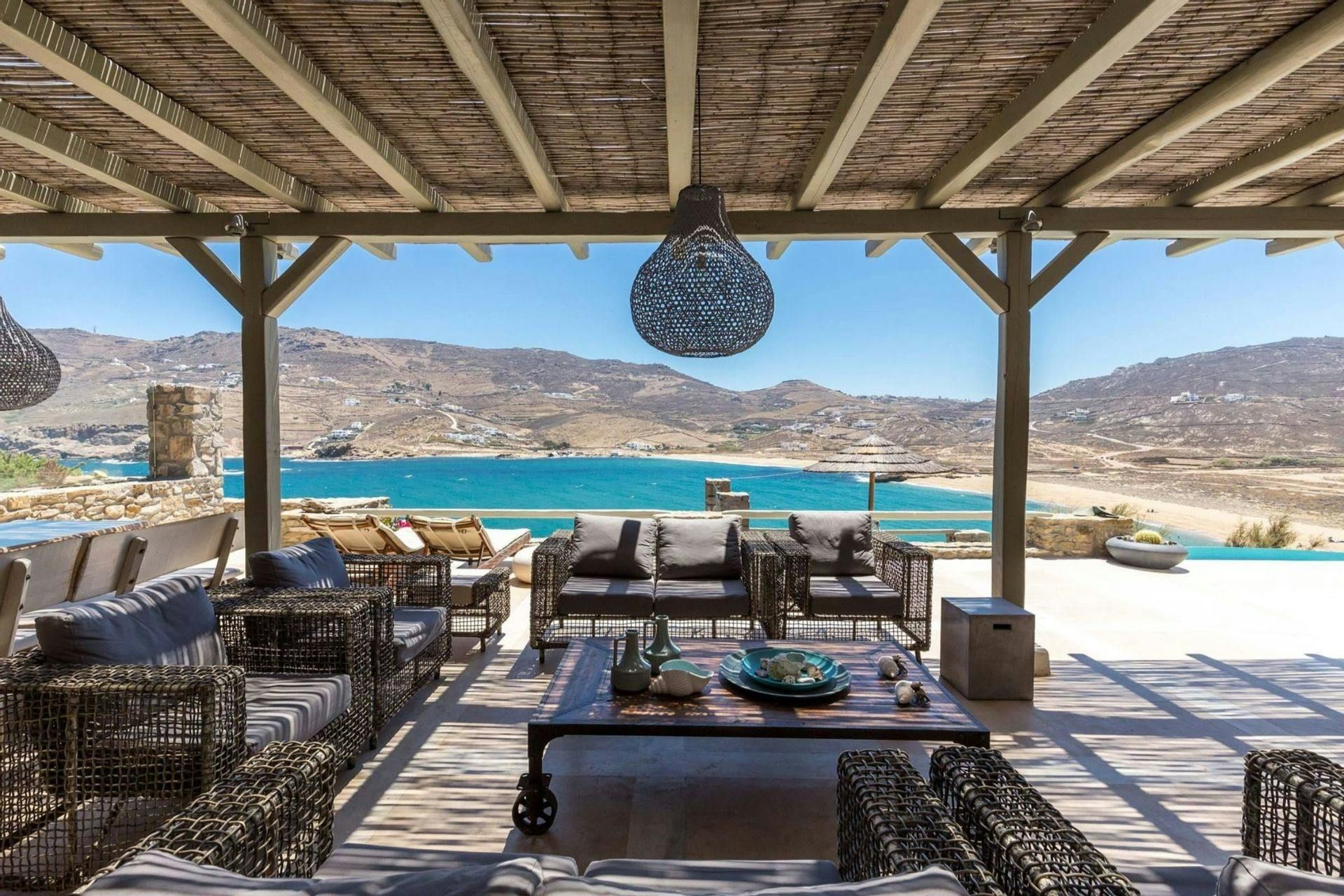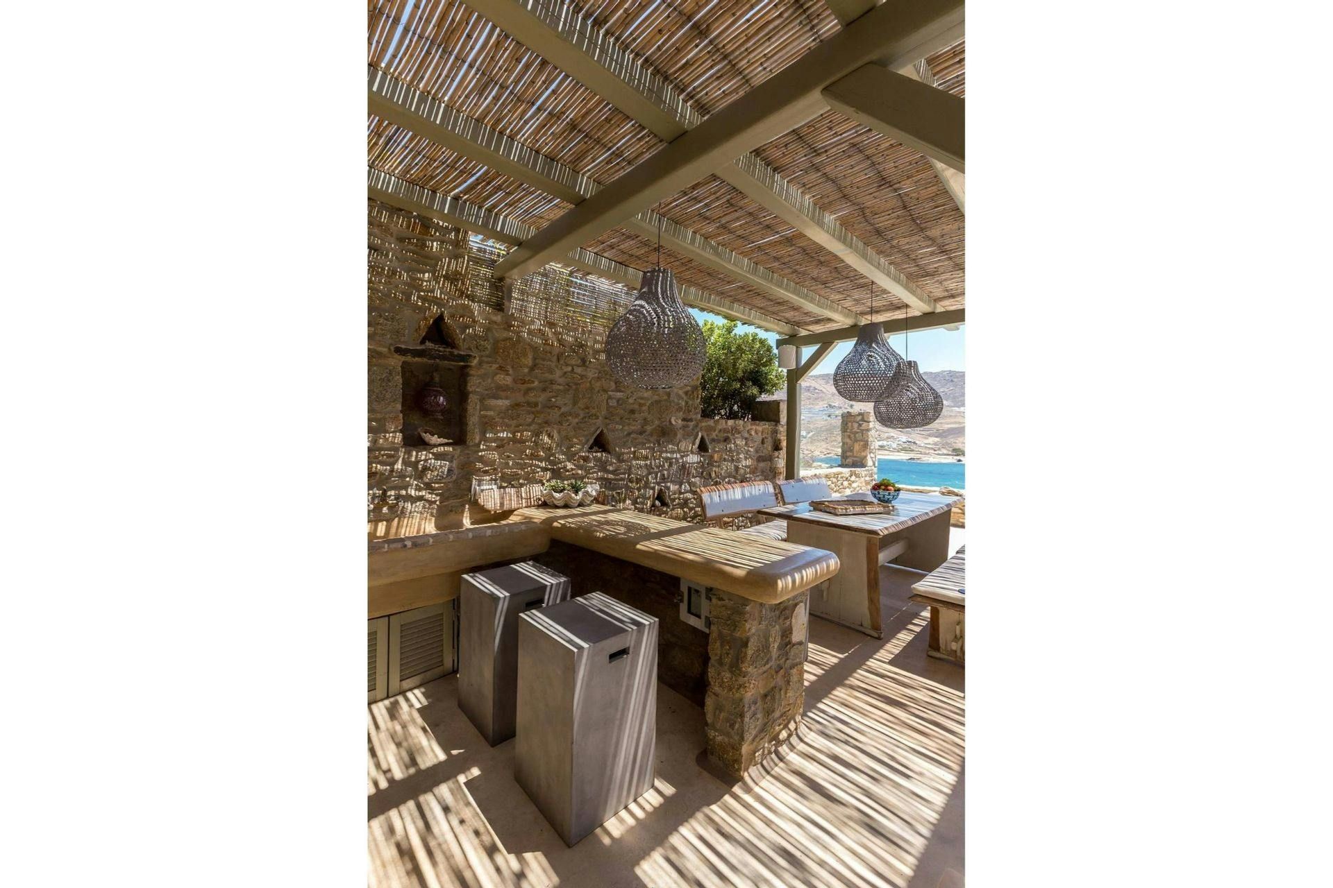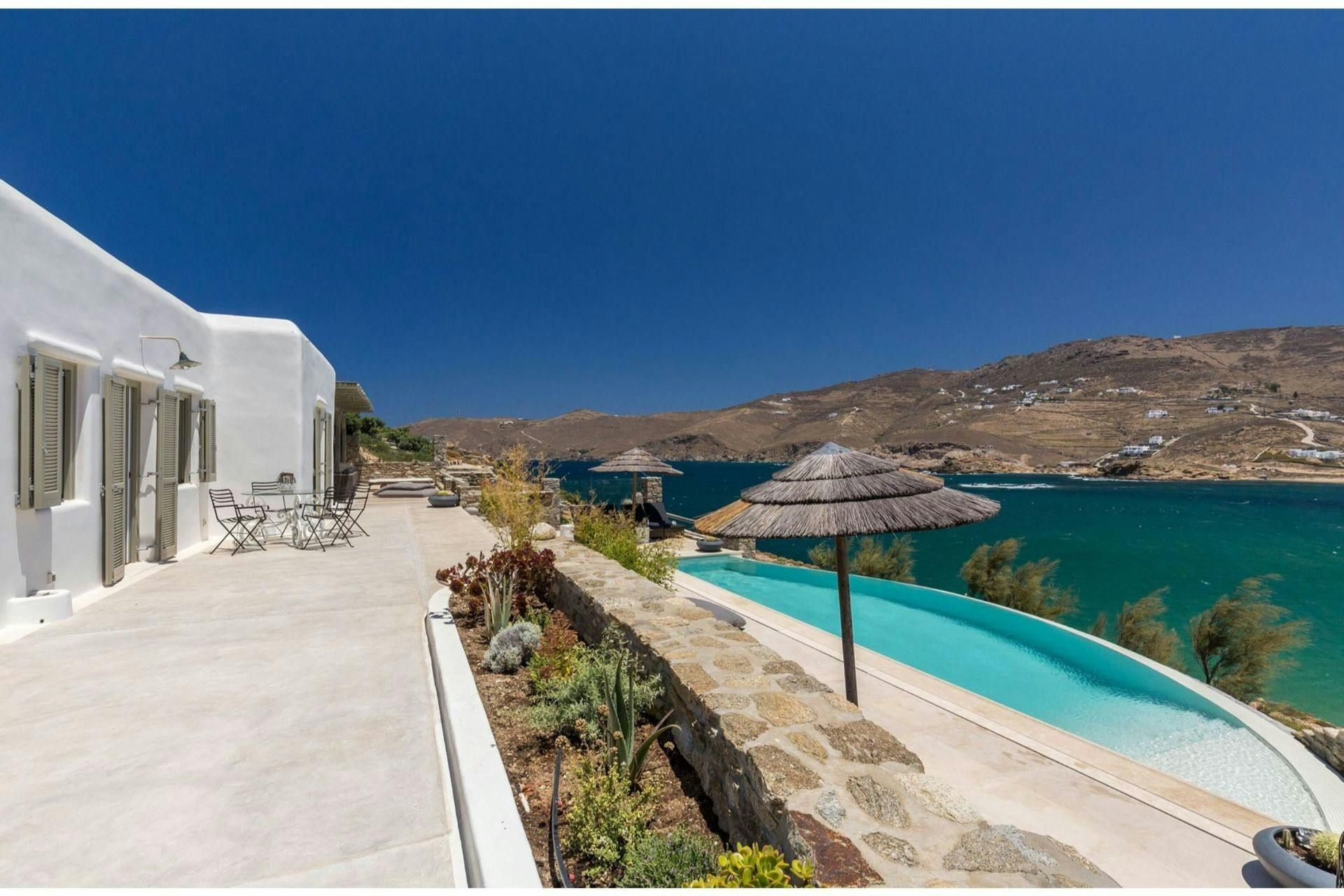 Villa Roxane is a stunning beachfront property located on the hillside of Ftelia Bay. It offers an unforgettable experience for groups of friends or families seeking the perfect Mykonian holiday. With direct access to the famous Ftelia beach, where you'll find Alemagou Beach Bar Restaurant and Farma Bio Restaurant, this tranquil retreat provides privacy and easy access to renowned beach restaurants and the vibrant nightlife of Mykonos Island. The villa features five bedrooms, each with ensuite bathrooms, comfortably accommodating 10 guests plus 2 staff members. Enjoy unobstructed sea views from the spacious outdoor lounge and dining areas, relax by the private infinity pool, and host memorable gatherings under the stars at the BBQ area. Villa Roxane combines whitewashed Mykonian architecture with stone-built elements, creating a charming ambiance that perfectly complements its idyllic location. Immerse yourself in luxury and indulge in a rejuvenating island getaway at this exquisite beachfront villa.