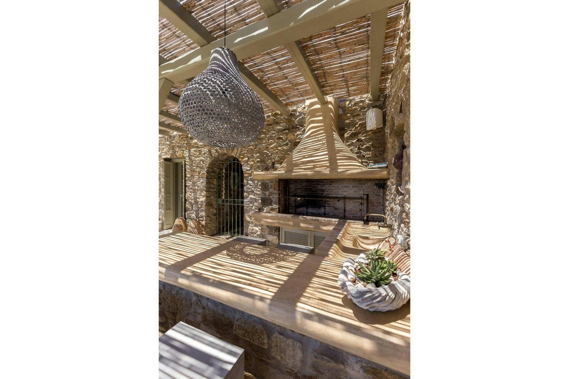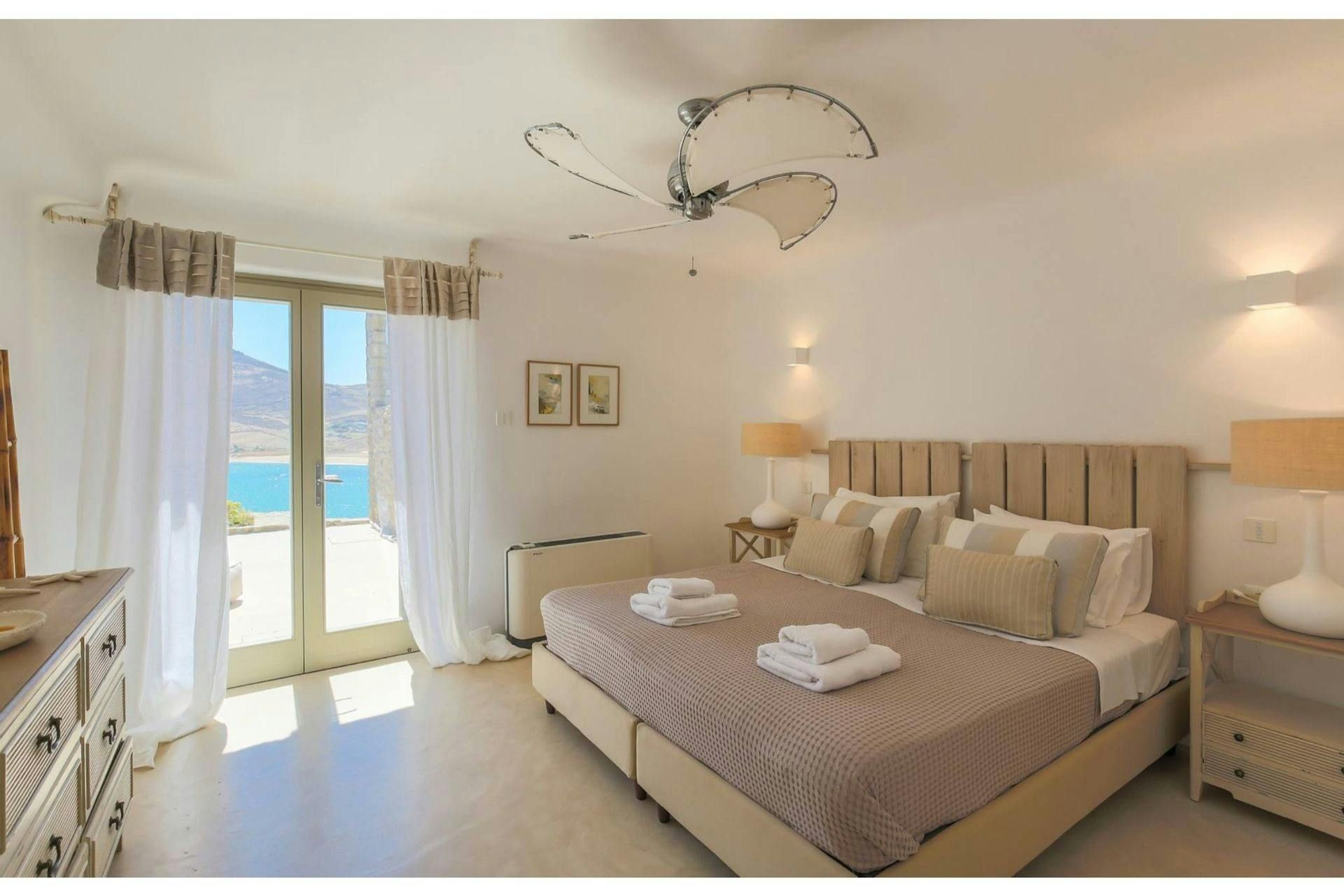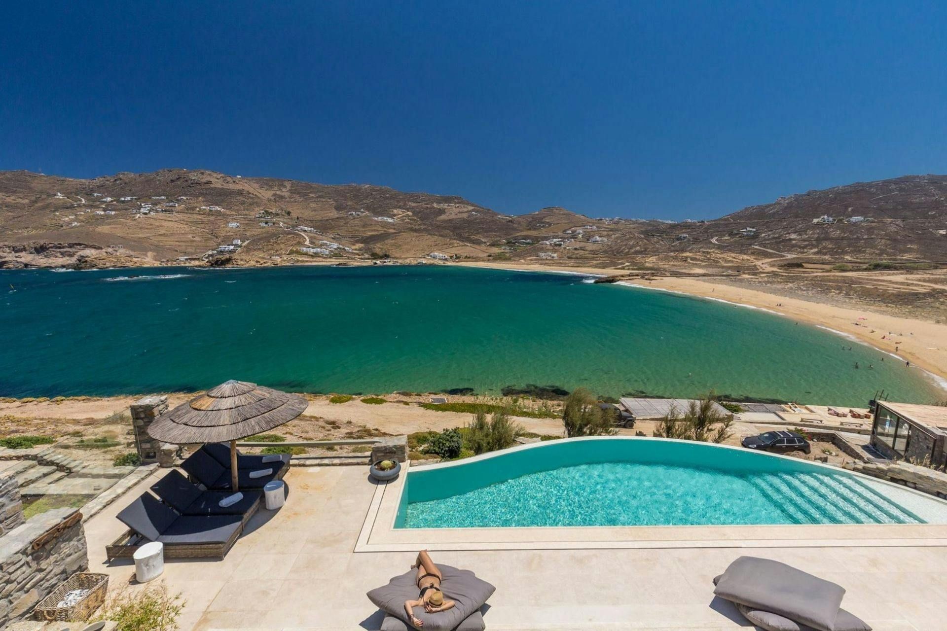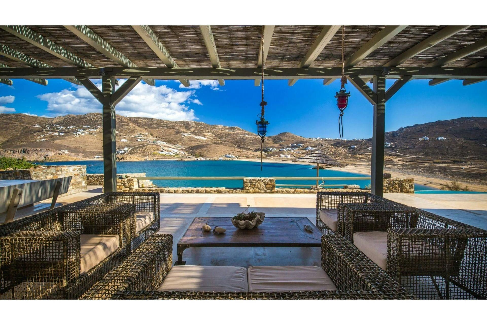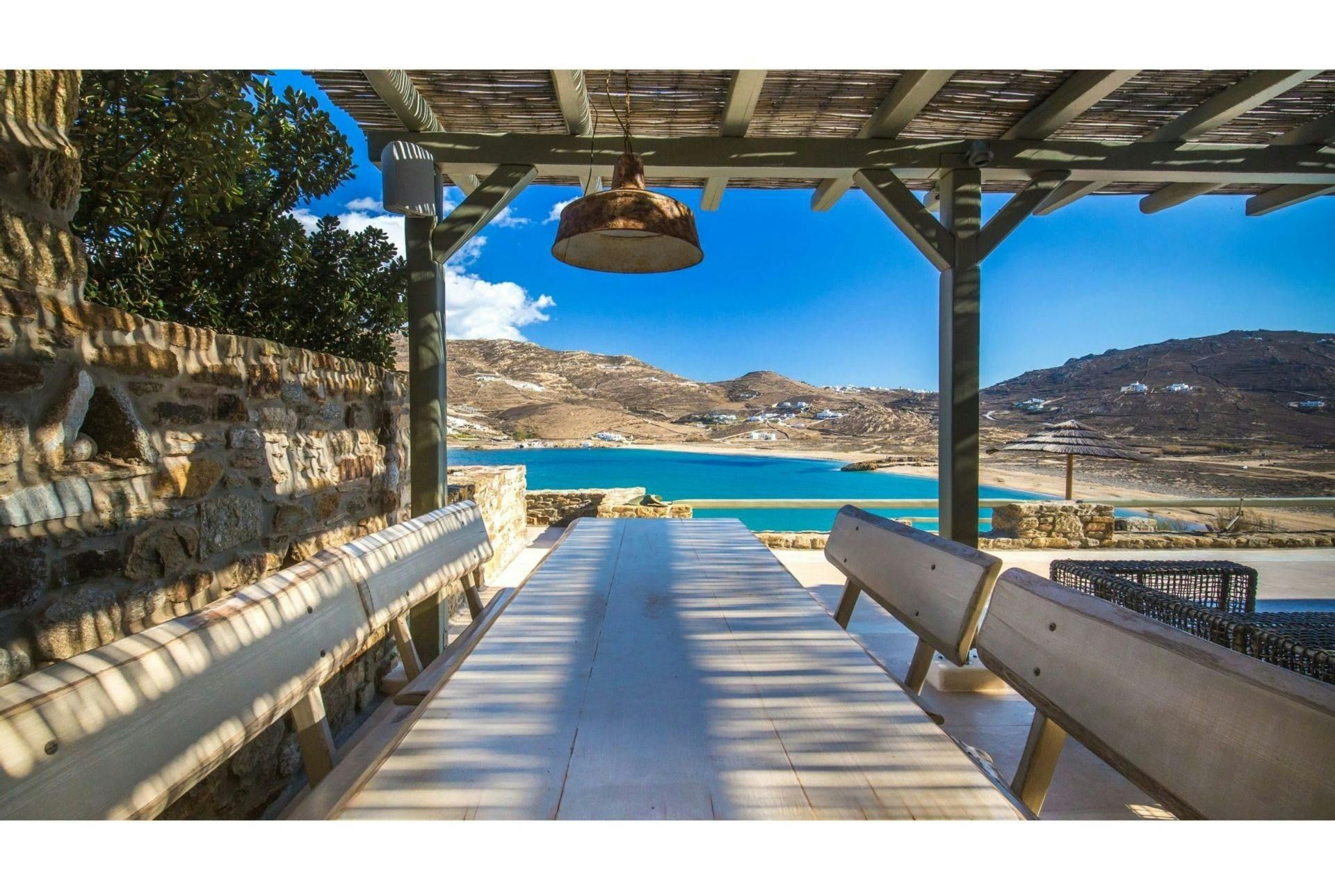 Villa Roxane is a stunning beachfront property located on the hillside of Ftelia Bay. It offers an unforgettable experience for groups of friends or families seeking the perfect Mykonian holiday. With direct access to the famous Ftelia beach, where you'll find Alemagou Beach Bar Restaurant and Farma Bio Restaurant, this tranquil retreat provides privacy and easy access to renowned beach restaurants and the vibrant nightlife of Mykonos Island. The villa features five bedrooms, each with ensuite bathrooms, comfortably accommodating 10 guests plus 2 staff members. Enjoy unobstructed sea views from the spacious outdoor lounge and dining areas, relax by the private infinity pool, and host memorable gatherings under the stars at the BBQ area. Villa Roxane combines whitewashed Mykonian architecture with stone-built elements, creating a charming ambiance that perfectly complements its idyllic location. Immerse yourself in luxury and indulge in a rejuvenating island getaway at this exquisite beachfront villa.