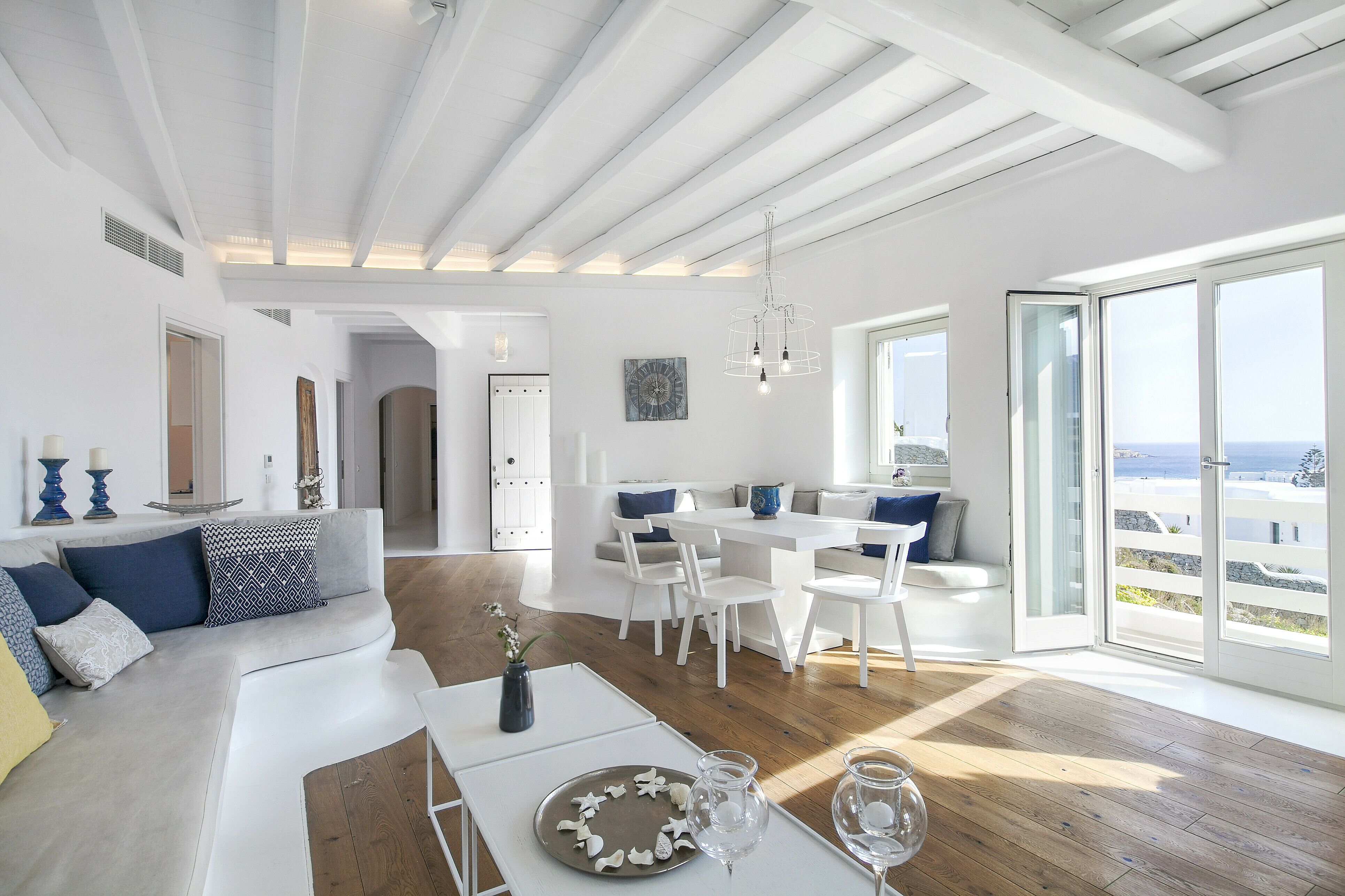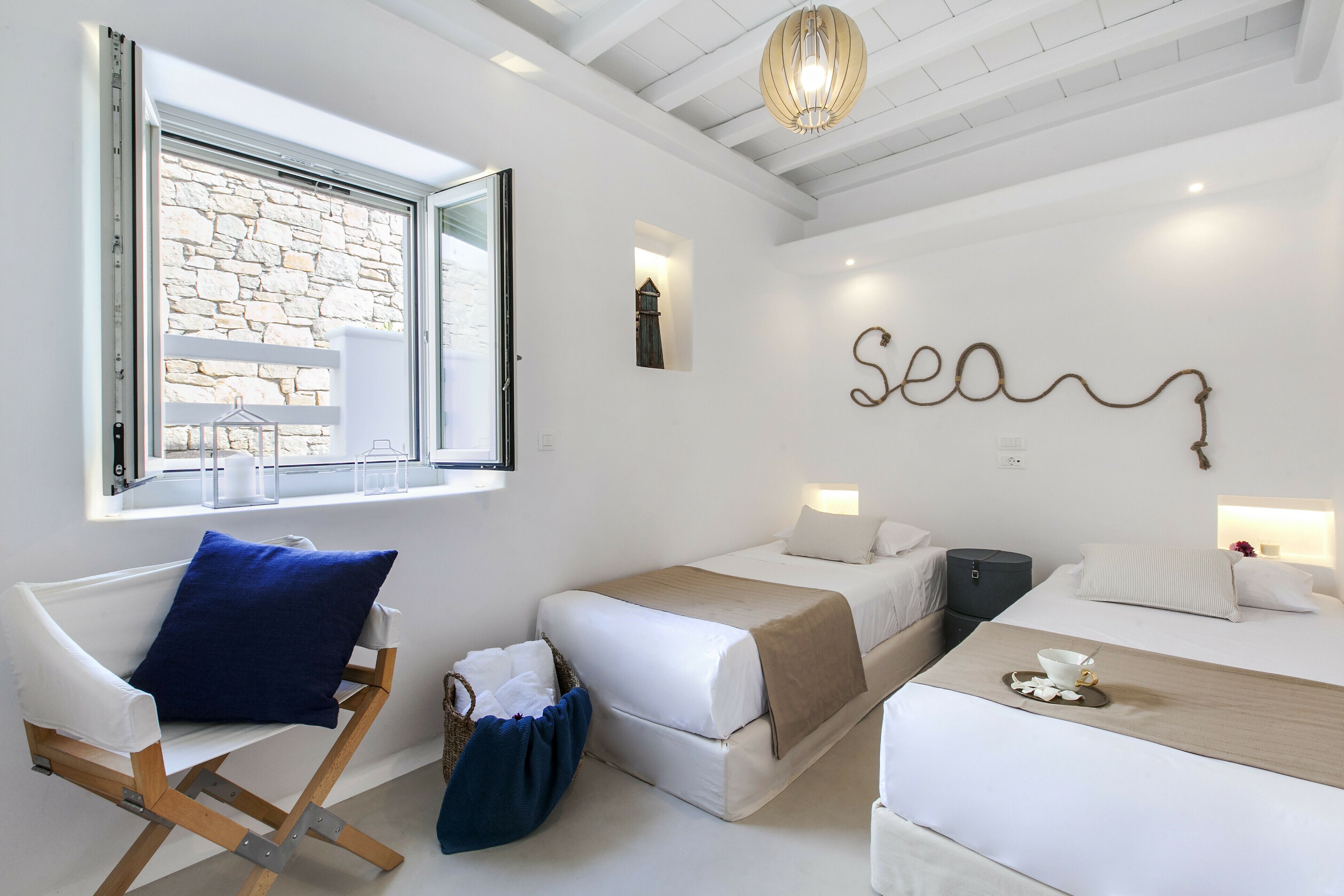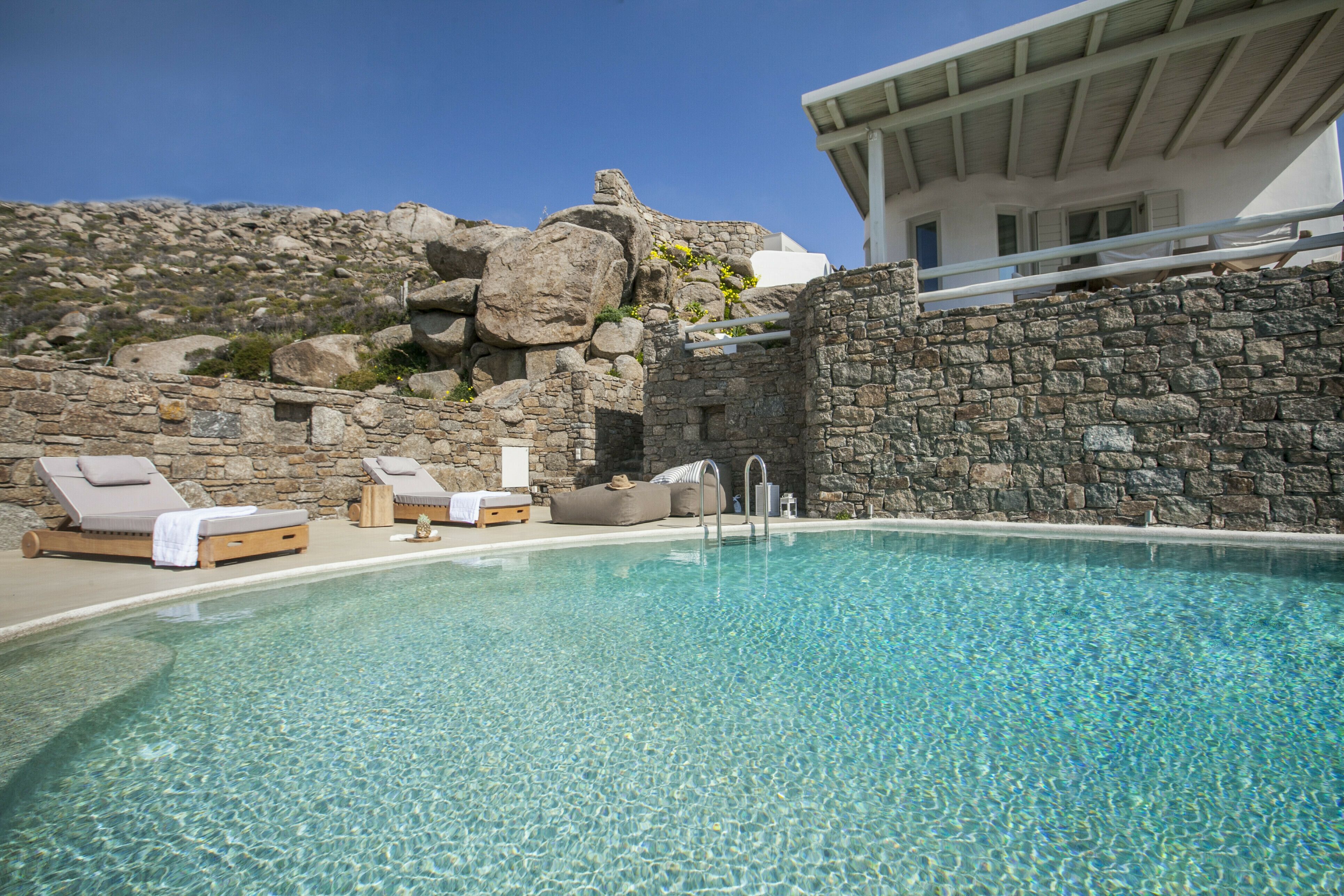 With a privileged spot above Platis Gialos, this home invites you to slow down and embrace the magic of the island. You can enjoy incredible views while dining on the terrace and there’s a pool as well as a hammock for blissful afternoons at home. The rooms embody classic Cycladic style with a family-friendly layout and weekly housekeeping included. We recommend having a car to get around, but it’s just a short drive to Nammos Beach and the vibrant heart of Mykonos town.