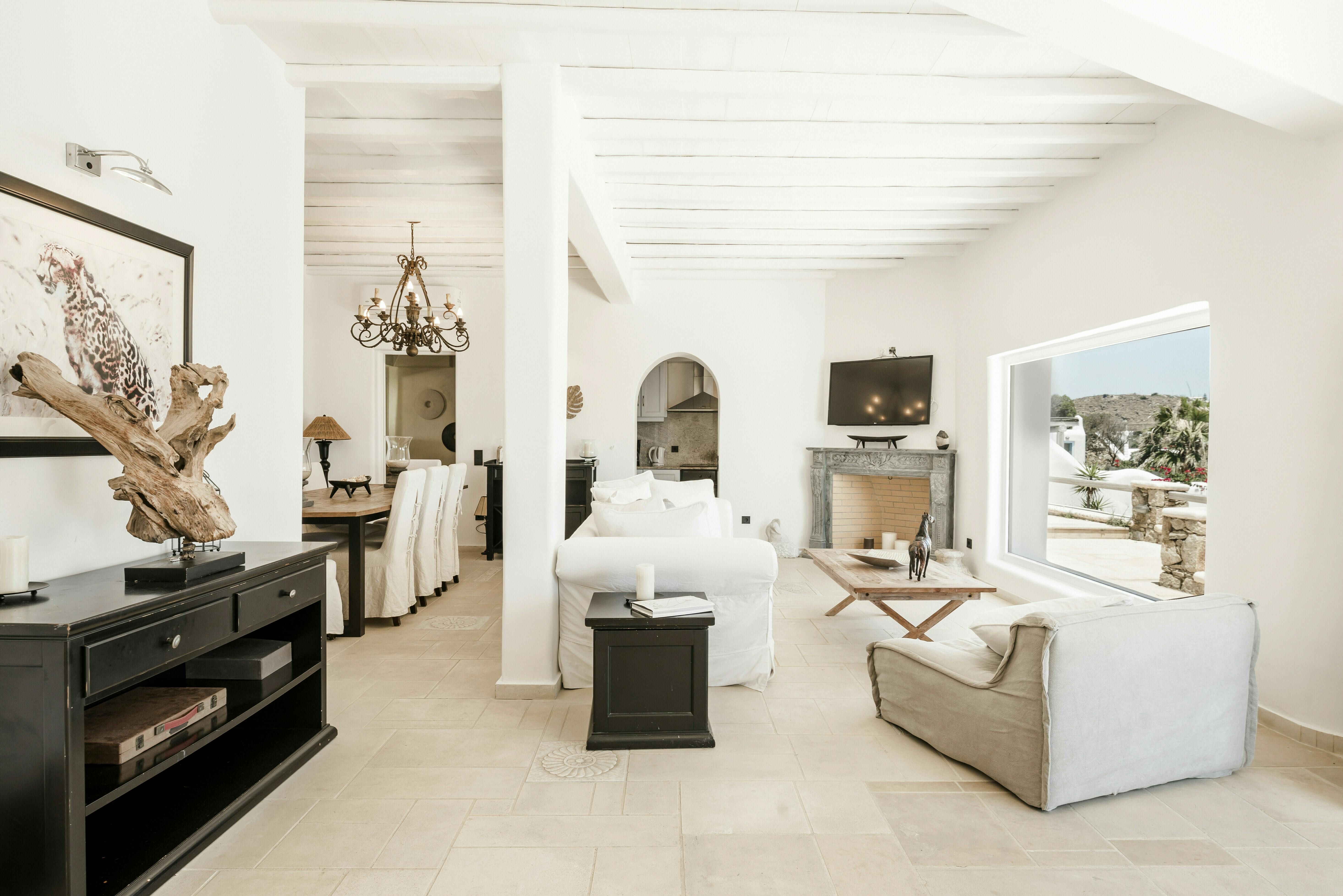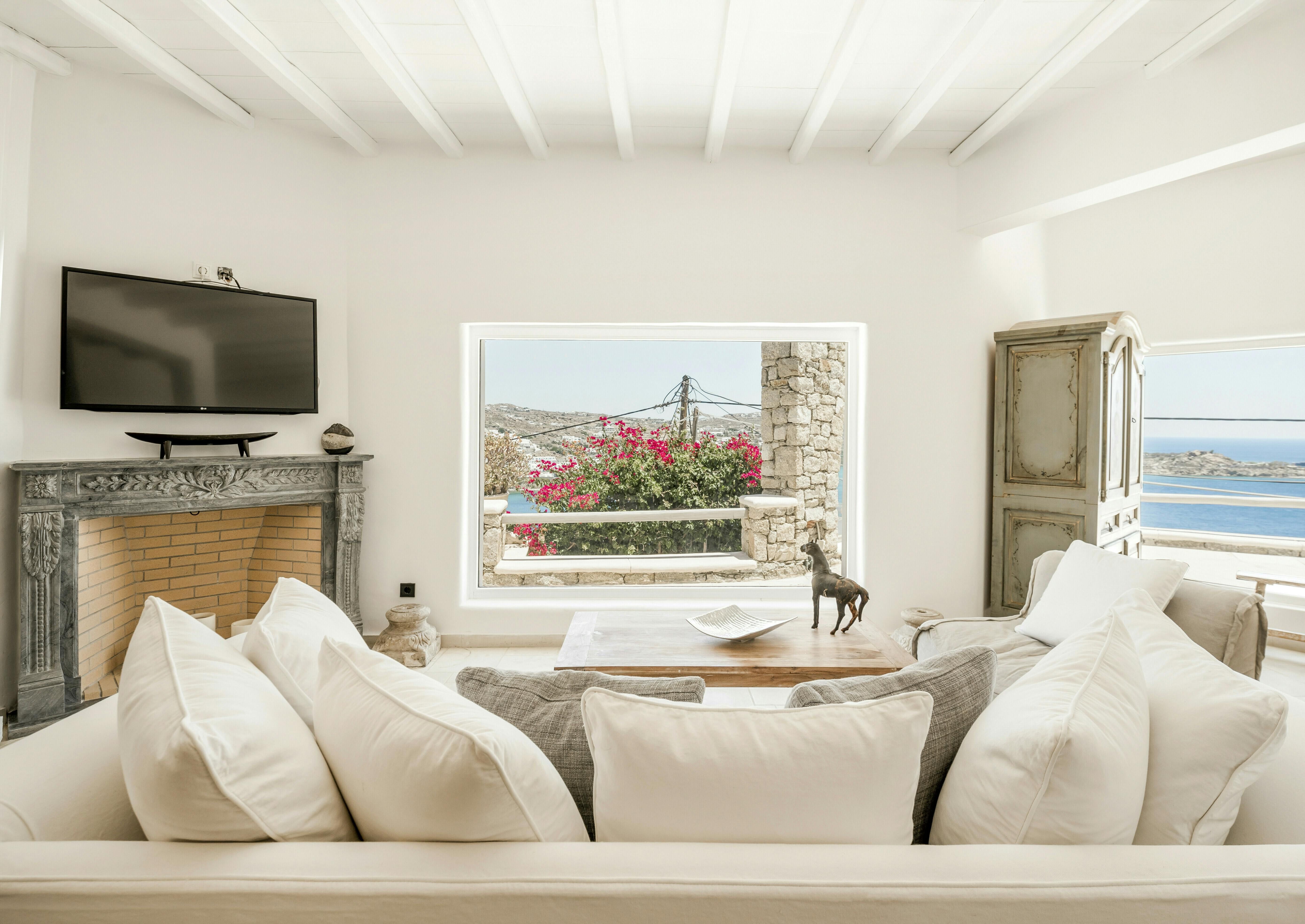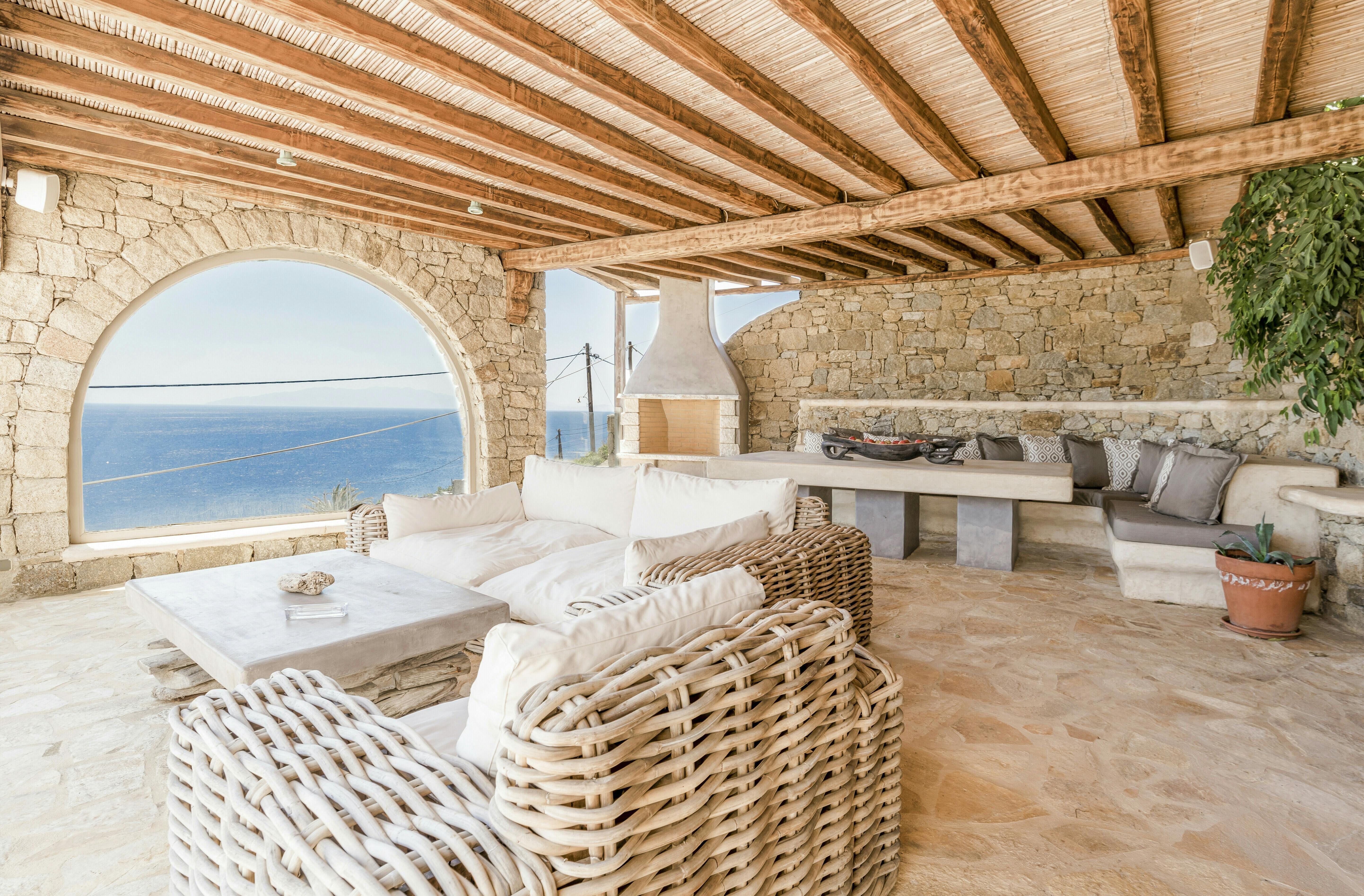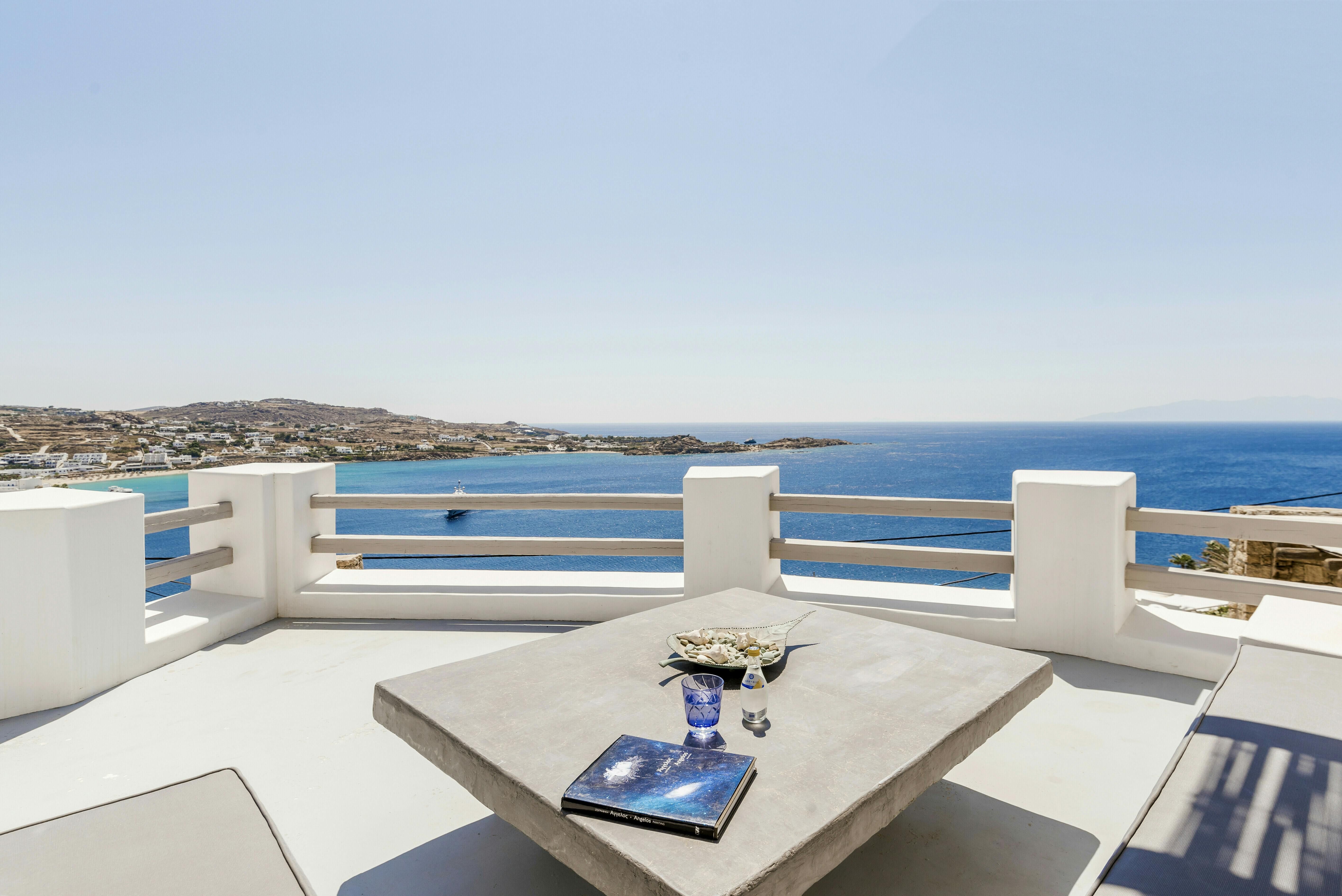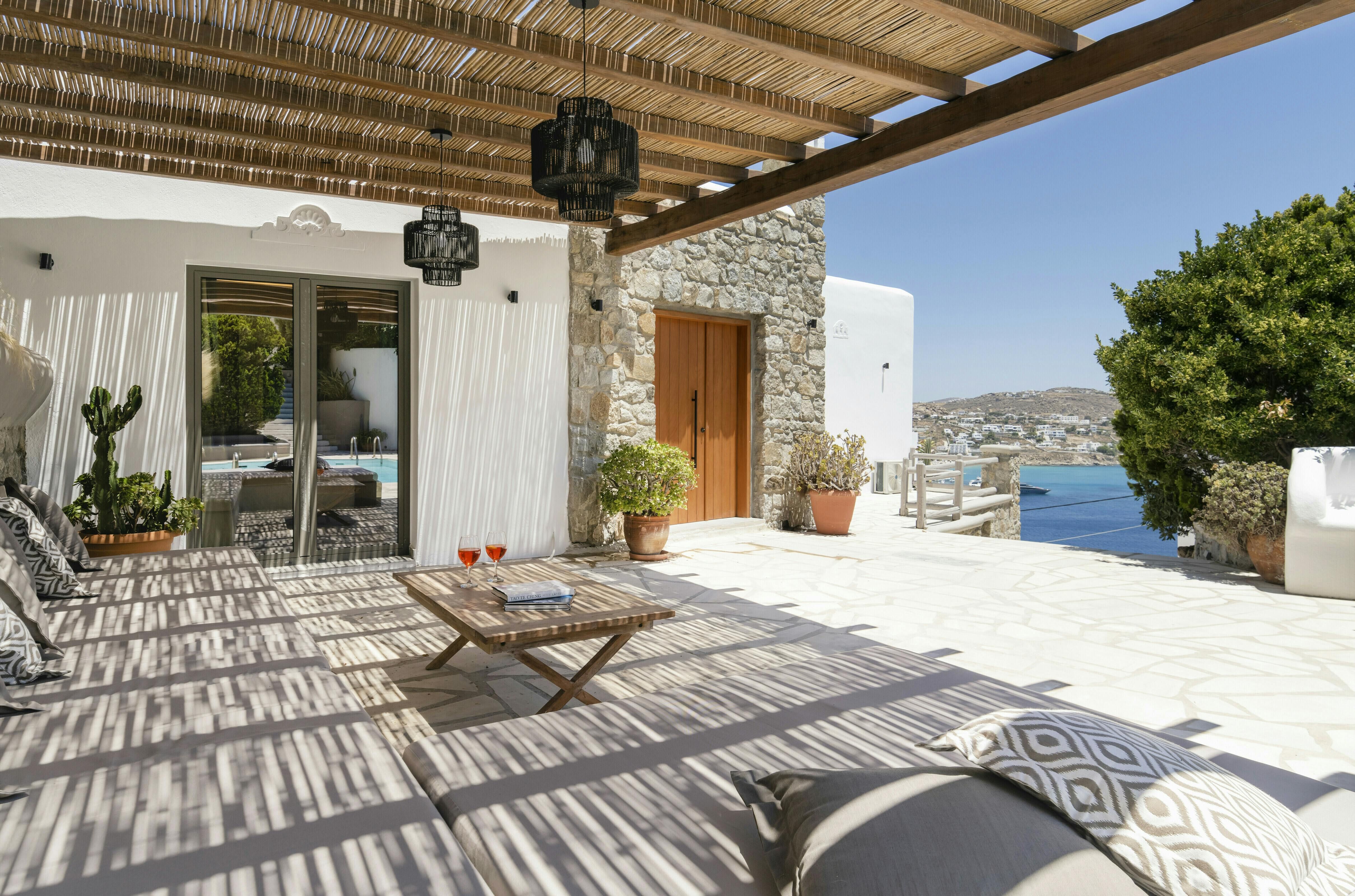 If you’re seeking a blissful island getaway, this home has found you for a reason. Perched in the hills of Agios Lazaros, there are stunning sea views from the sun kissed terrace. There’s also a pool and plenty of space to lounge and dine alfresco. It’s worth noting the rooms are spread across the main house and two independent guest houses, but this works perfectly for families and large groups. Plus, it’s less than a fifteen-minute drive to the vibrant Ornos Beach as well as Mykonos Town.