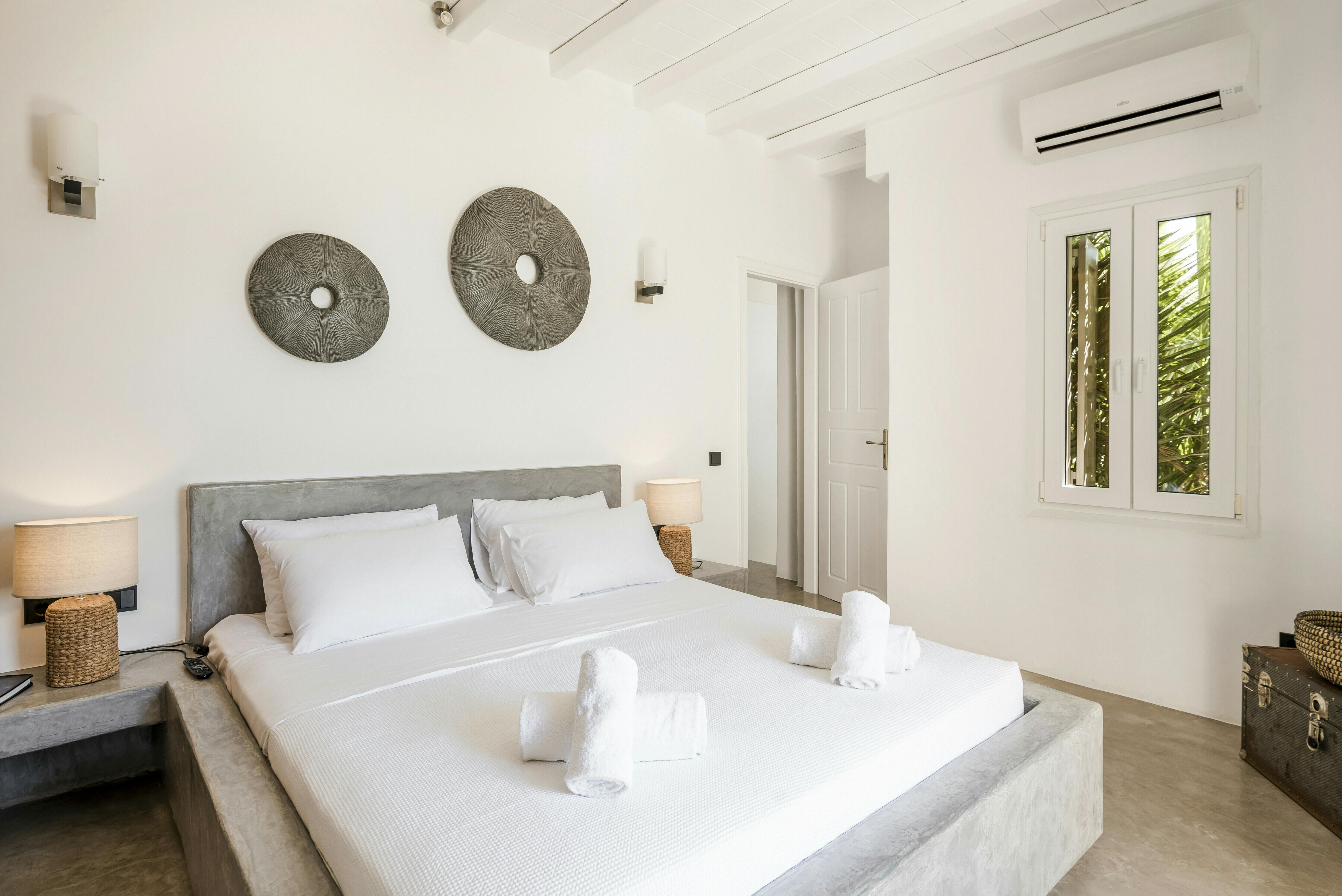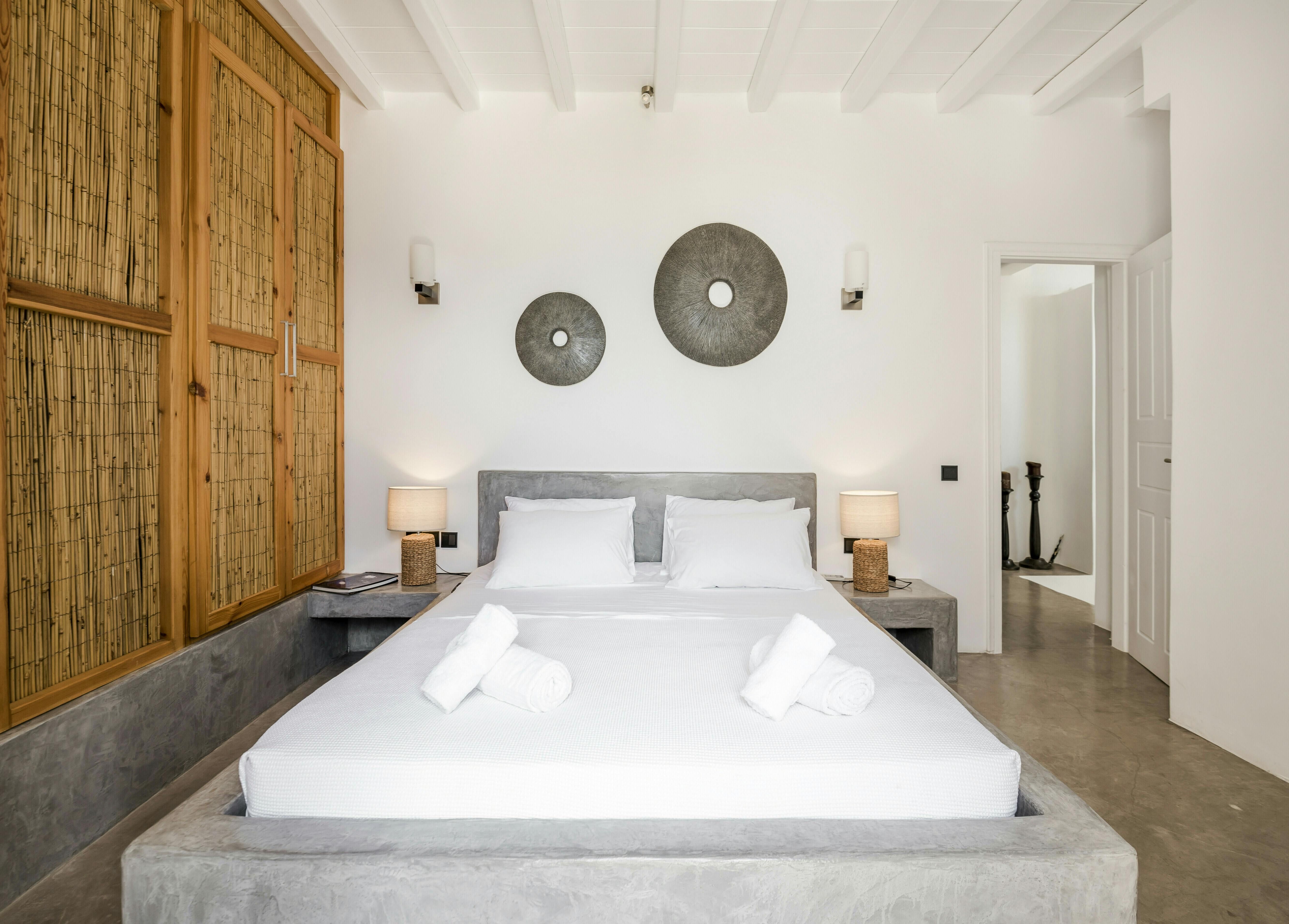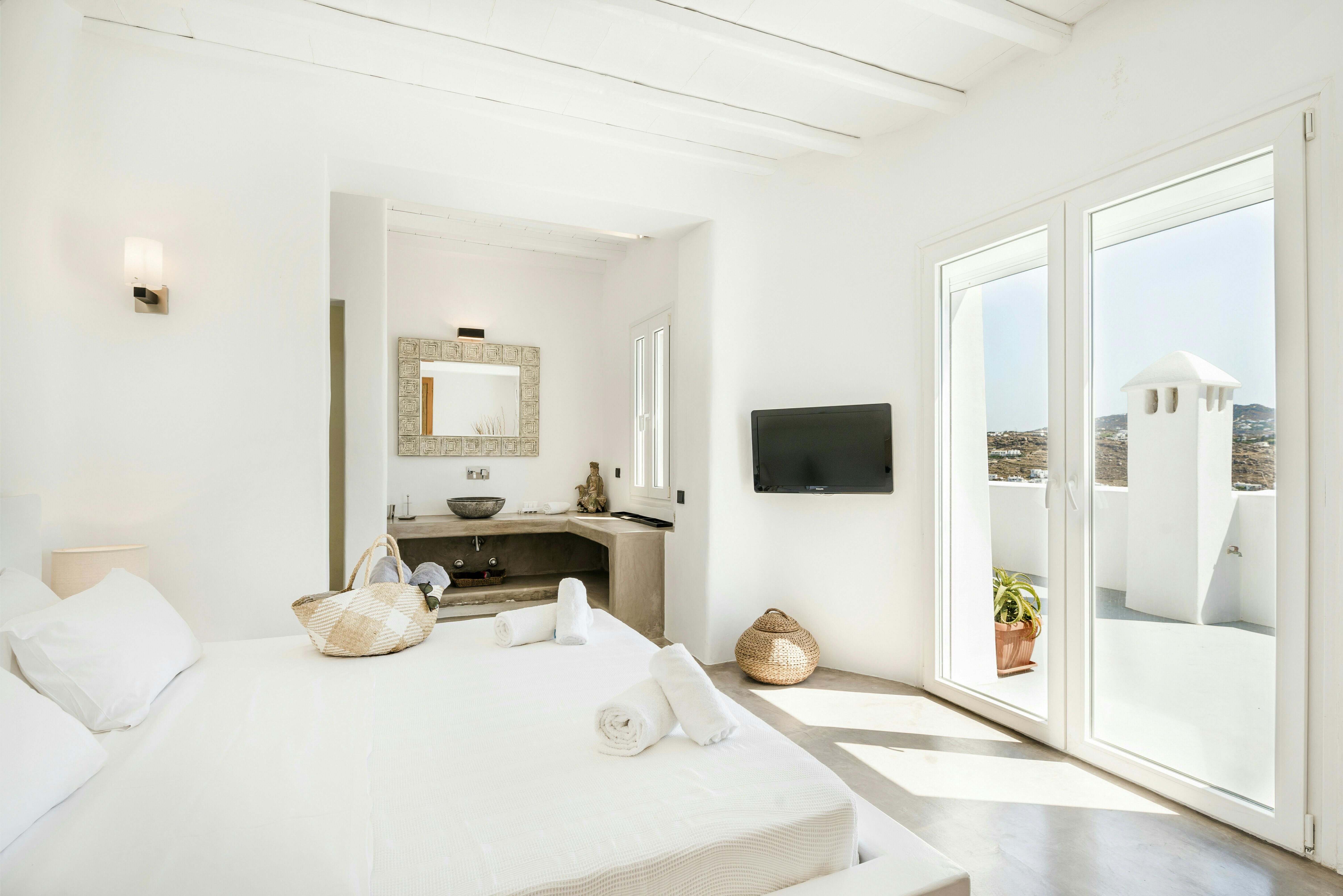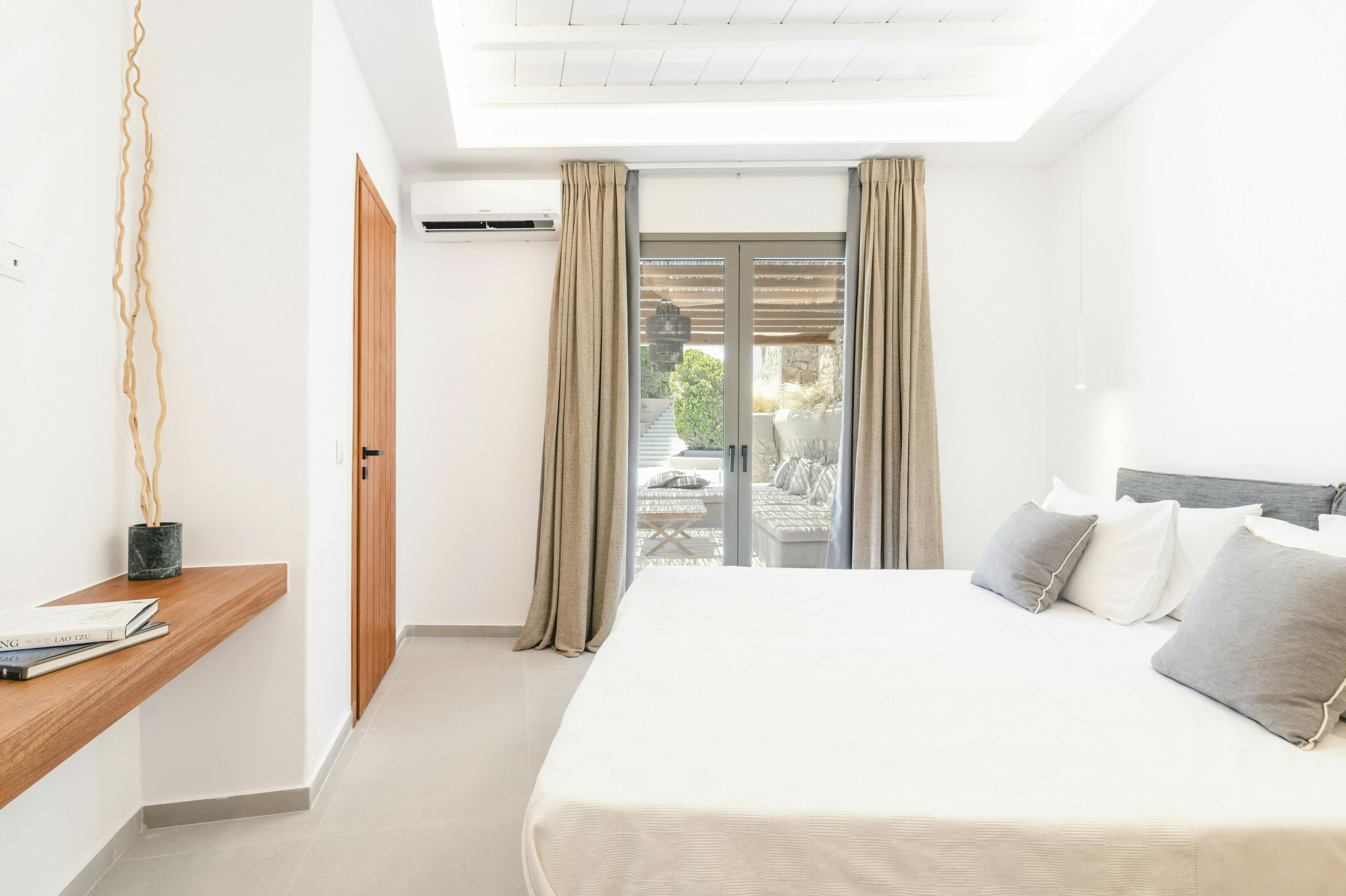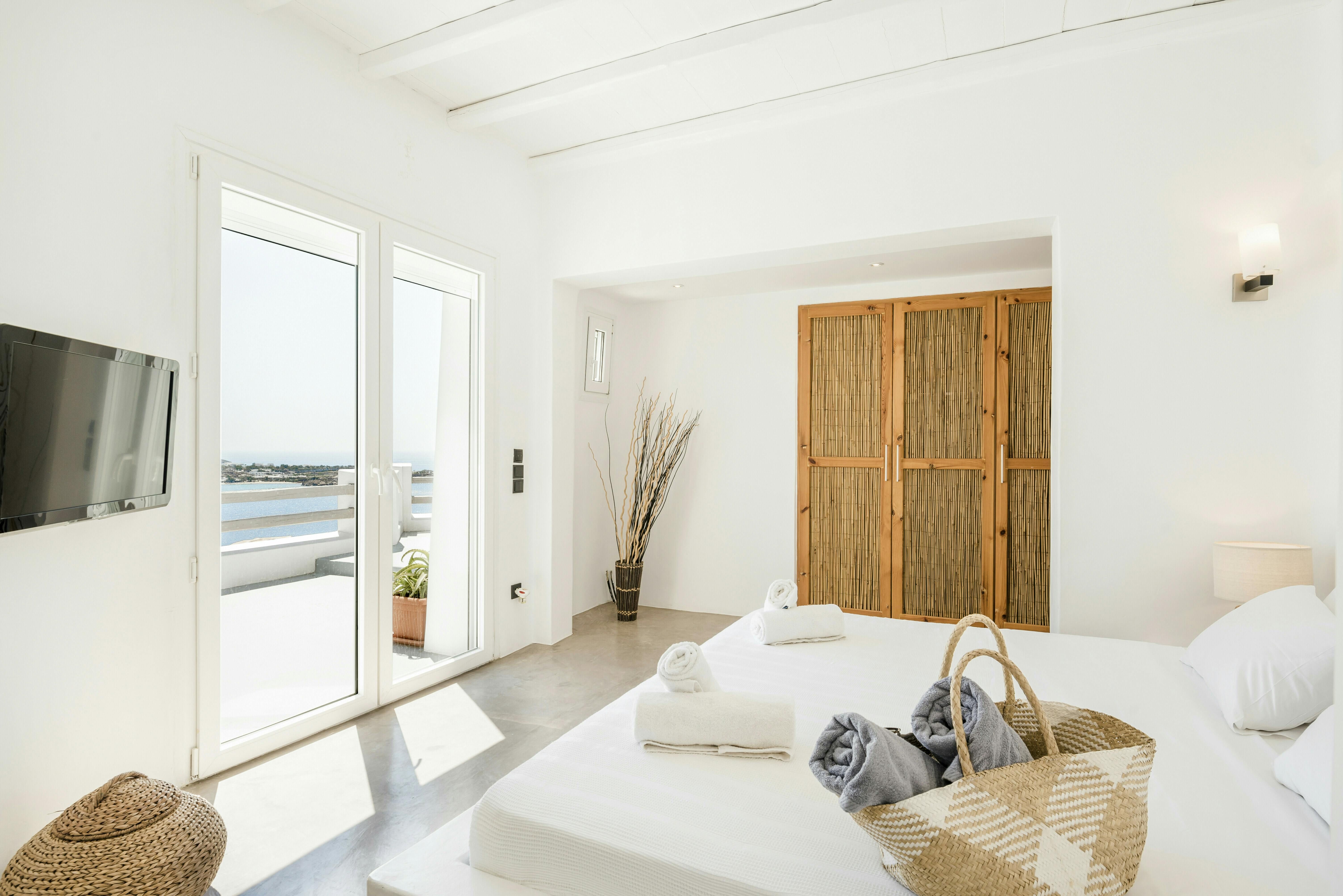 If you’re seeking a blissful island getaway, this home has found you for a reason. Perched in the hills of Agios Lazaros, there are stunning sea views from the sun kissed terrace. There’s also a pool and plenty of space to lounge and dine alfresco. It’s worth noting the rooms are spread across the main house and two independent guest houses, but this works perfectly for families and large groups. Plus, it’s less than a fifteen-minute drive to the vibrant Ornos Beach as well as Mykonos Town.
