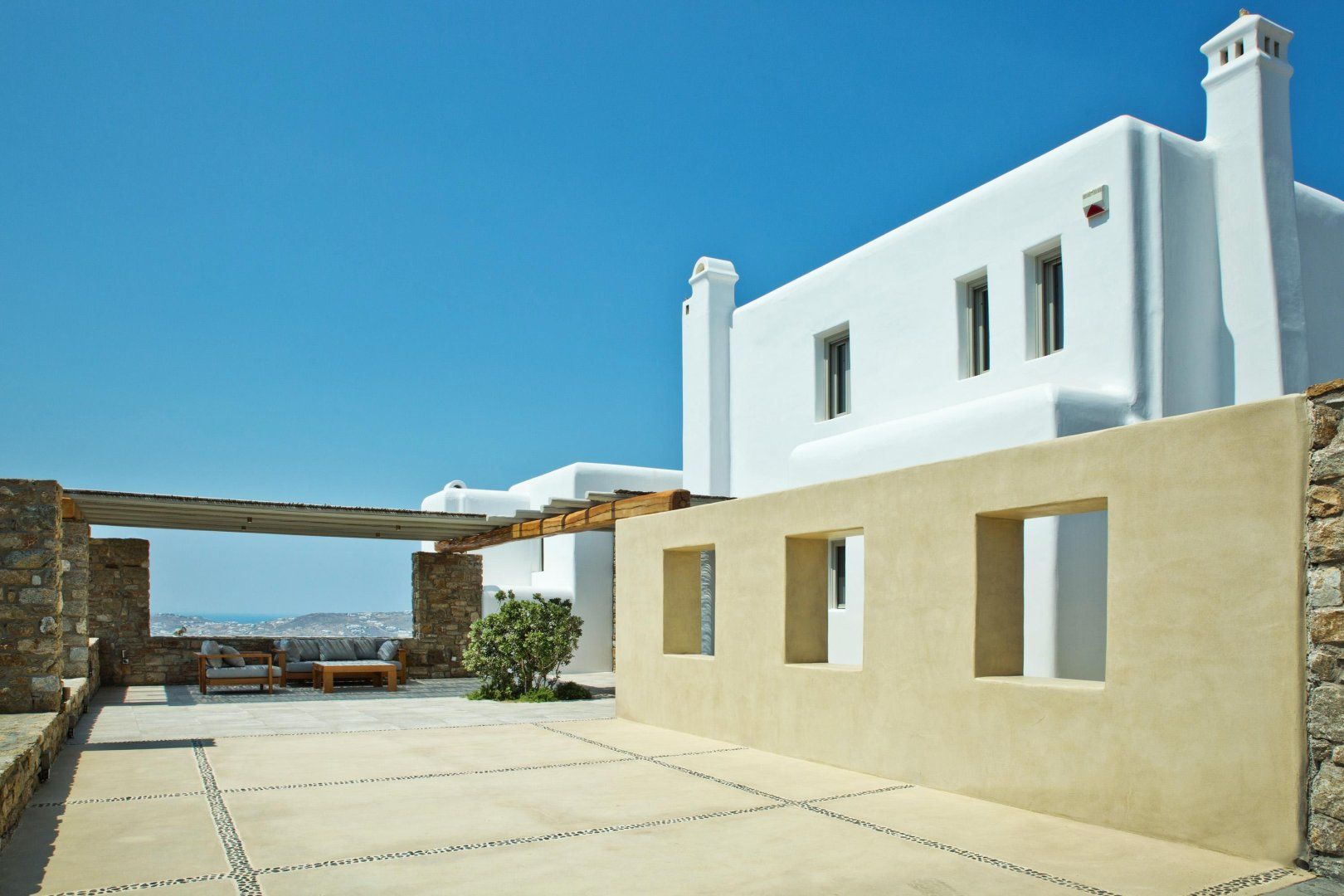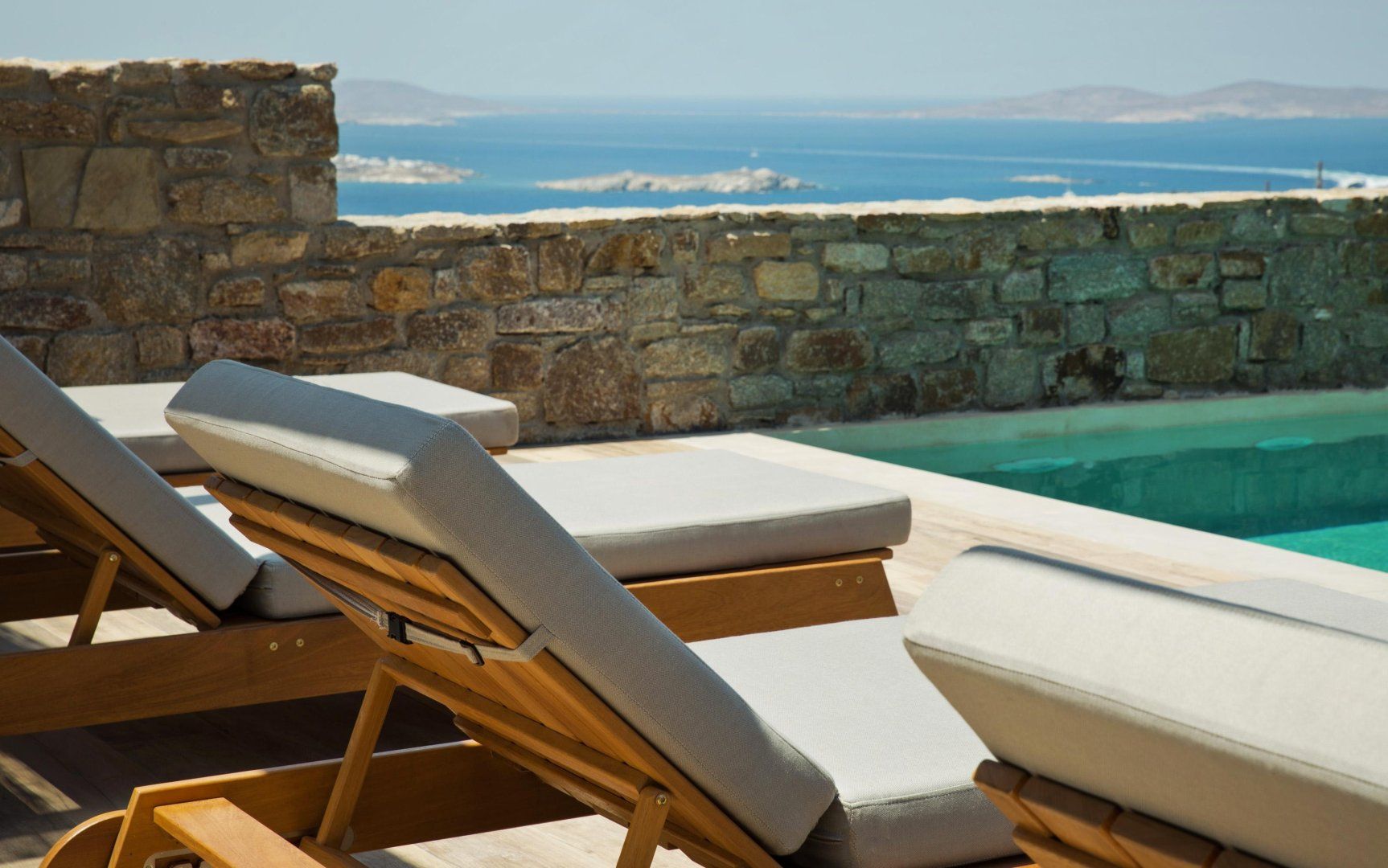 White as a wedding cake against a forget-me-not-blue sky, this Mykonos villa sits on a coastal hilltop overlooking the Aegean Sea. Days are meant for the outdoors here, with myriad seating nooks and terraces furnished with outdoor sofas to while away the hours. Each spot takes advantage of the stunning sea view, out over the Aegean to the island of Rineia. Perhaps the L-shaped pool with its infinity edge is the best place to watch the boats go by.