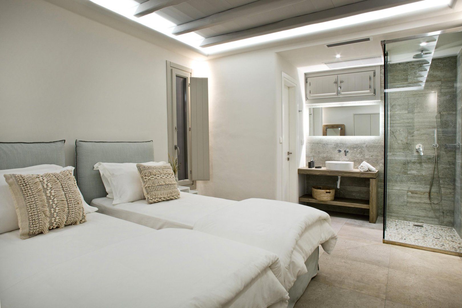Although you’re out in the quiet hills of inland Mykonos here, it’s just a ten-minute drive into the heart of Mykonos town where cocktail bars buzz to life at night and the narrow streets are packed with cafés, bars and shops backing onto the water.