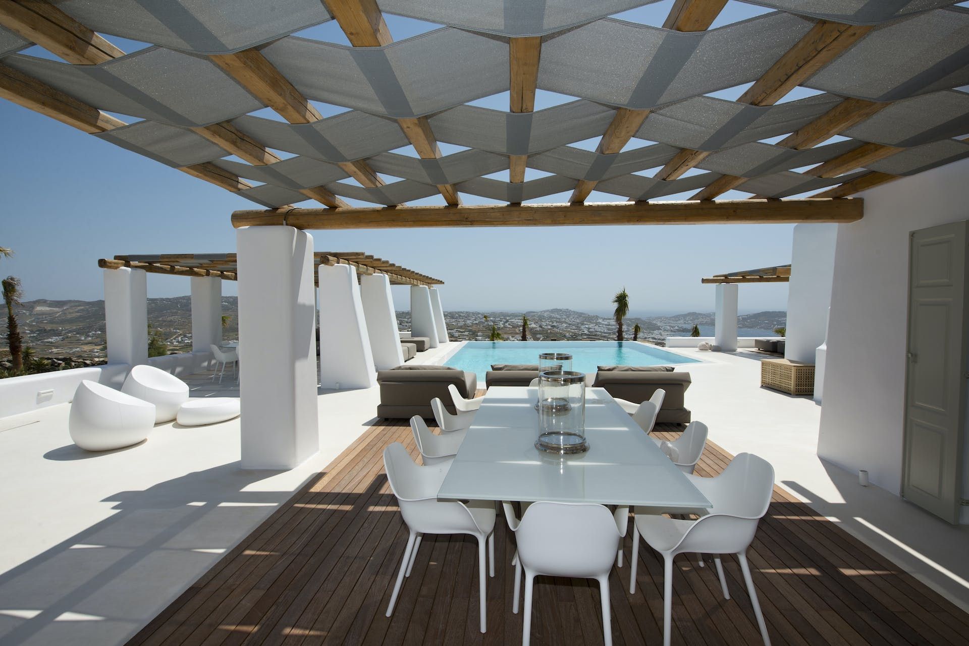 Tucked away in the hills above Tourlos, this sprawling villa couldn't be better suited for your next luxurious group getaway to the effortlessly chic island of Mykonos.