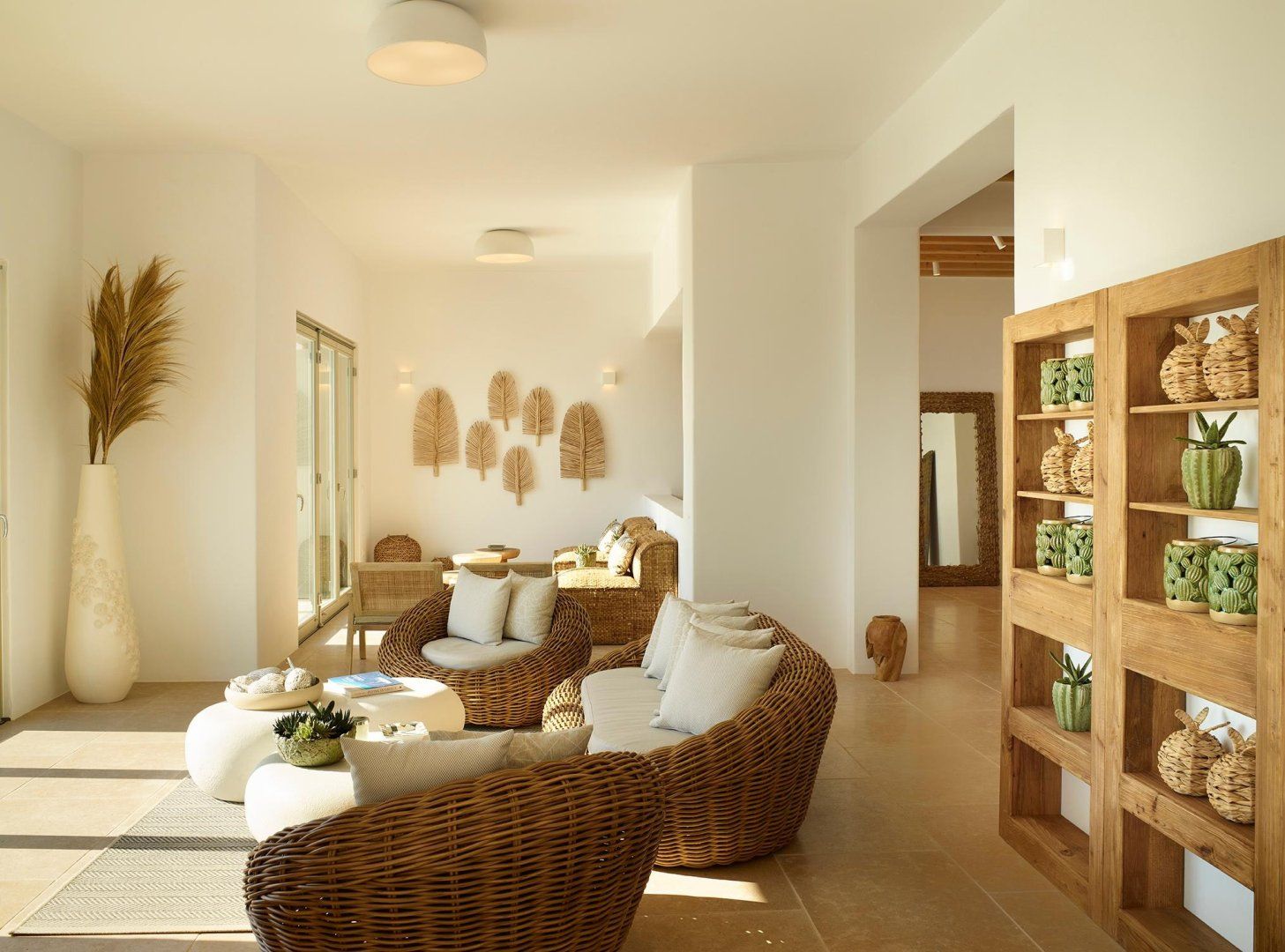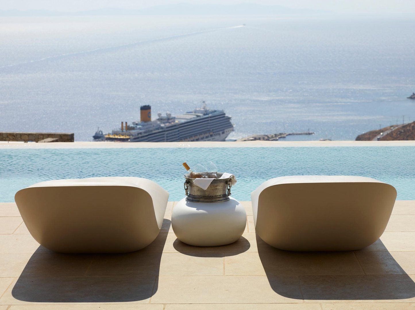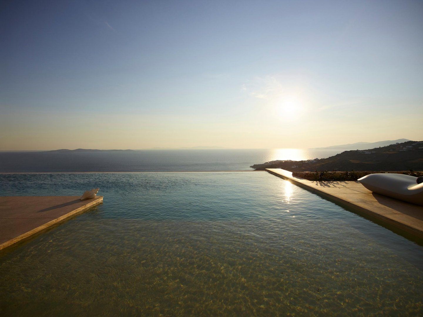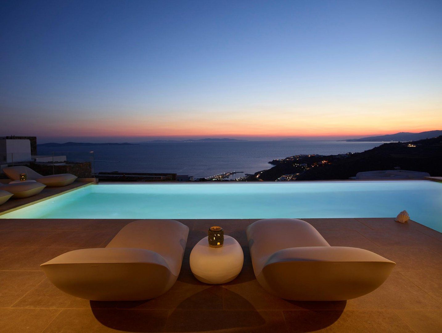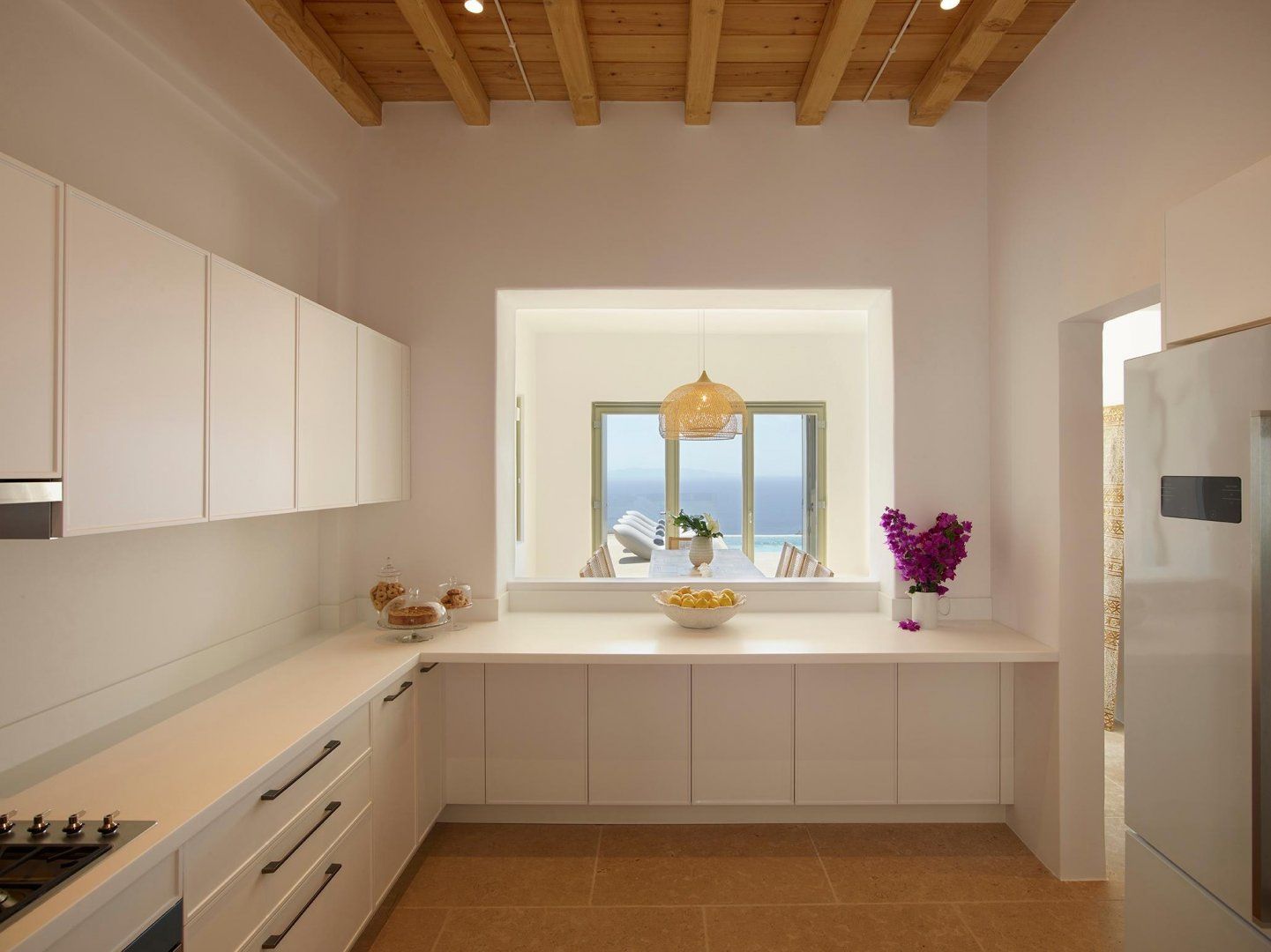 The interiors are a haven of calm, thanks to the chic colour scheme and natural textures throughout. The stylish dining table is perfect for long, lavish meals, while the wicker seating has great views across the water. Slide open the patio doors and head outside to take a better look, then pull up a sun lounger and kick back to relax in style. When the temperature rises, you can take a dip in the sparkling swimming pool, and evening drinks are best served on the balcony as the sun goes down across the sea.
