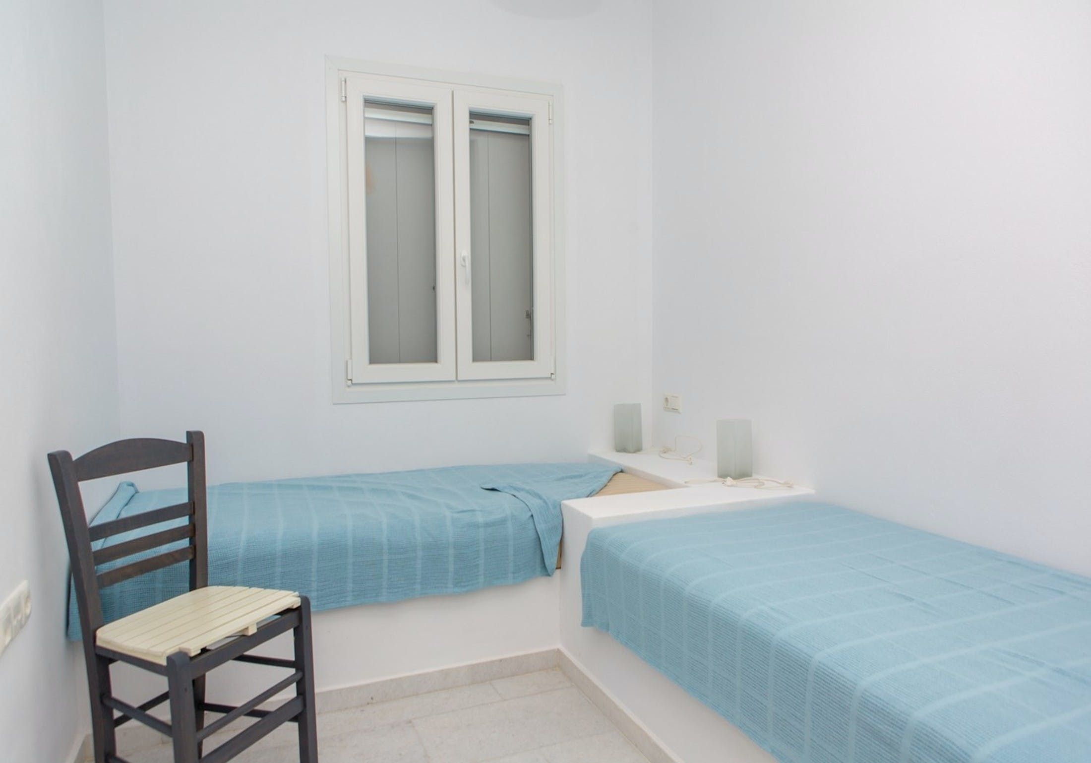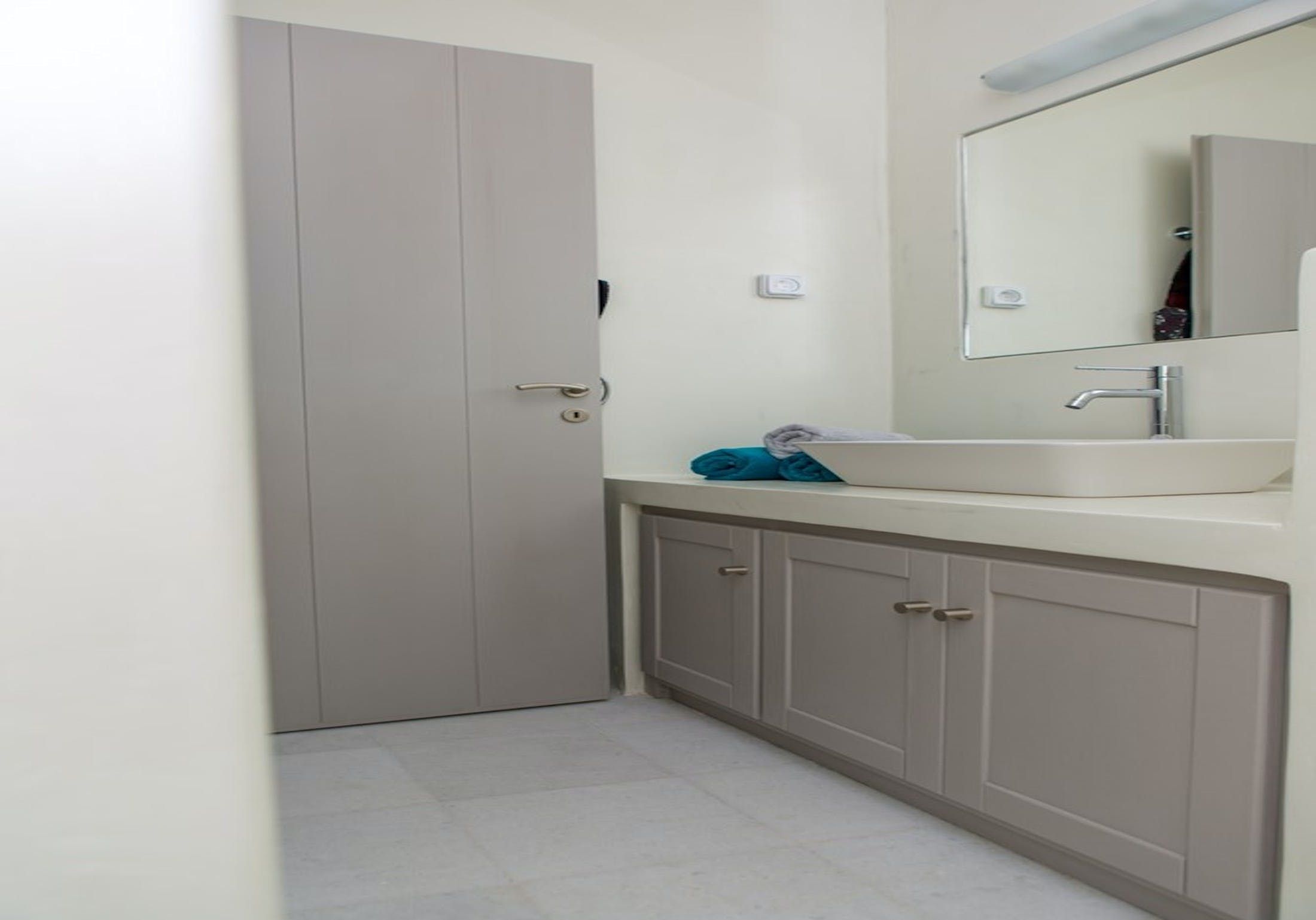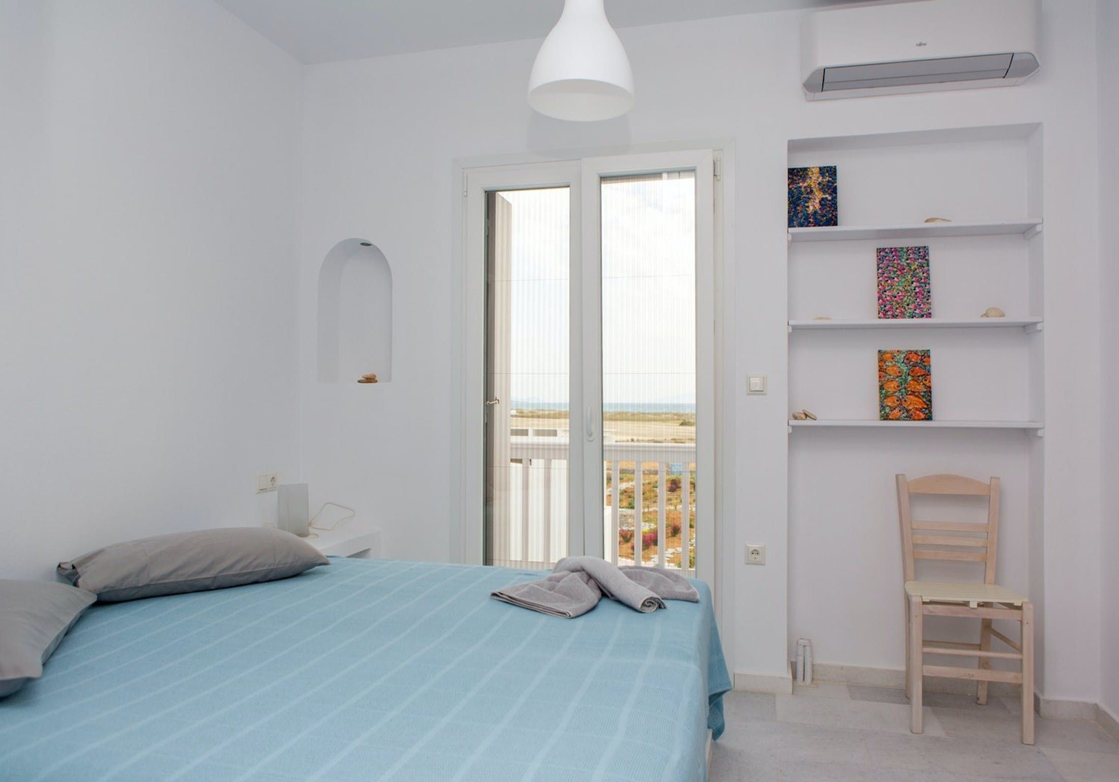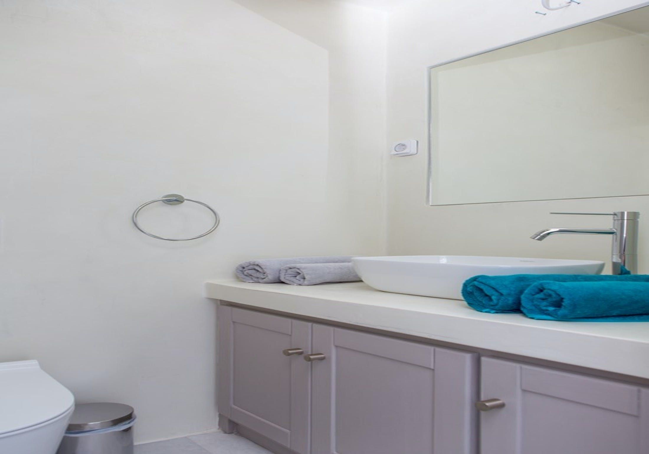 The second level of the villa comprises two bedrooms with double beds and single beds, each equipped with a TV, air conditioning, and a balcony with gorgeous sea and mountain views.