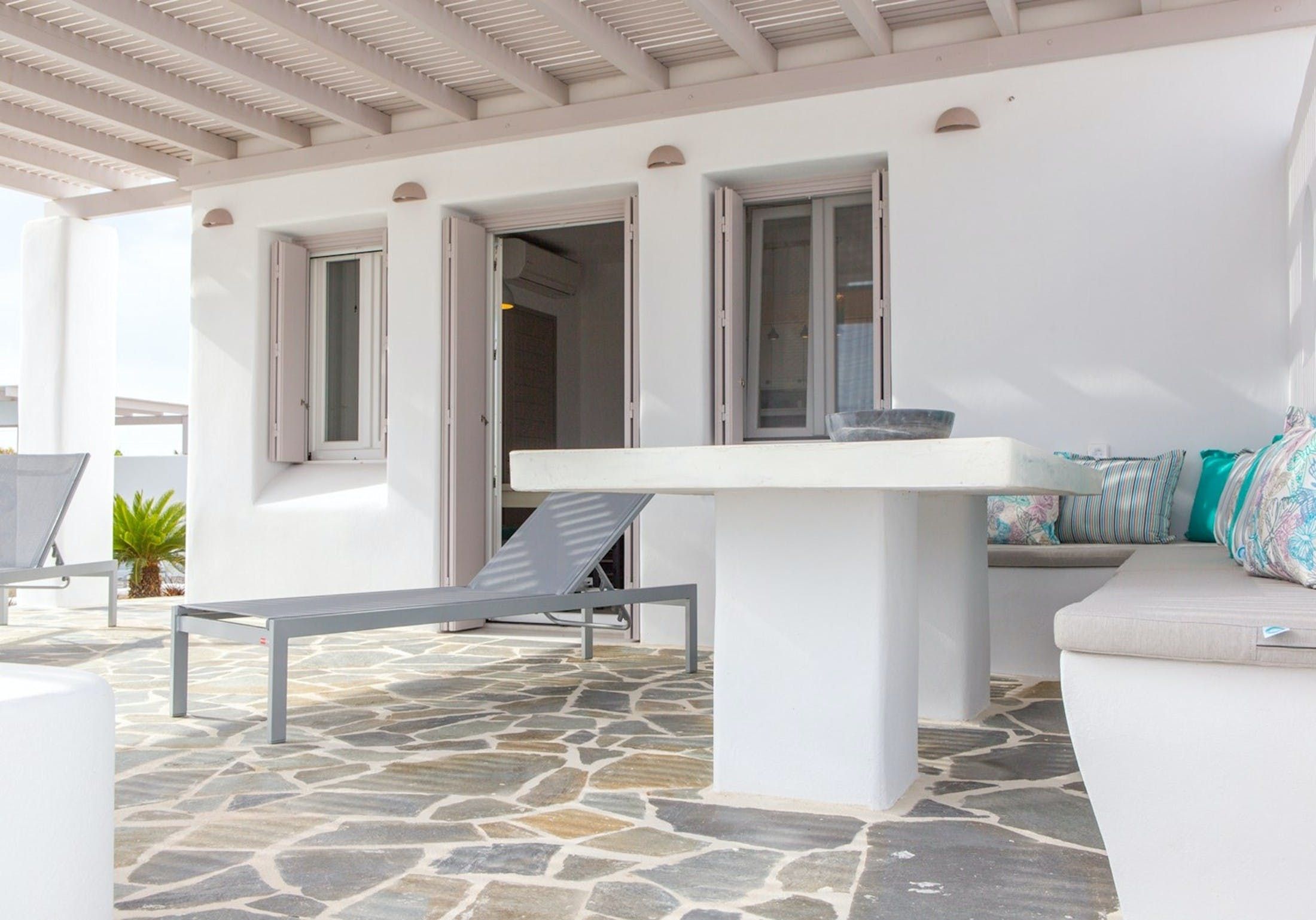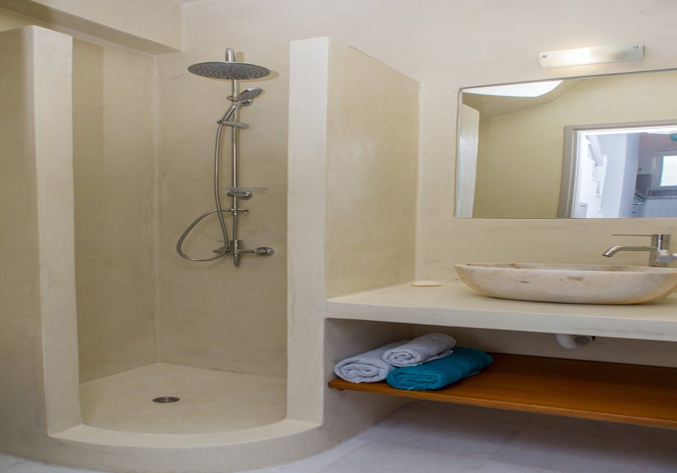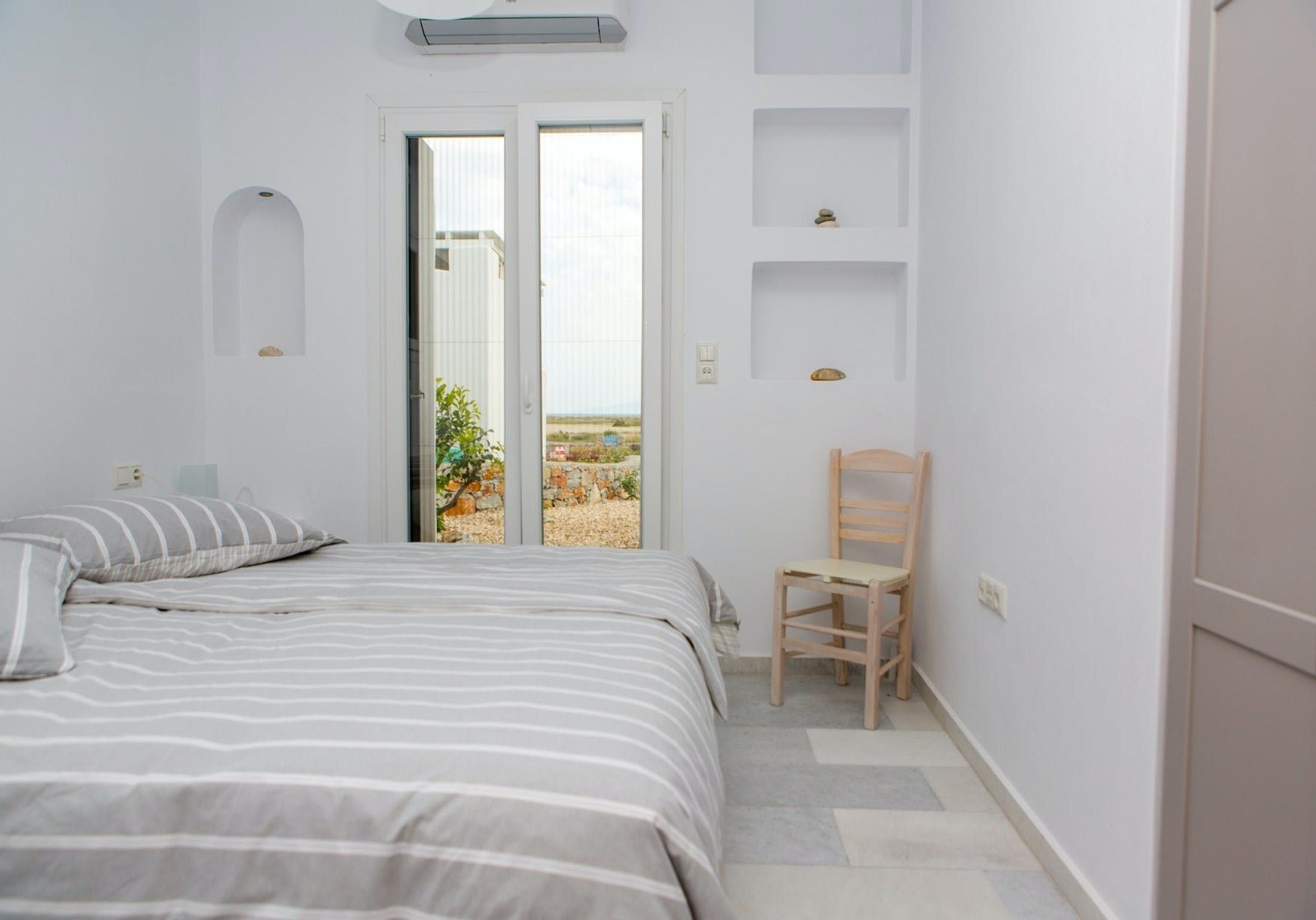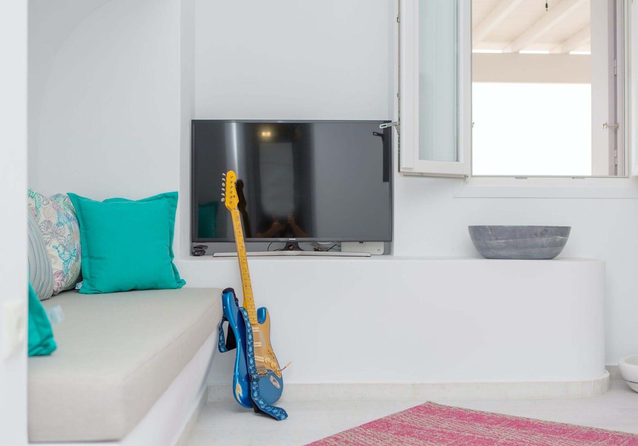 The second level of the villa comprises two bedrooms with double beds and single beds, each equipped with a TV, air conditioning, and a balcony with gorgeous sea and mountain views.