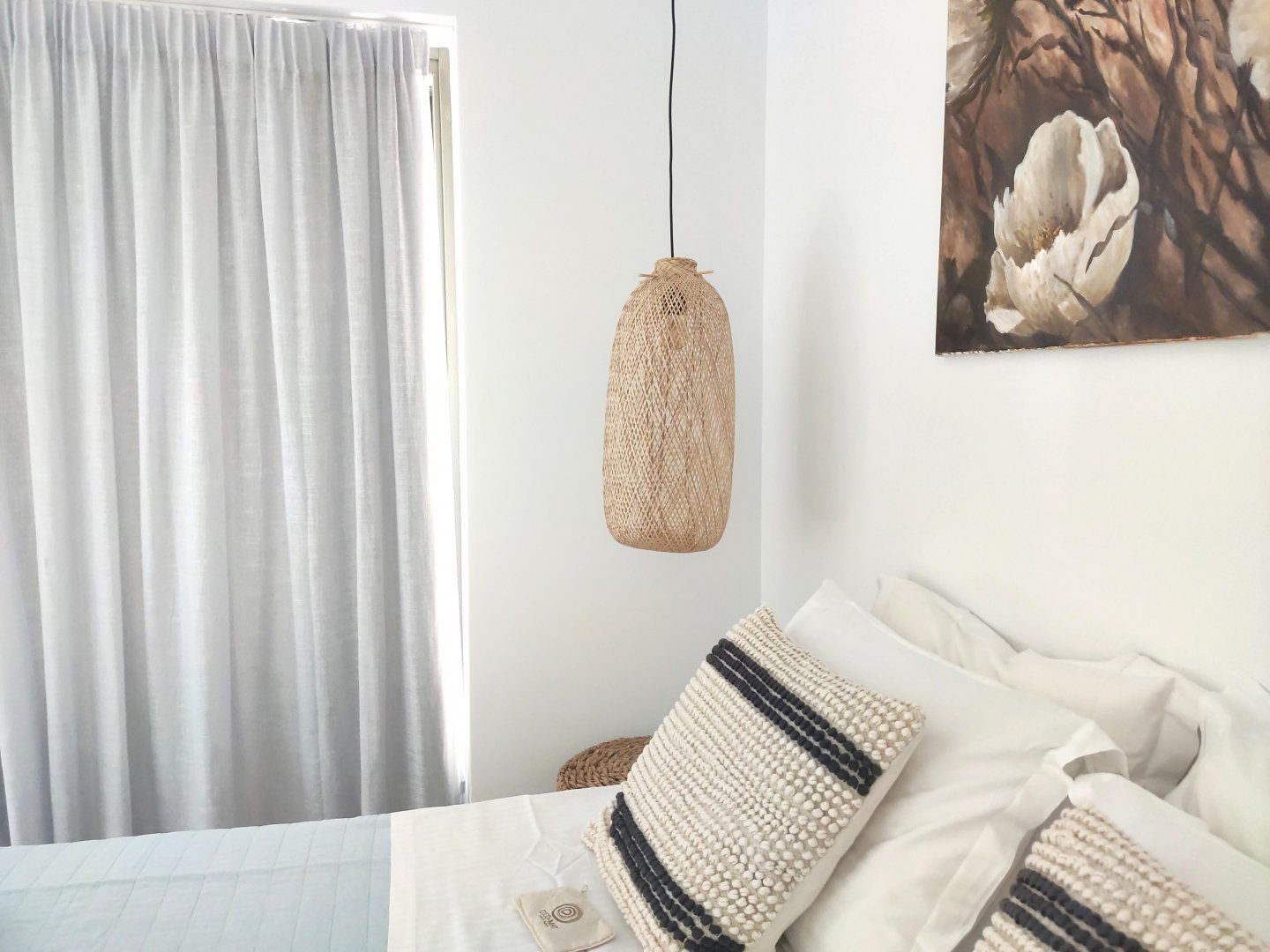 The interior features a monochromatic colour scheme softened with natural timber and wicker. There’s an understated bohemian vibe, with a real focus on gathering as a group to enjoy each other’s company. A beautiful outdoor dining area is softly lit, allowing the focus to be on the view – it’s magnificent when the sun sets.