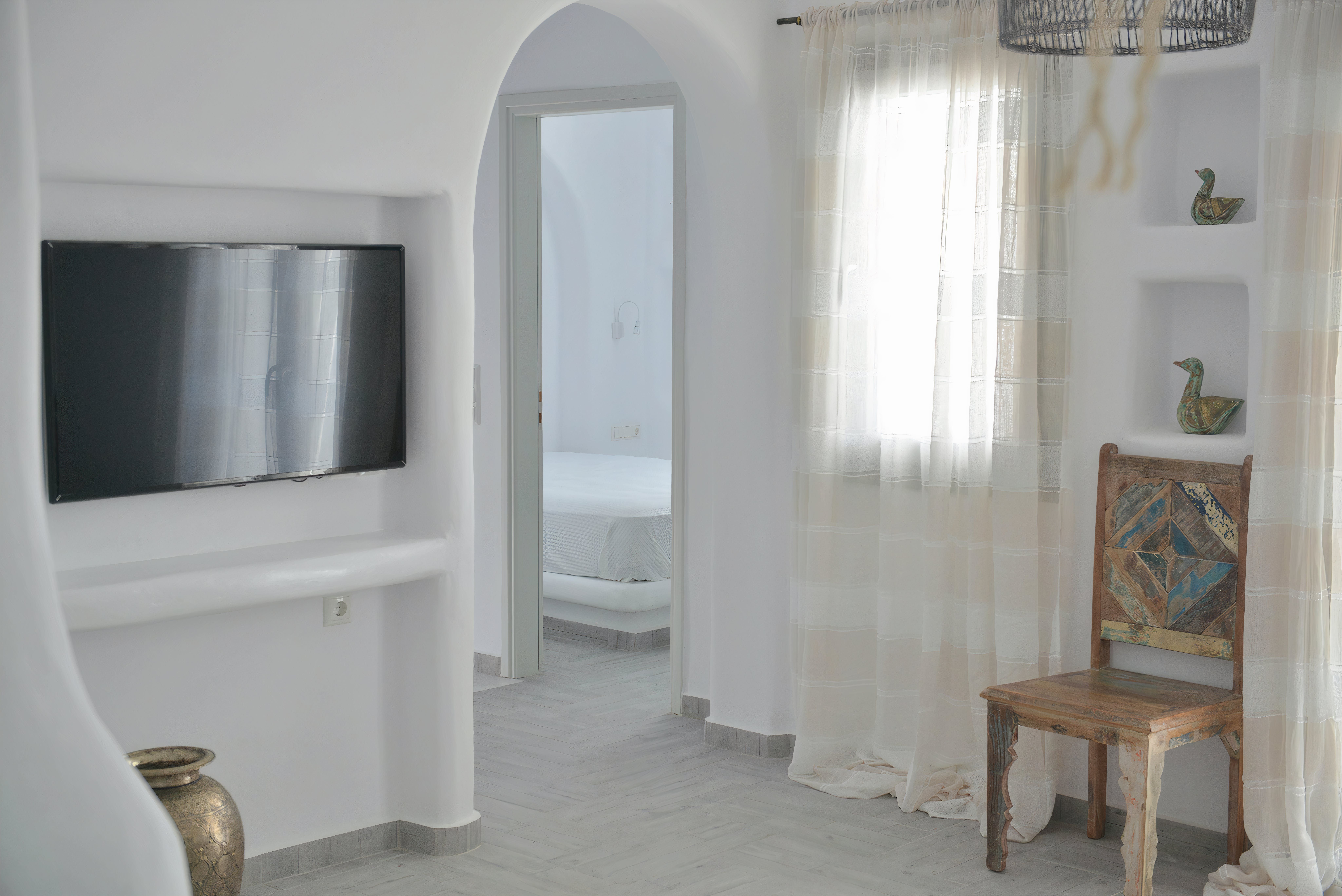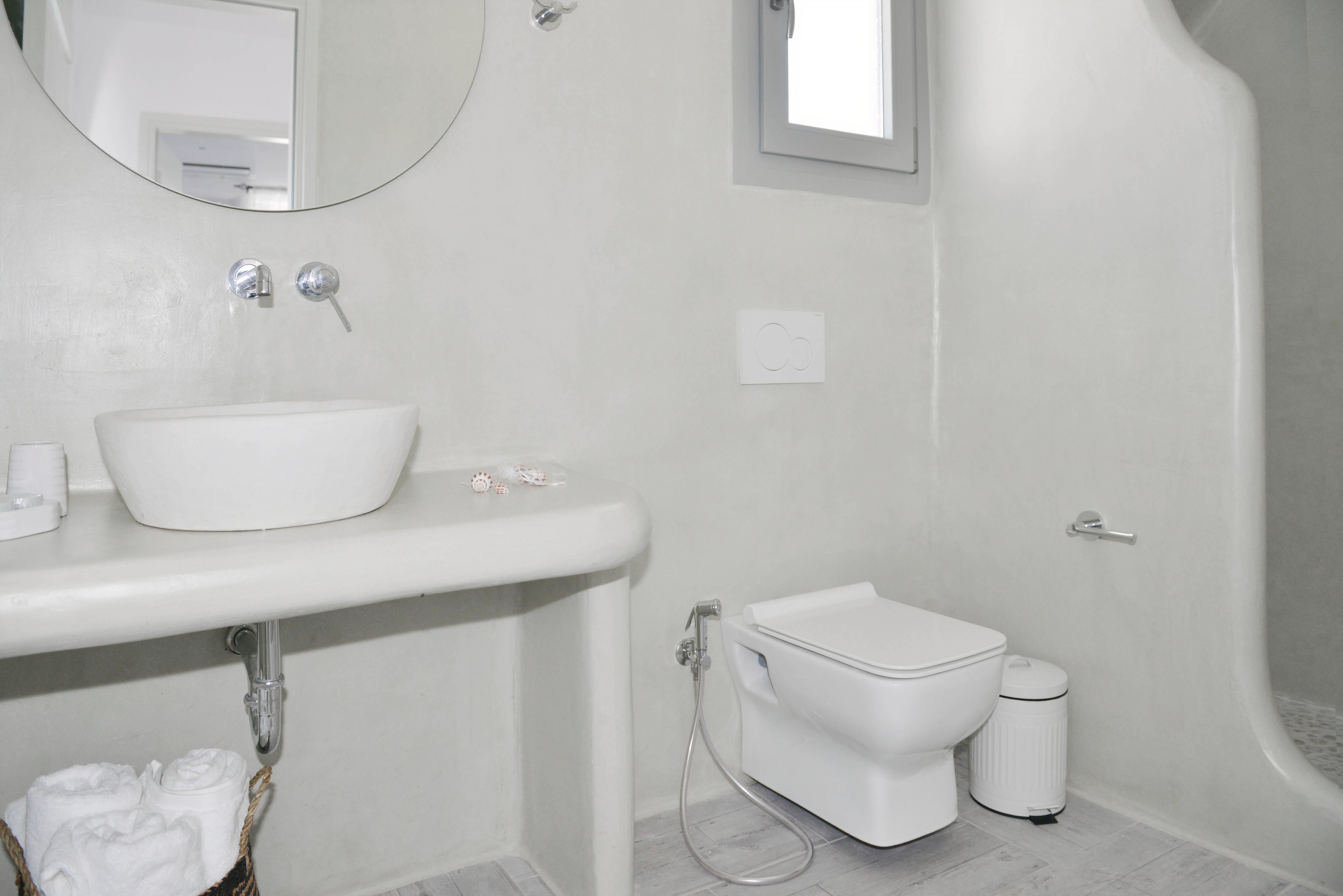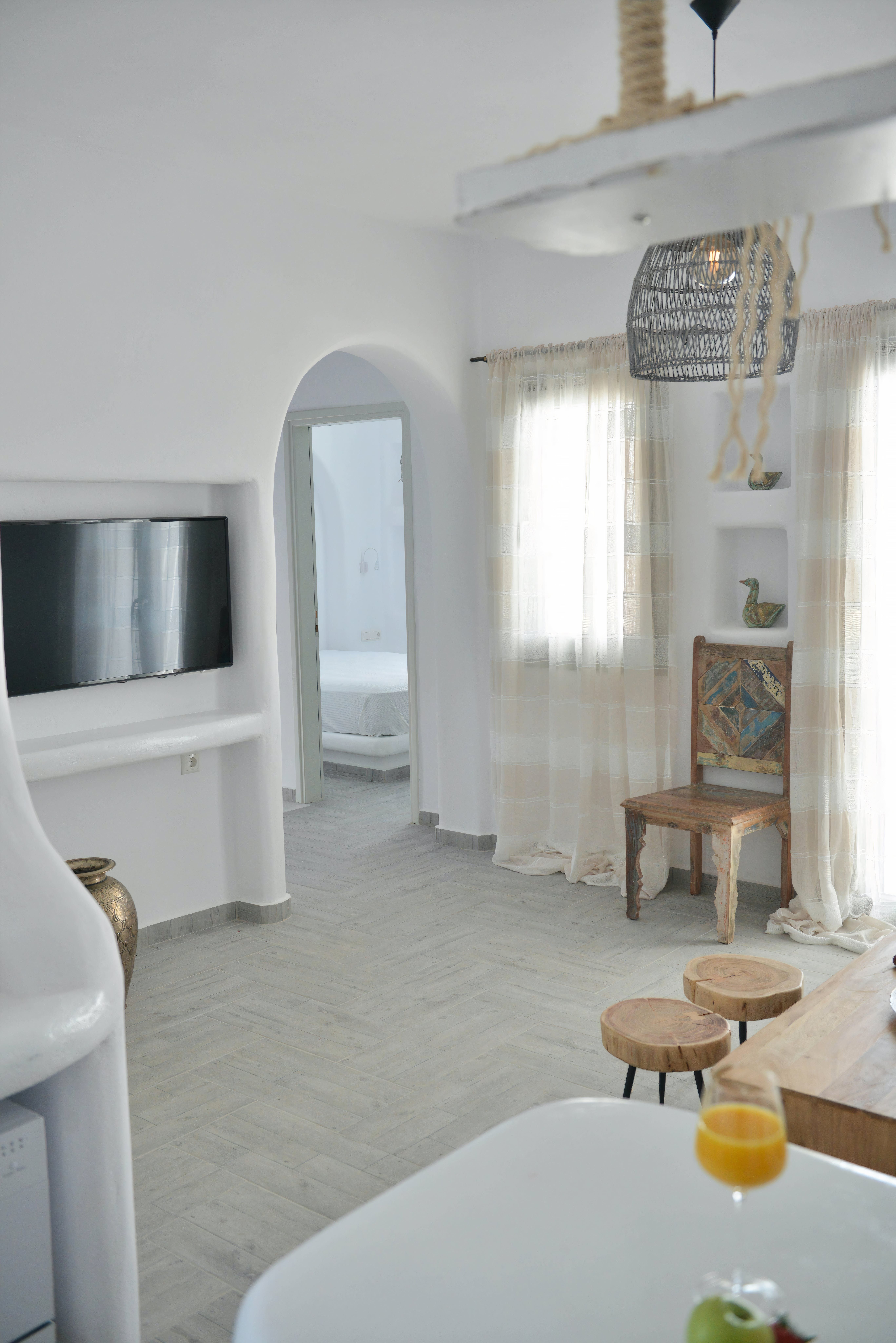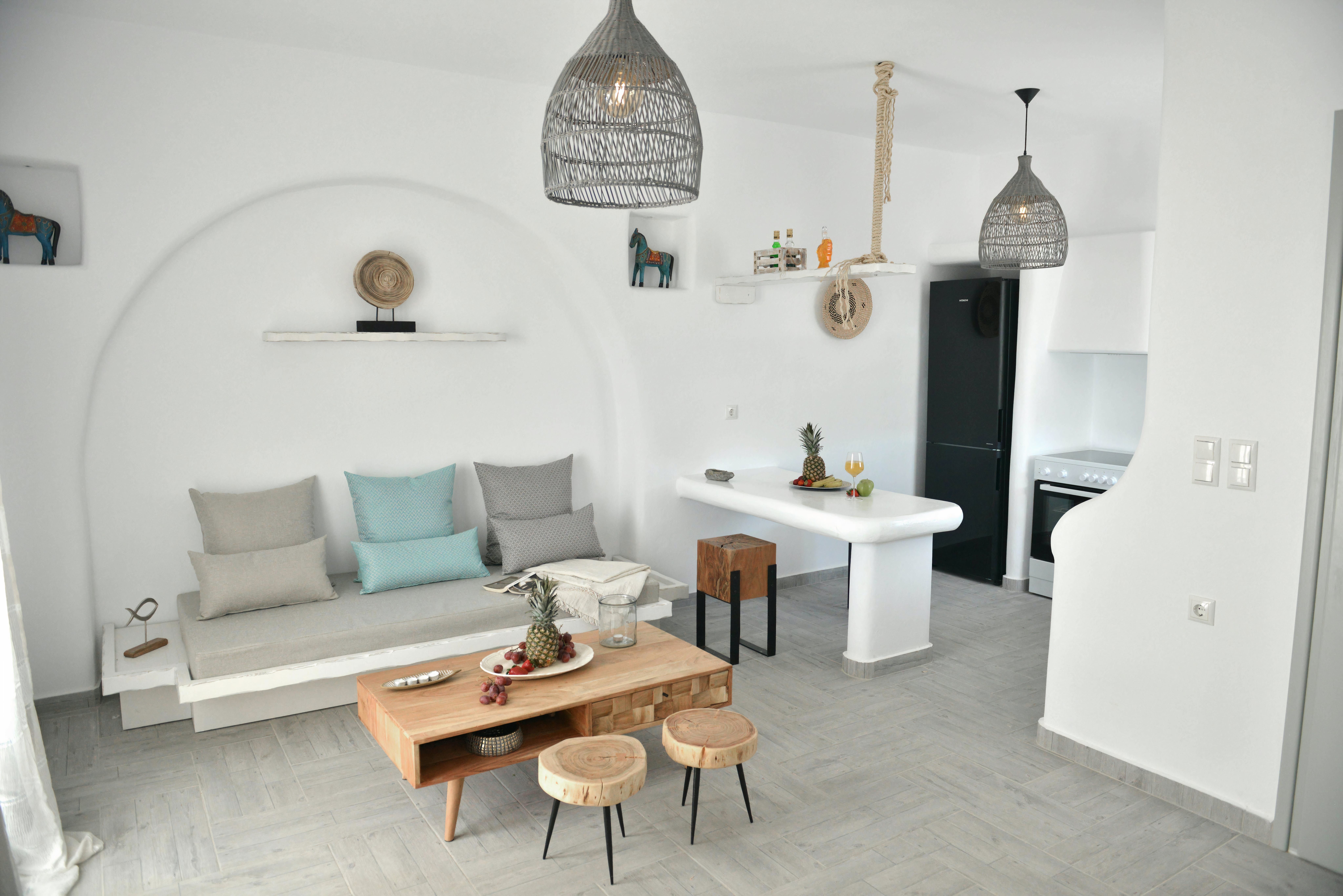 Inside the home, you're treated to plenty of curves and organic shapes that lend the space a warm, hand-finished feeling. Comfy seating areas both inside and out ensure that there's always a corner you can claim as your own, while the Jacuzzi pool and outdoor shower are perfect for cooling off beneath cloudless Cycladic skies.
