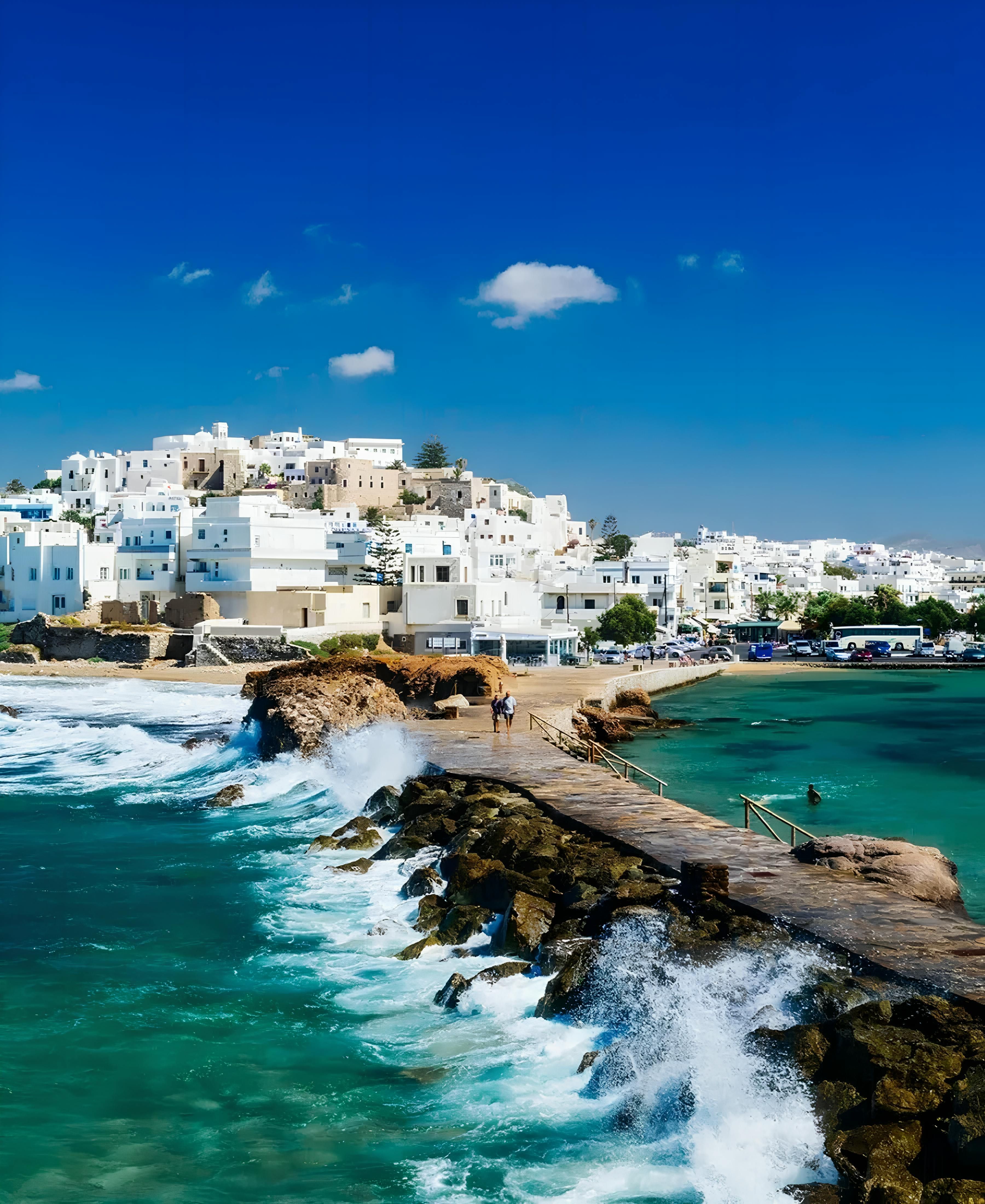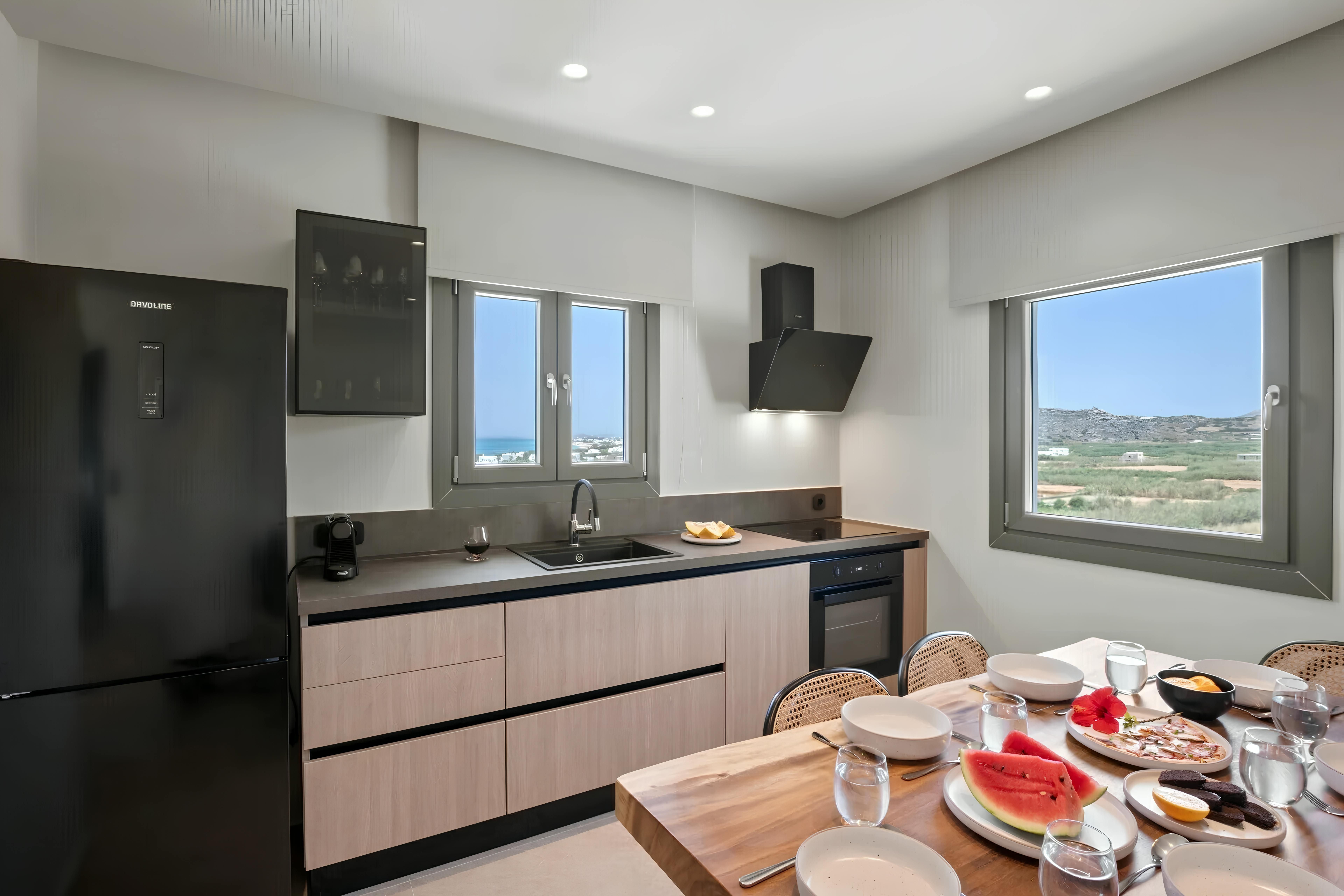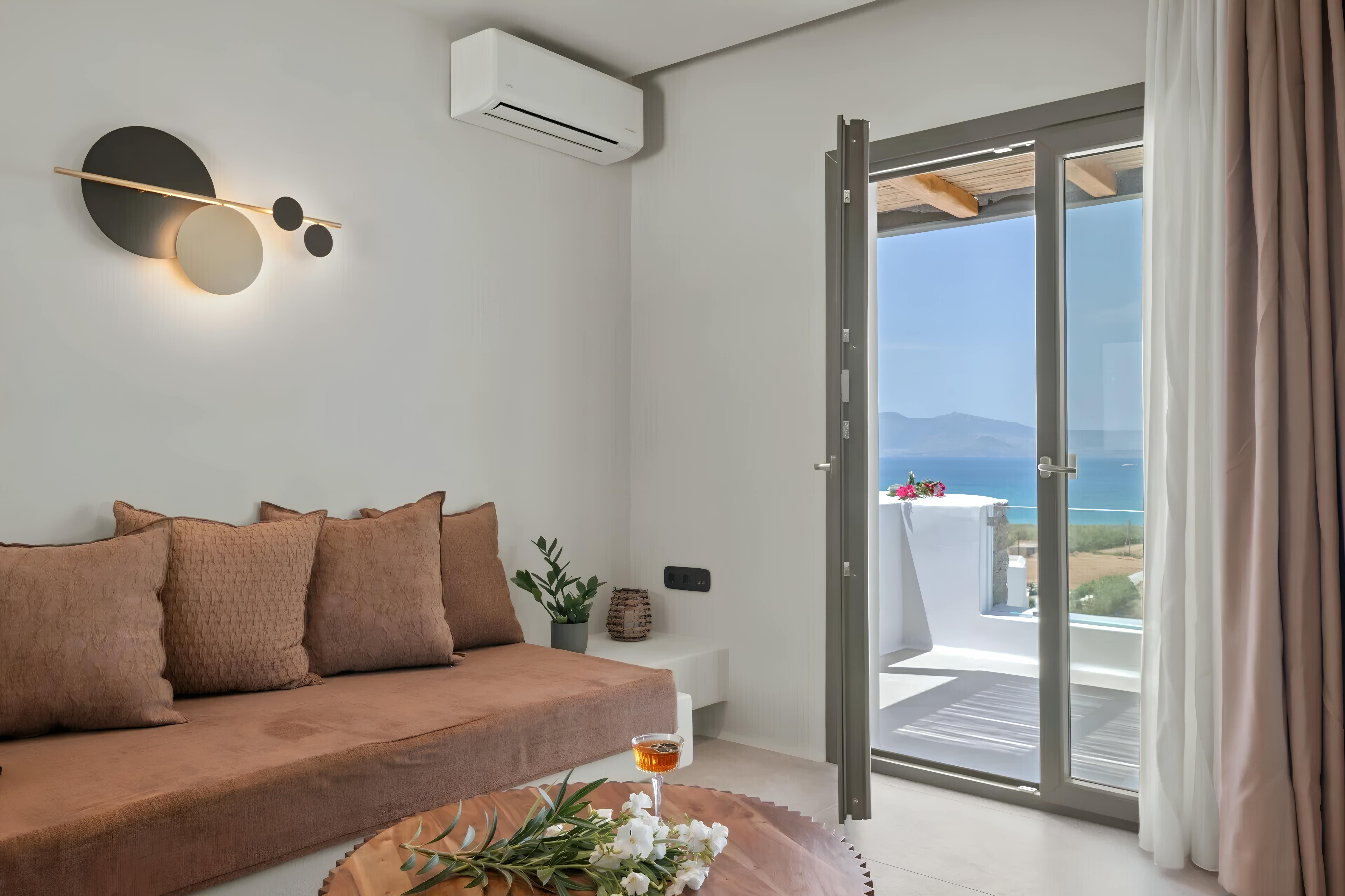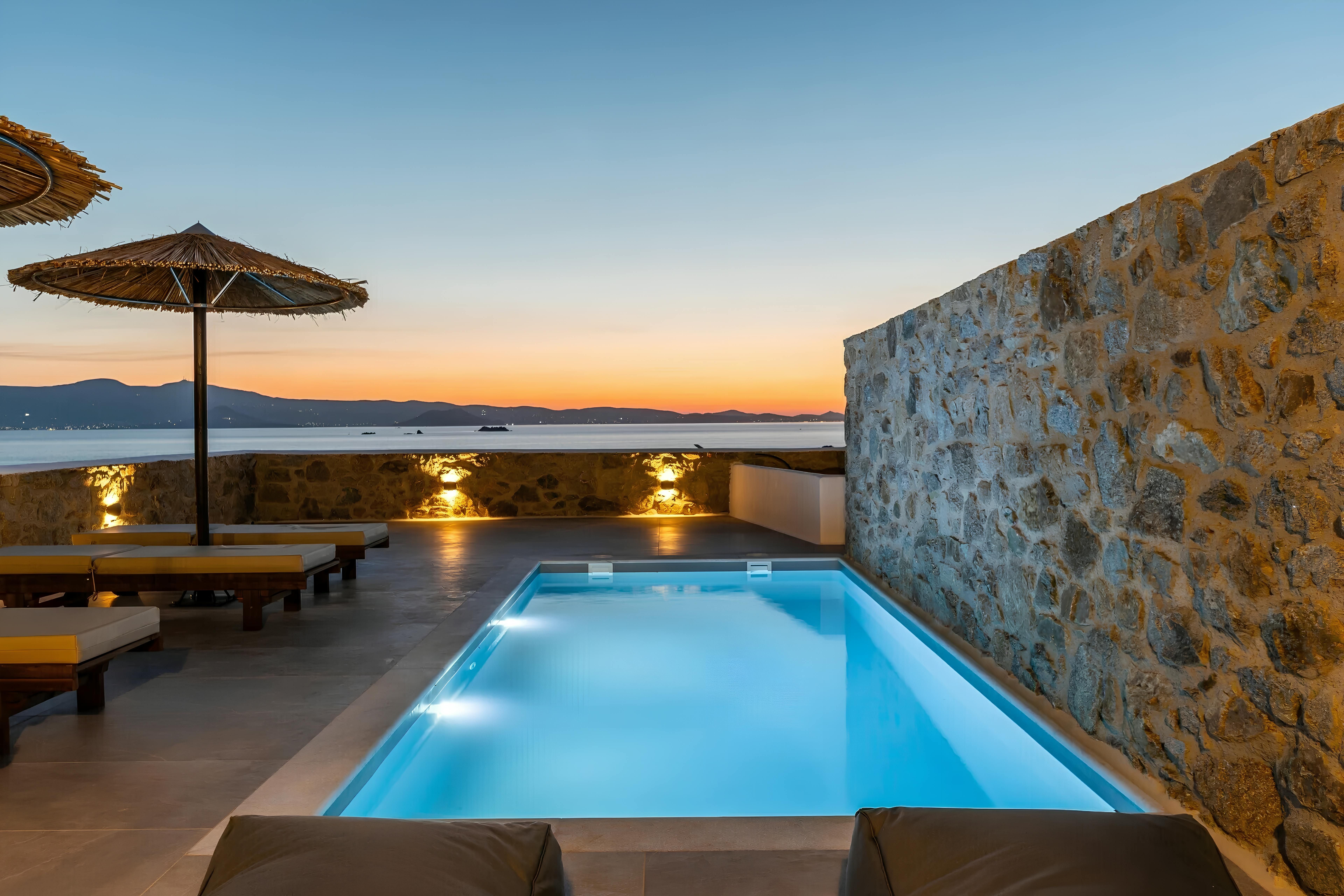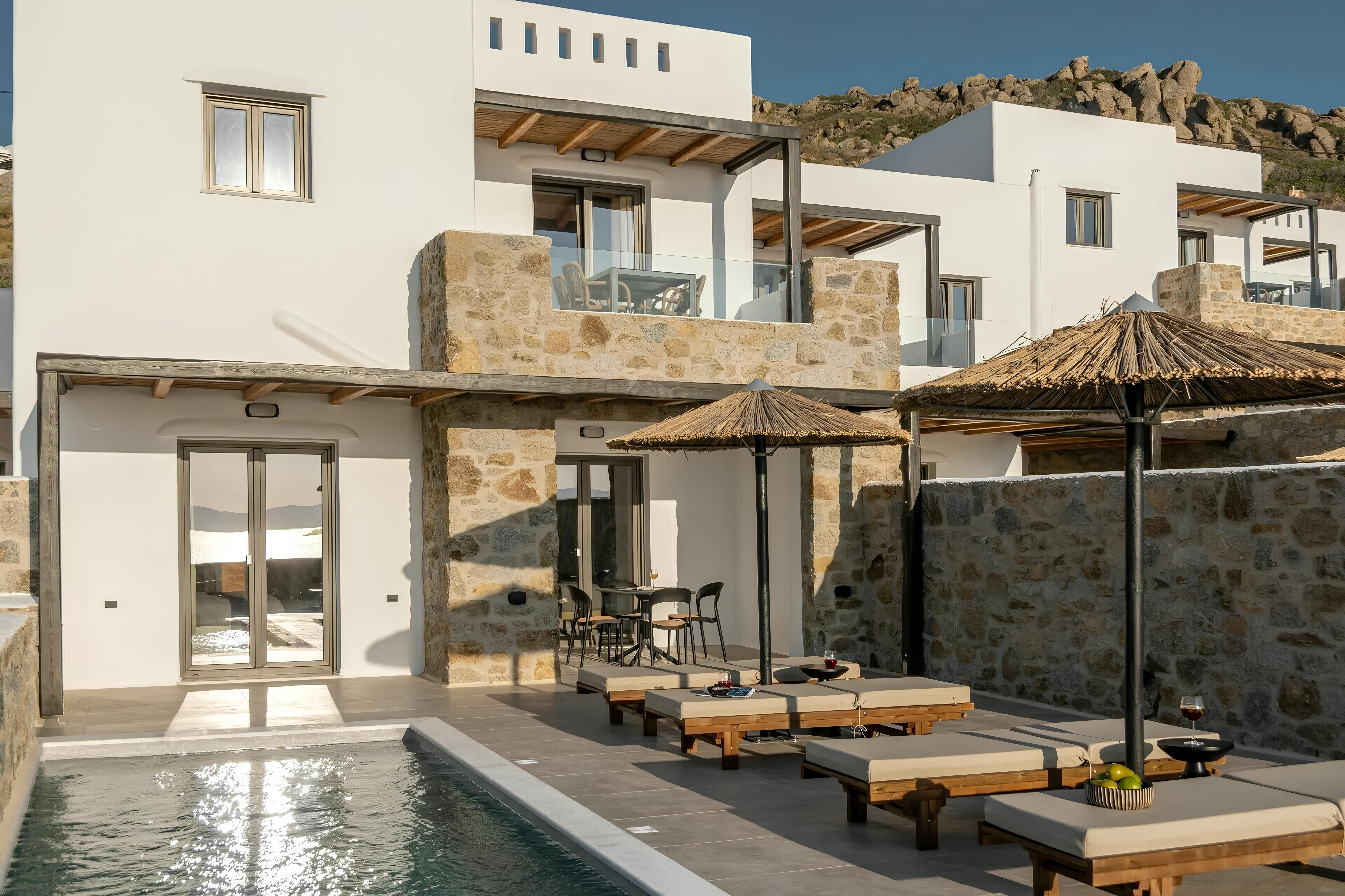 Located moments from the golden sands of Plaka Beach, this villa pairs Cycladic charm with contemporary comforts. It's set across two levels, with a balcony looking out over the sea and light-filled living spaces that open onto a terrace. Out on the patio, a private pool, shaded dining area and even more sea views await, setting you up for slow days in the sun. When you're ready to explore a little further, the shoreline, tavernas and beach bars are within easy reach, making this home an easy base for your next Grecian escape.