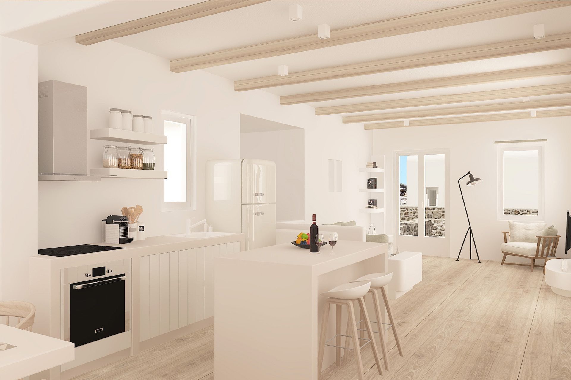 Inside, the villa is a vision in white. Cool and calm, it’s a lovely space to return to after days spent in the sunshine. Plaka Beach is a nineteen-minute walk from the villa, so you can easily spend your days splashing around in the sea or building sandcastles, then return to the villa in time for sunset. Prepare cocktails to sip on the terrace as you watch the sky shift into pastel shades, then lie out watching the stars.