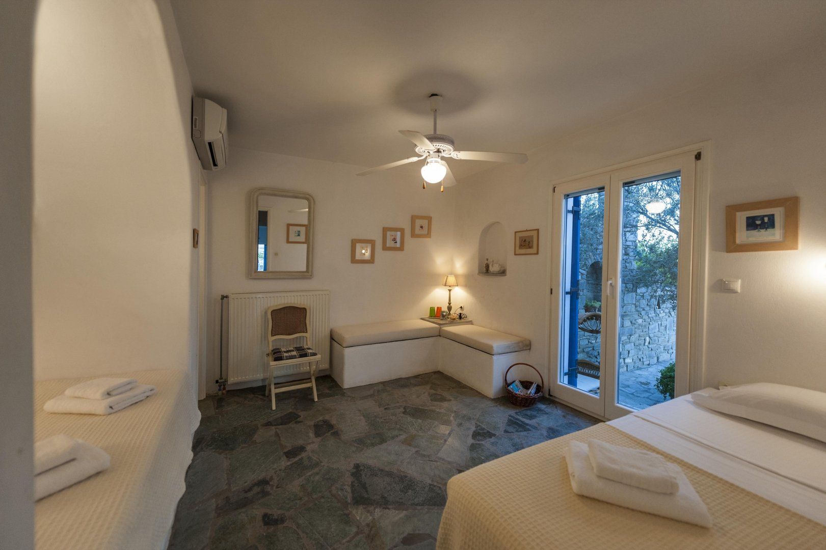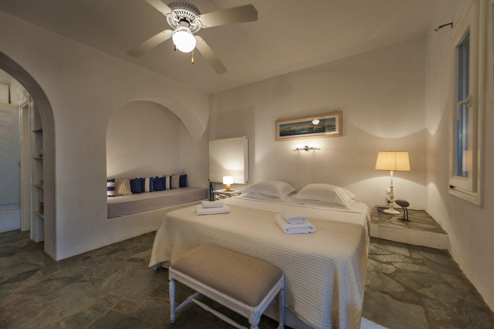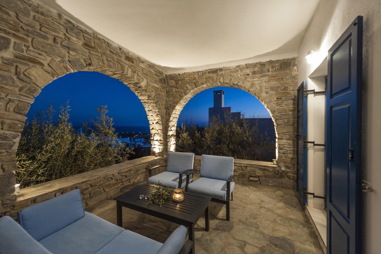 Fans of the seaside will be delighted that there are several beaches just a ten-minute drive away – including Lolantonis and Chrissi Akti. Lie back on the golden sands, or swim in the turquoise blue waters, before refueling at one of the local tavernas. The town of Parikia is just twenty-five kilometers away, where you will find gorgeous cobbled streets, tiny churches, and the white and blue architecture that the Greek islands are famous for.