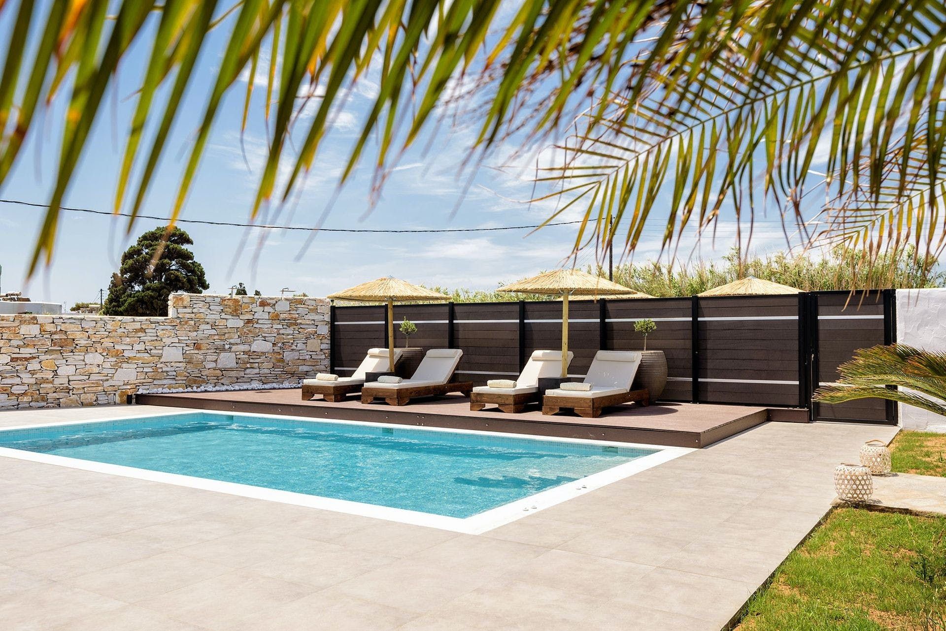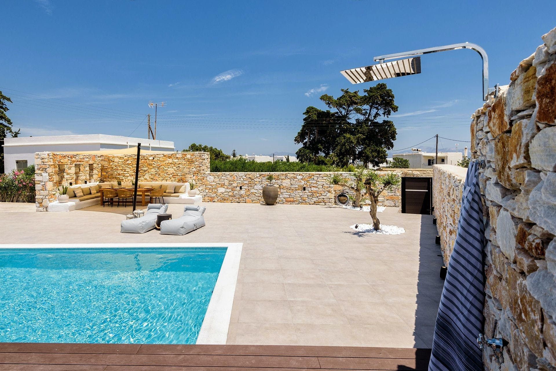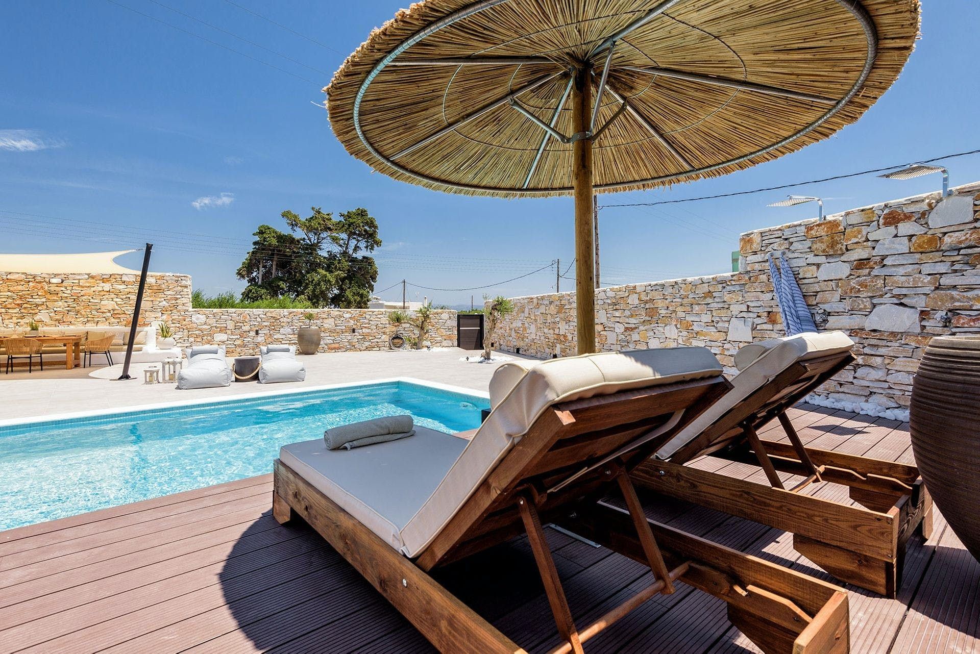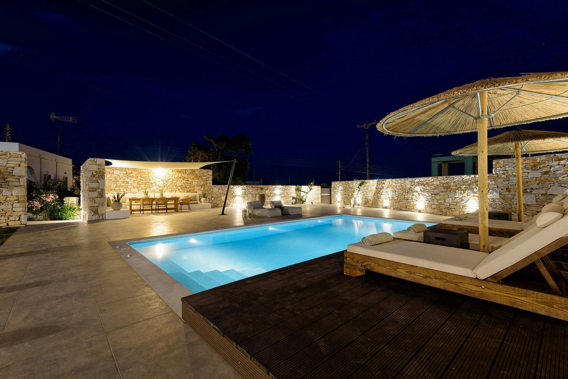 A beautiful villa in Drios, southeast of Paros Island, offers a serene oasis for up to 8 guests. Immerse yourself in the tranquility of this charming property with a private swimming pool and indulgent amenities. The mesmerizing counter-current swimming system and hydromassage in the pool will provide exercise and relaxation. Situated just 100m from Drios beach and 1km from the renowned Golden beach, enjoy the convenience of nearby restaurants, cafes, and mini markets. This spacious villa comprises three airy bedrooms, a fully equipped kitchen opening into the inviting living room, and two modern bathrooms. Take delight in the picturesque terrace overlooking mountain views. Revel in luxury amenities like daily maid service, concierge assistance, and complimentary Wi-Fi. Unwind in your private haven at Serene Oasis – an idyllic getaway for your Paros retreat.
