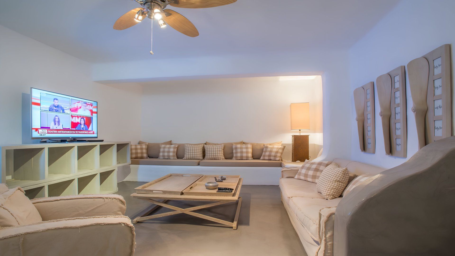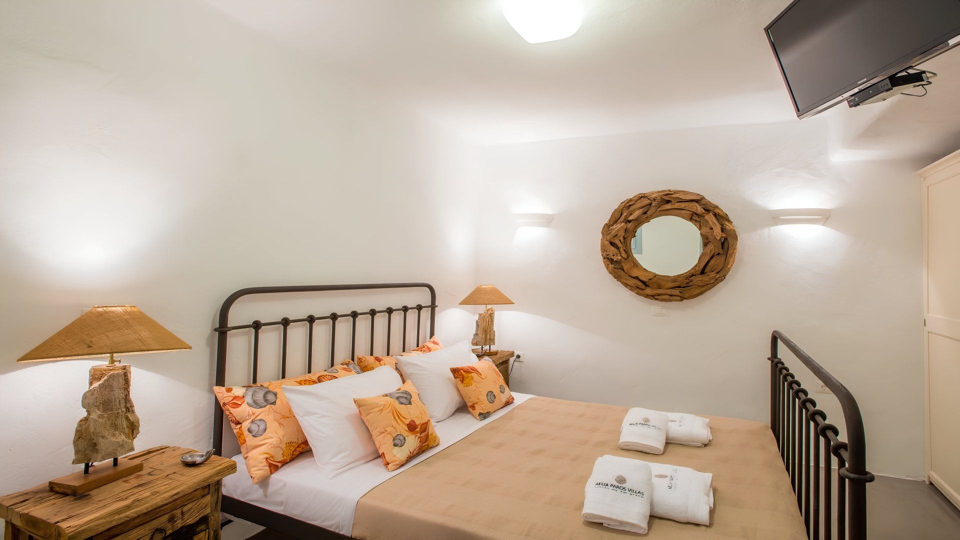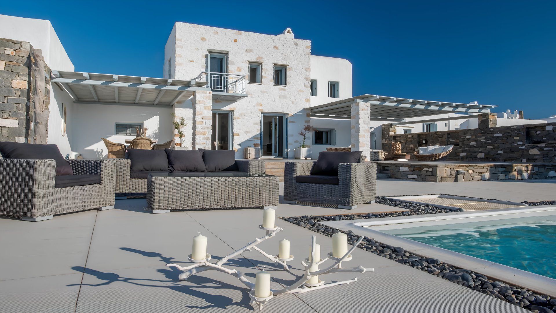 On Paros’ pristine coast, the terraces and balconies of this villa boast beautiful views of the Aegean Sea. There are plenty of places to enjoy a cold drink in the shade and guests here have access to a swimming pool shared with one other villa. Inside, the feel is beachy and bright. In addition to the more formal lounge, there’s a cosy TV room with long sofas lining the walls – perfect for kicking back after a day by the coast. Getting out to explore, you’ll find the beach at Chryssi Akti a short drive away and the buzzing little town of Noussa 10 kilometres from home.
