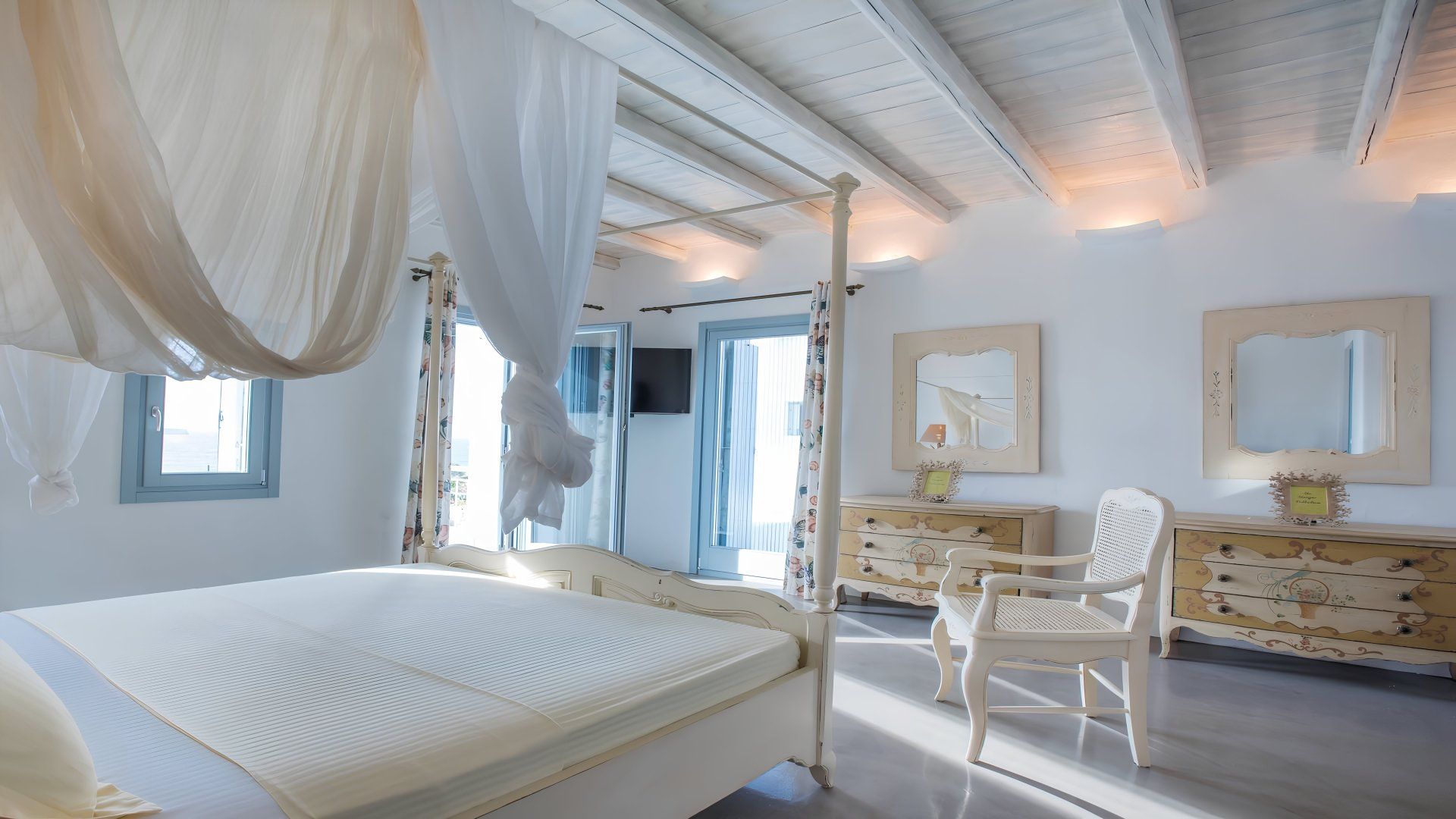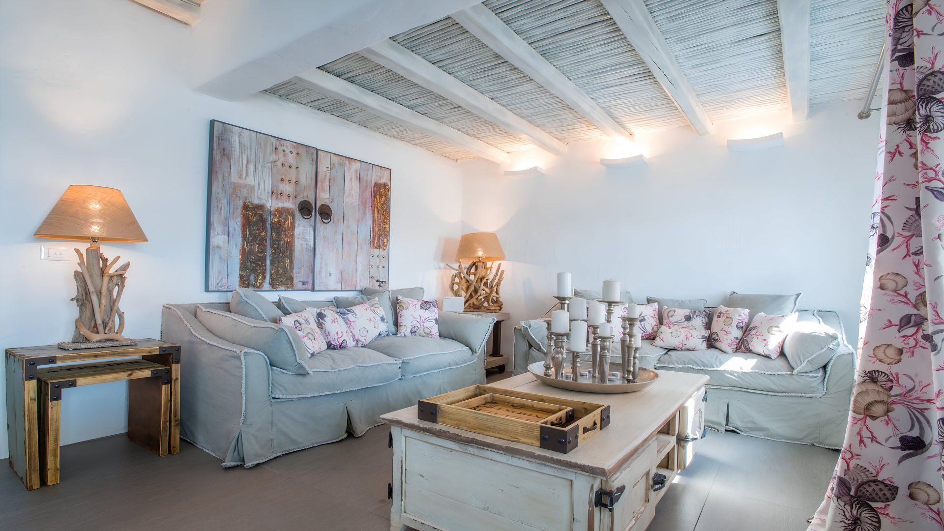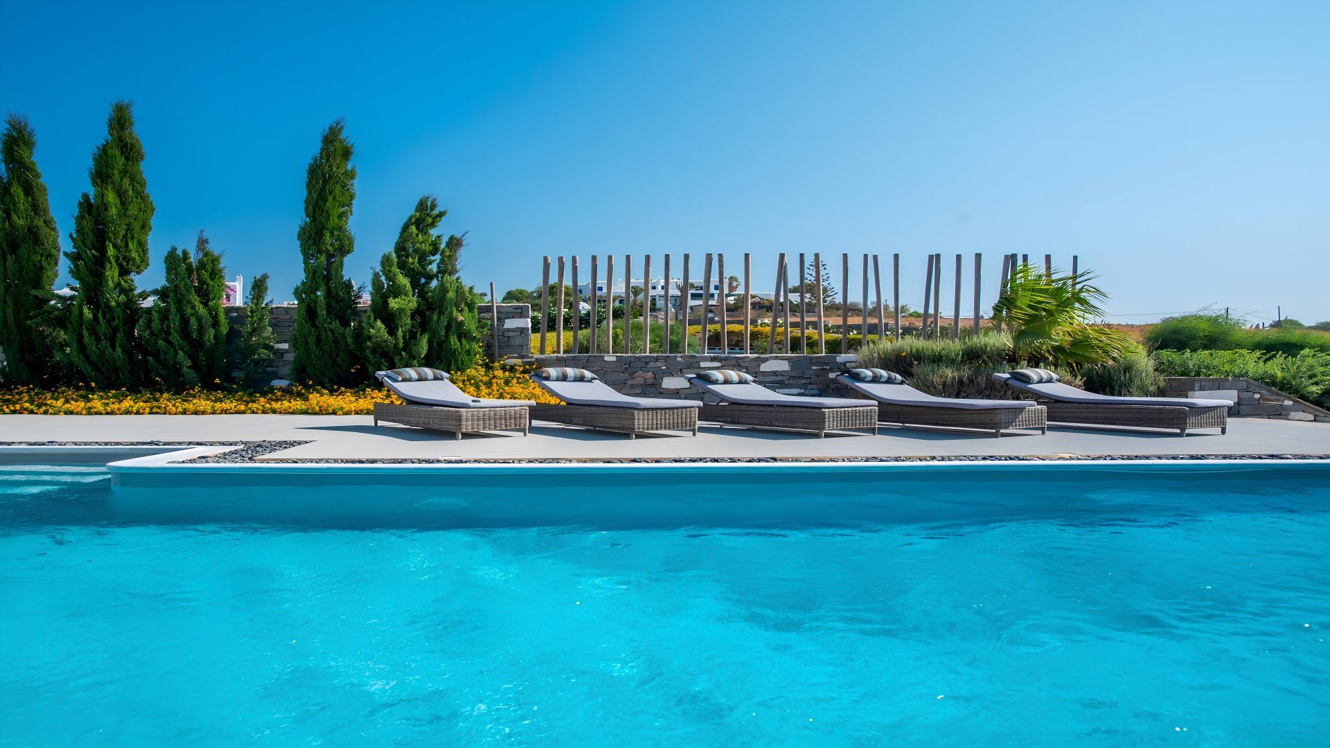 On Paros’ pristine coast, the terraces and balconies of this villa boast beautiful views of the Aegean Sea. There are plenty of places to enjoy a cold drink in the shade and guests here have access to a swimming pool shared with one other villa. Inside, the feel is beachy and bright. In addition to the more formal lounge, there’s a cosy TV room with long sofas lining the walls – perfect for kicking back after a day by the coast. Getting out to explore, you’ll find the beach at Chryssi Akti a short drive away and the buzzing little town of Noussa 10 kilometres from home.