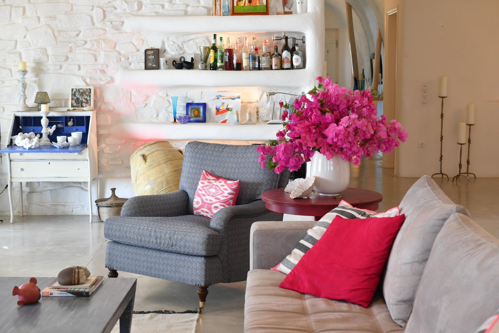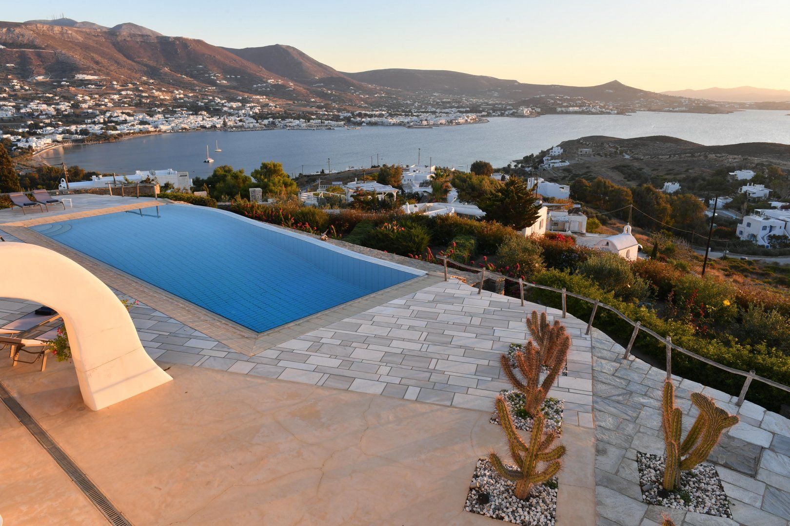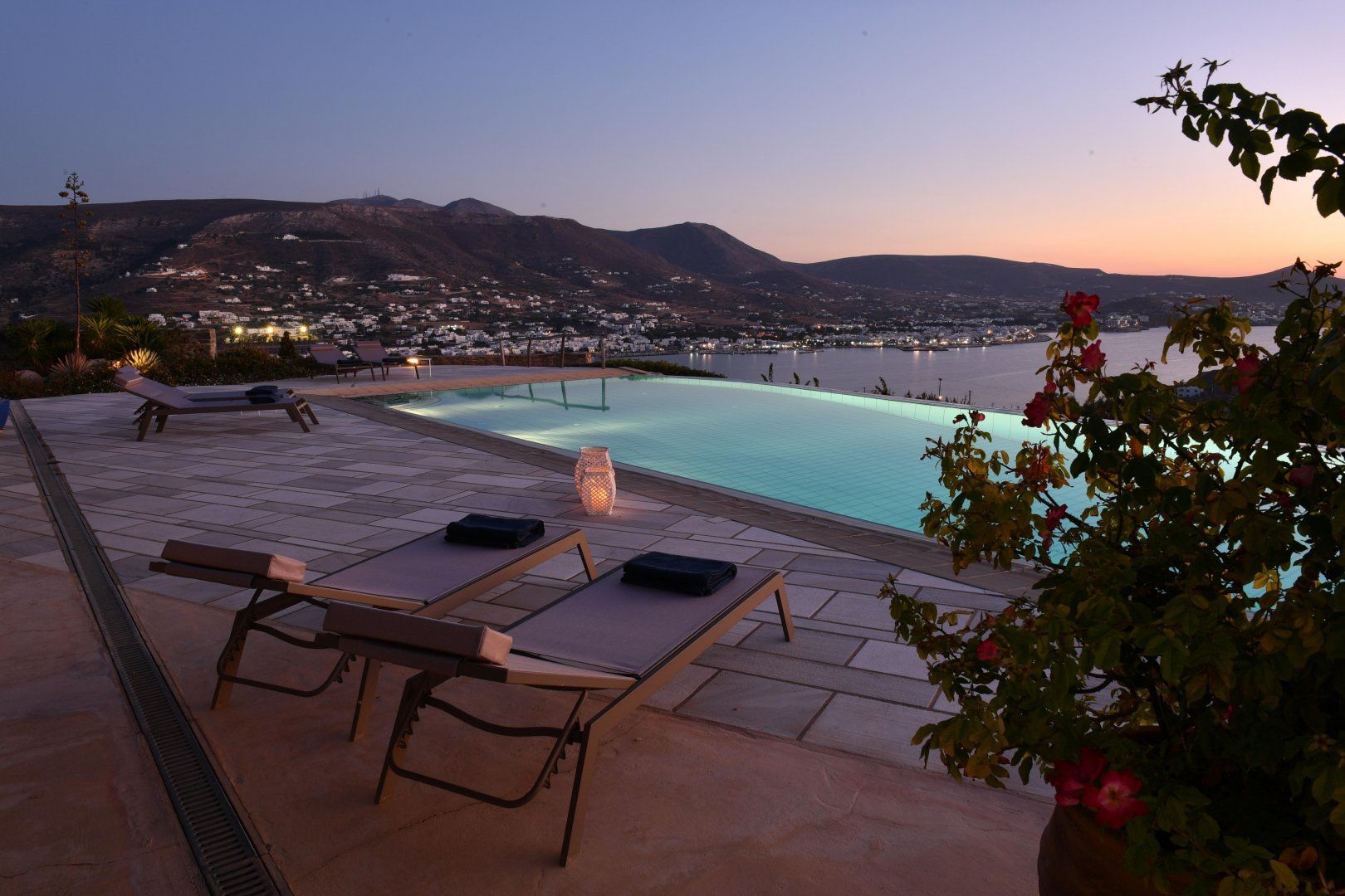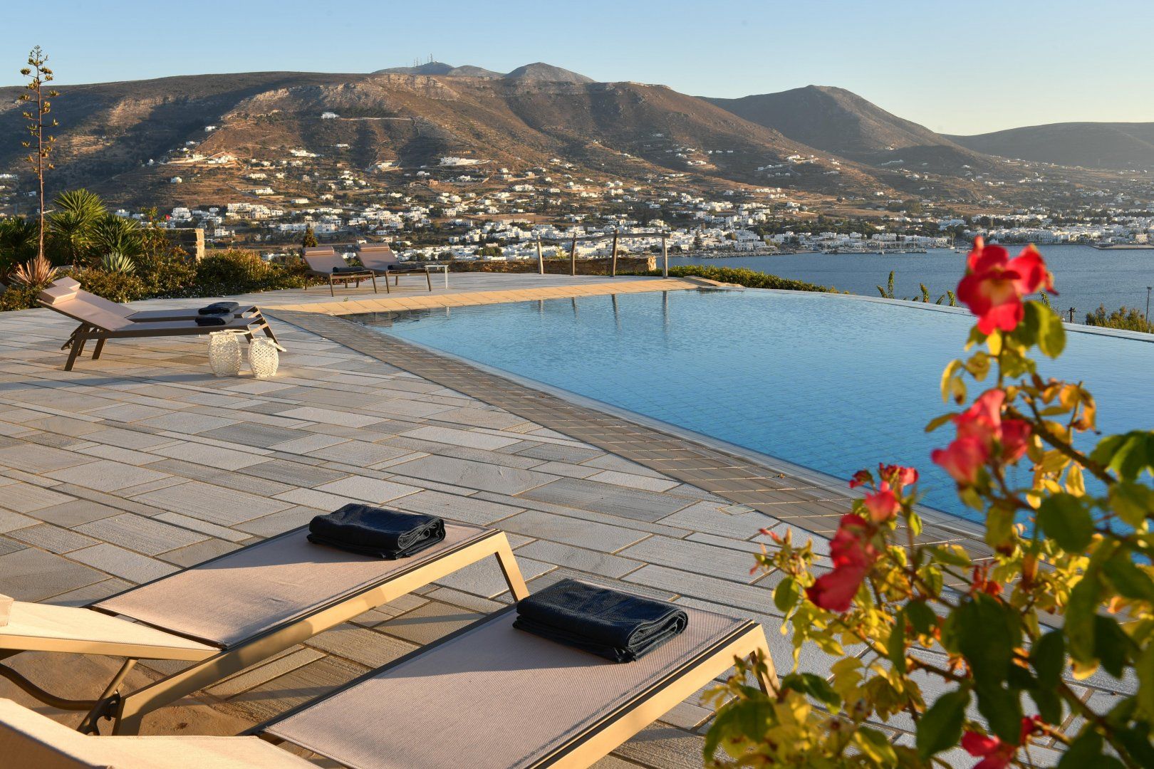 The island of Paros is begging to be explored if you can drag yourself away from this private paradise. Parikia, the capital, is only a seven-minute drive – head there for eateries, cultural landmarks and cobbled alleys lined with pretty white houses and flowered balconies. Sandy, picturesque beaches are a dime a dozen here and are all easily reached by car – including Krios, Marcelo and Livadia, just five minutes away.