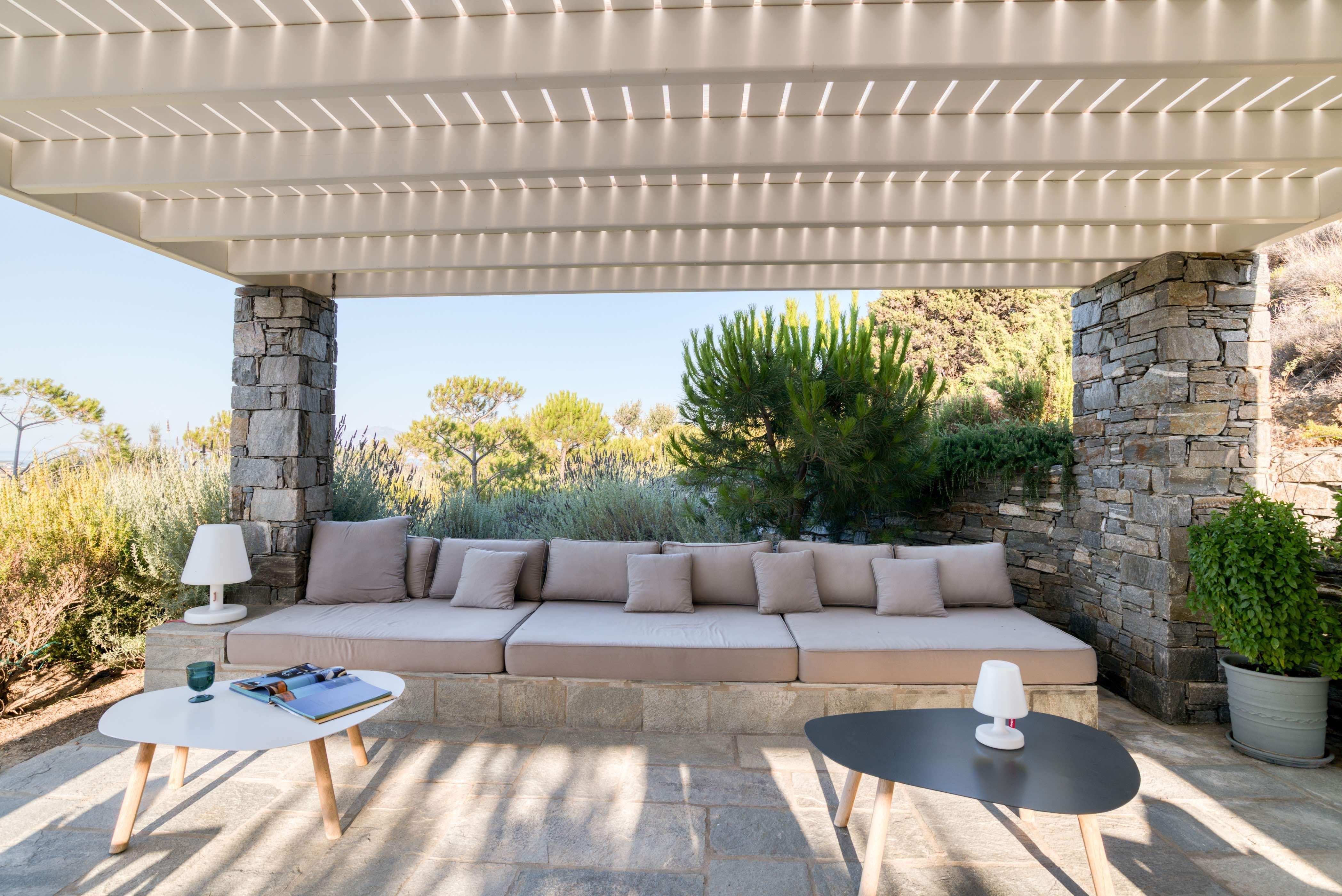 On a hilltop in the middle of Paros, this traditional villa has views for miles, taking in a patchwork of fields, sugarcube houses and the sparkling Aegean beyond. This place has been designed to spend most of your time outdoors, lounging by the infinity pool or reclining on a shaded sofa beneath a pergola. Myriad private terraces and patios allow the group to spread out, and there are artsy touches to the grounds as well, with striking metal sculptures sitting against the landscape.