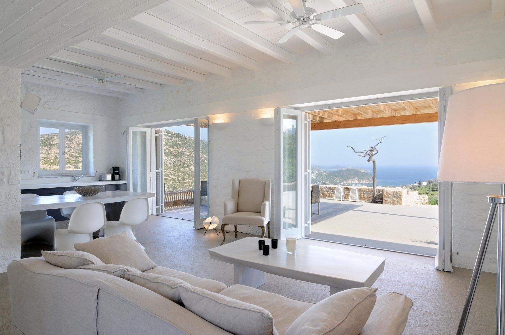 The interior is bright and cool, with beamed ceilings and huge windows that make it a real island retreat. Wake up in the morning to the sun streaming onto your pillow, and make your way straight out onto the terrace to stretch and breathe in the warm, sweet-scented air.