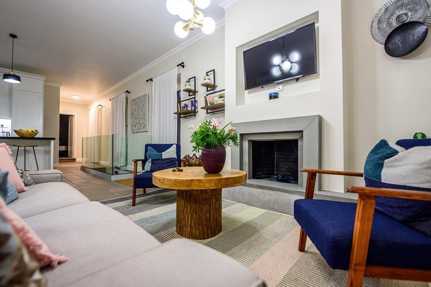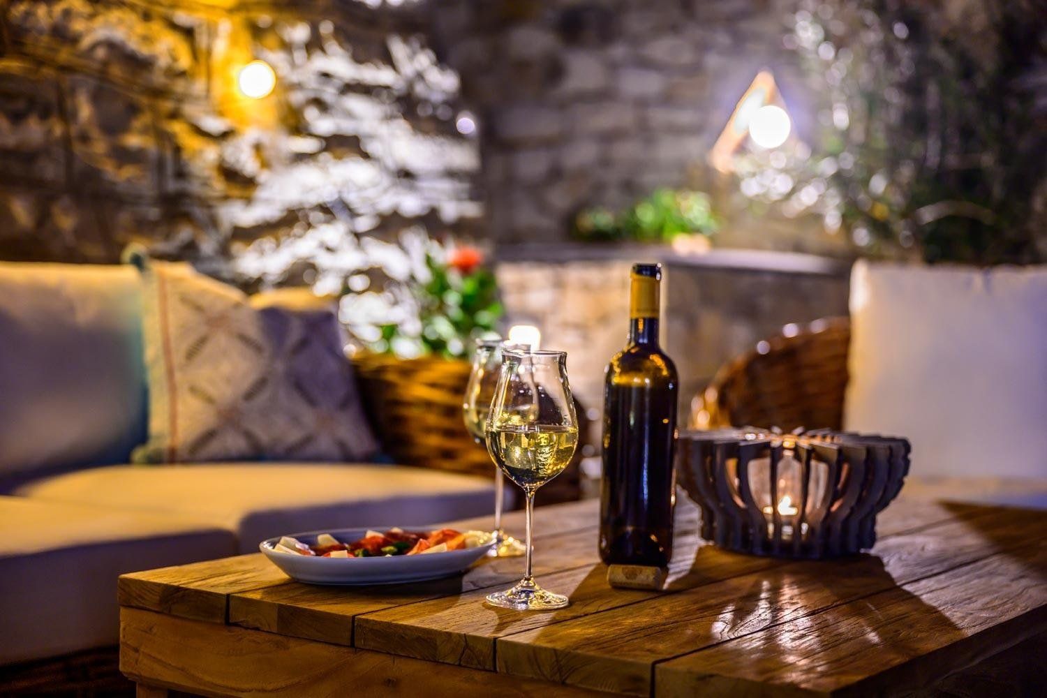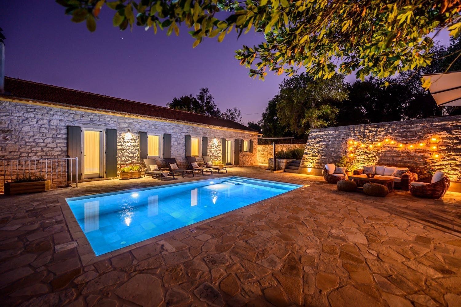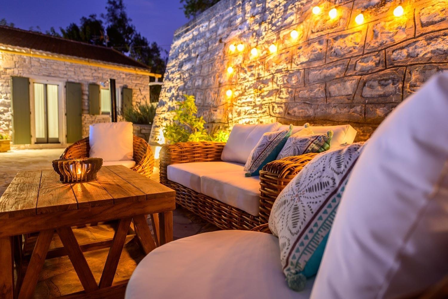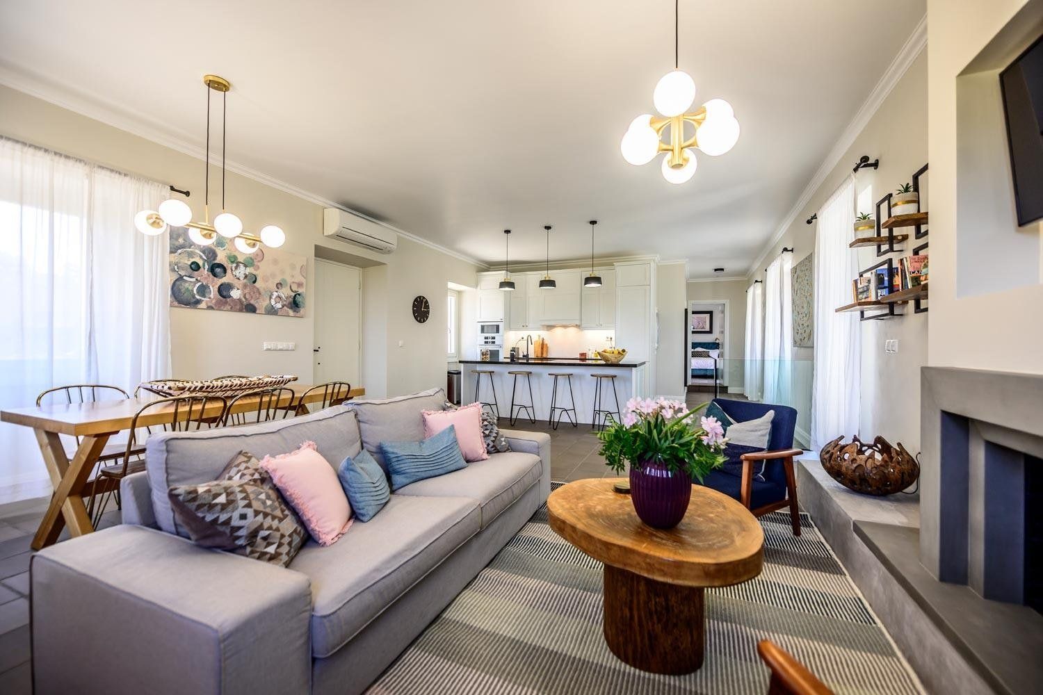 Surrounded by mellow stone walls, this garden is a Greek paradise with its Ionian Sea views and sparkling azure pool. Relax on the comfy rattan furniture with a cold drink, or go for a refreshing dip to cool off from the Paxos sun. We love it here when the sun sets, and the twinkly lights come on, giving this outdoor space a magical feel. For an alfresco dinner, whizz up some skordalia (garlic dip) in the kitchen’s blender and serve with some souvlaki grilled to perfection on the barbecue. Then later, head inside to the large open plan living space with its soothing grey hues and exposed stone walls.
