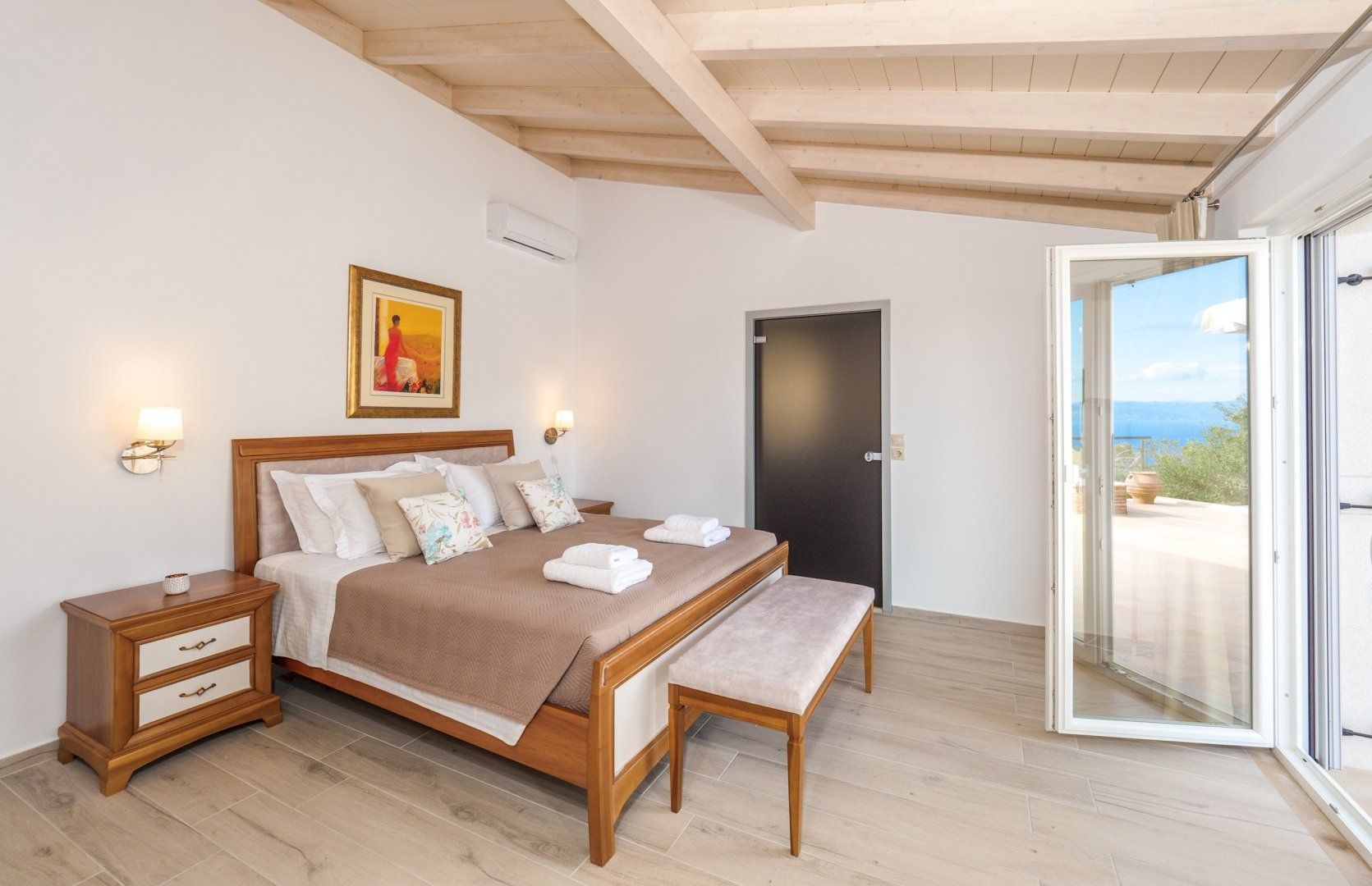 We love the charming interior, bathed in streams of natural light flooding in through the huge windows. The open-plan living area offers cosiness and comfort at the end of a long day in the sun. Enjoy evenings of wine in the company of your loved ones and rustle up delicious meals in the bright kitchen. You’ll be able to savour your feasts inside or out on the terrace, where those sea views will take your breath away.