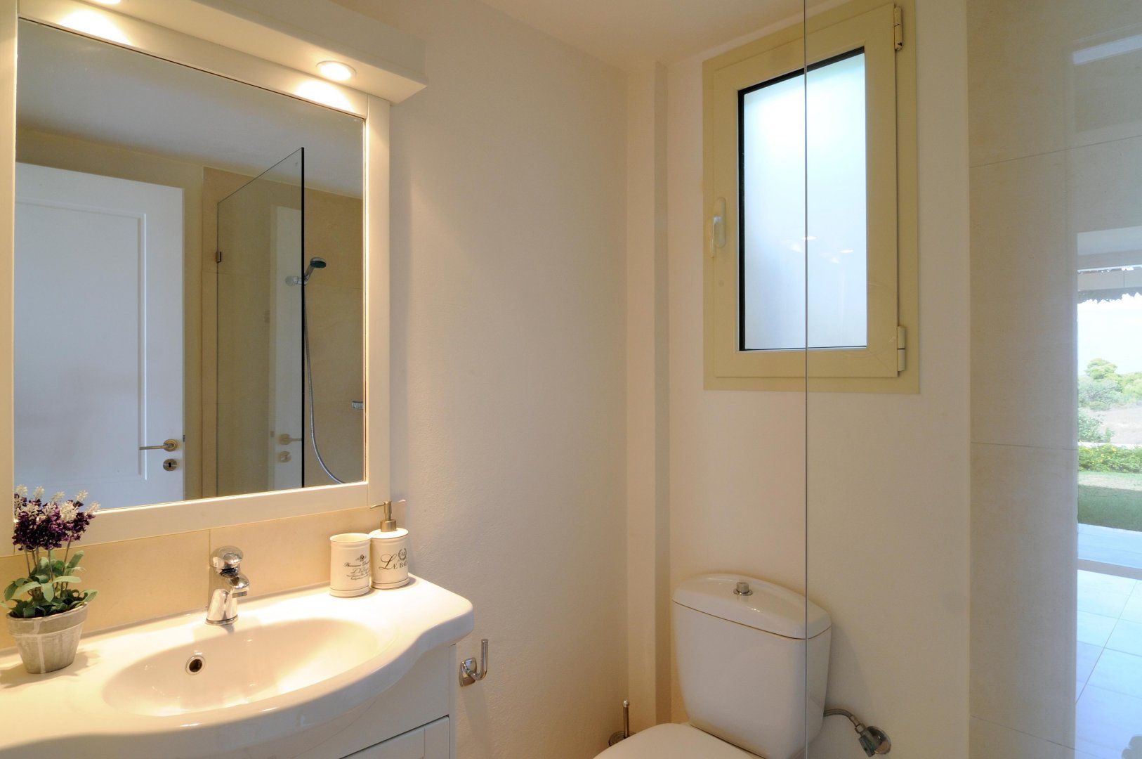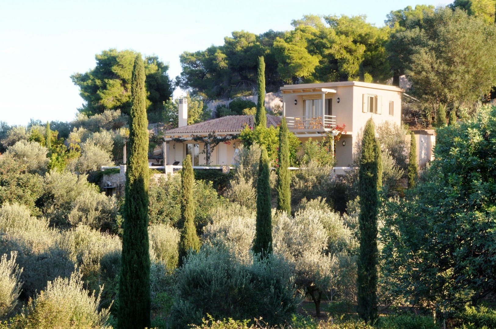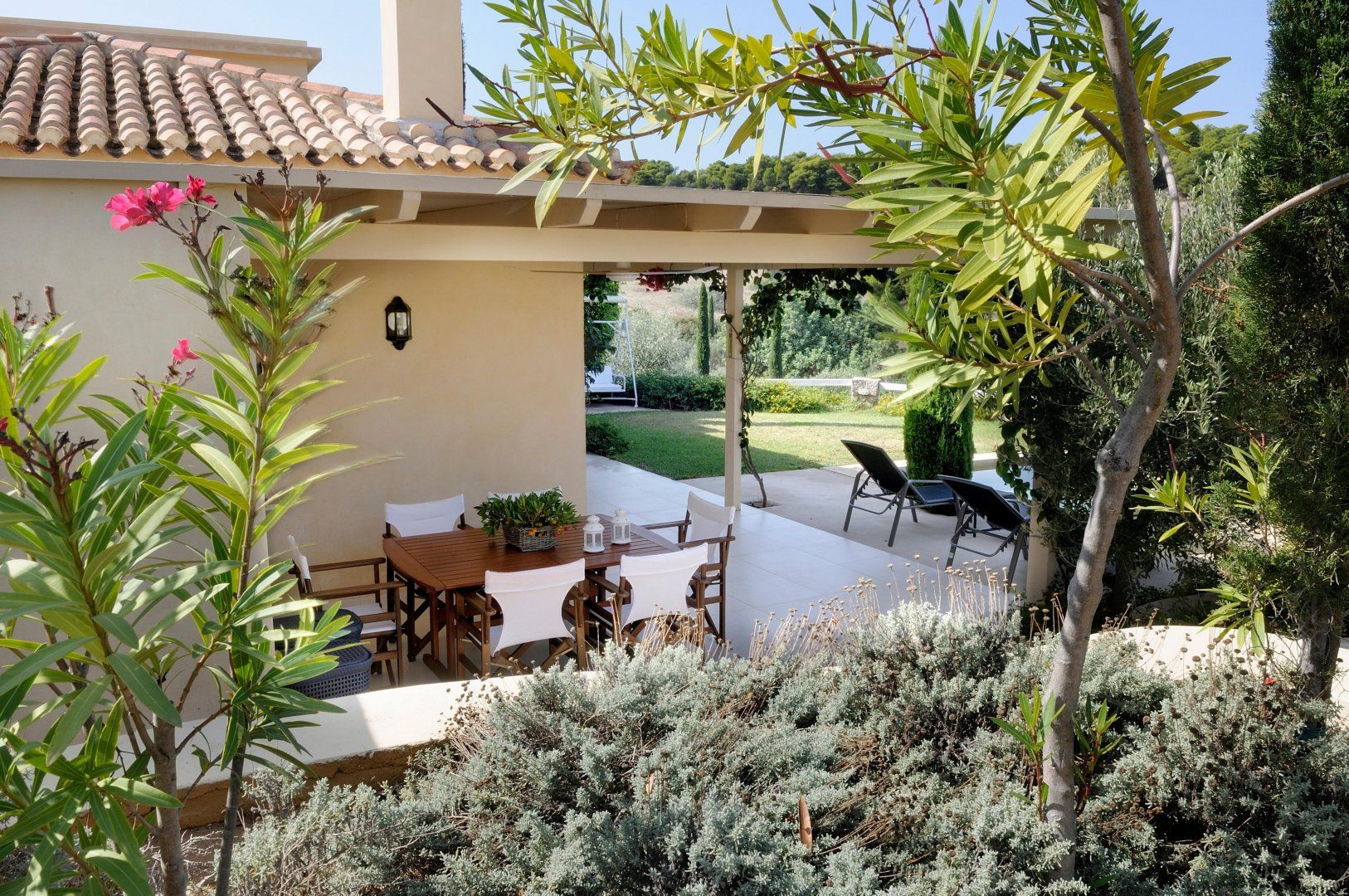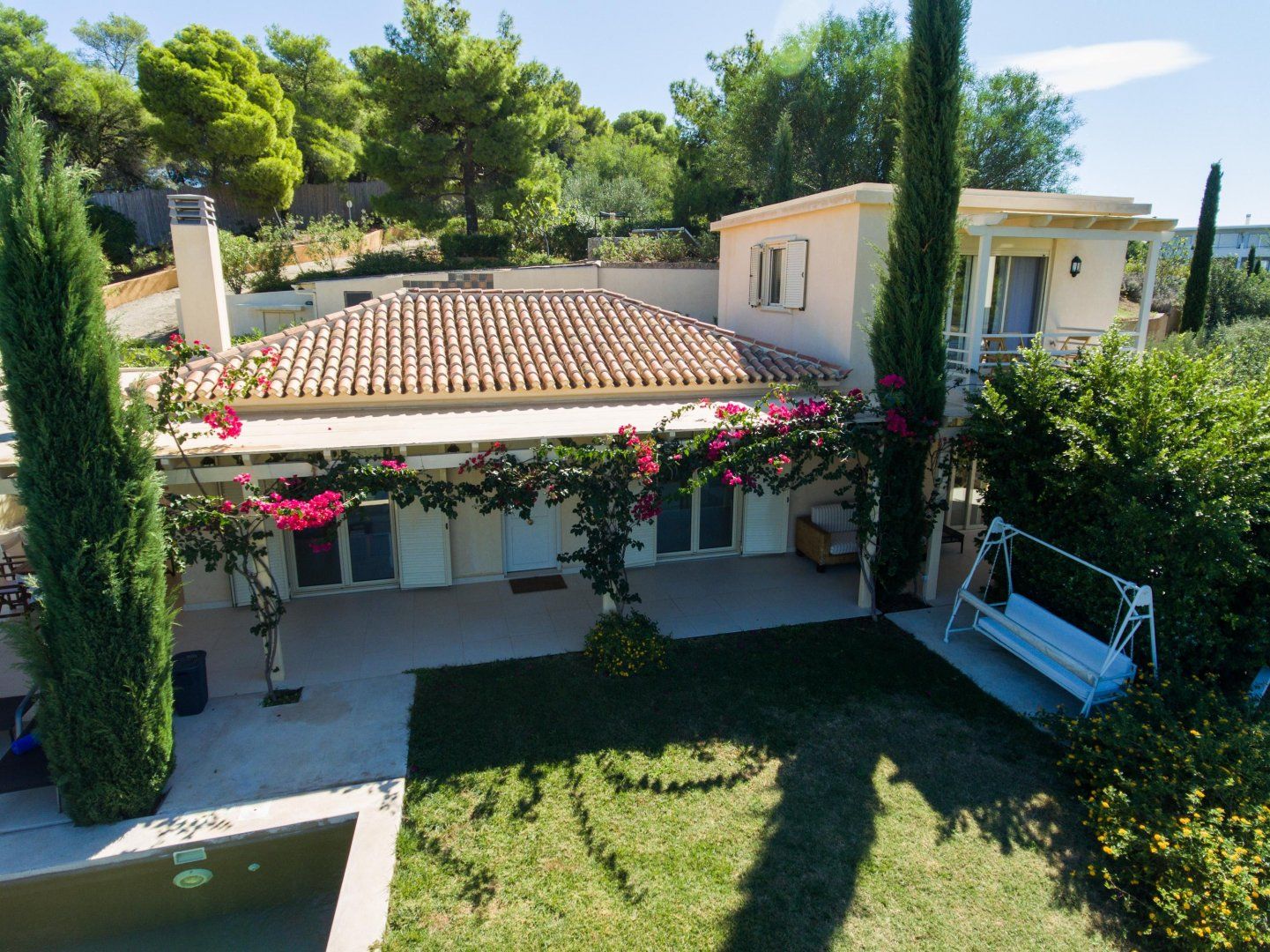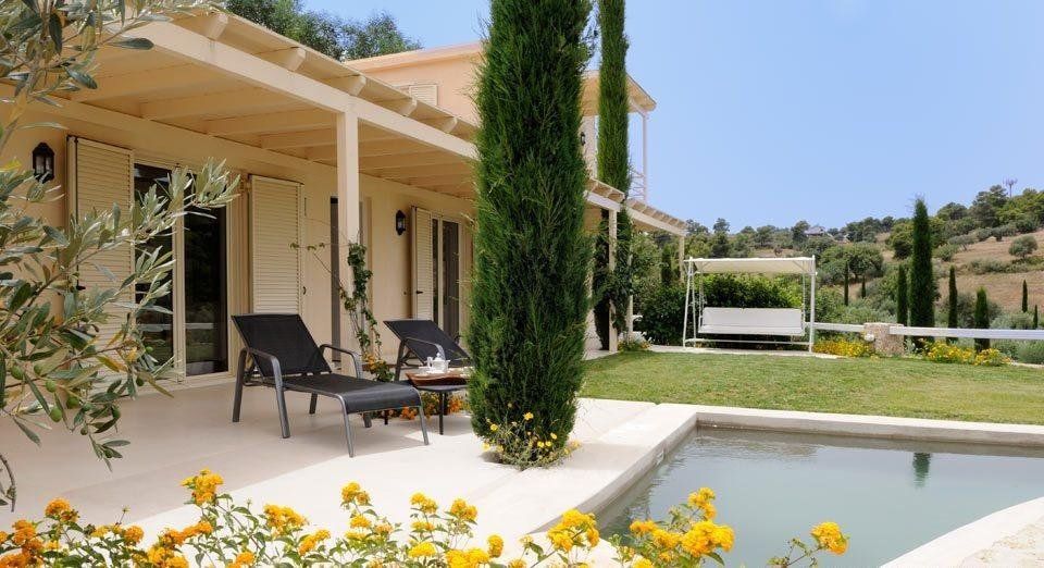 Exotic flowers splash the villa with colour and undulating hillside acts as a beautiful shield – this pretty picture of a home is your own slice of Greek paradise.