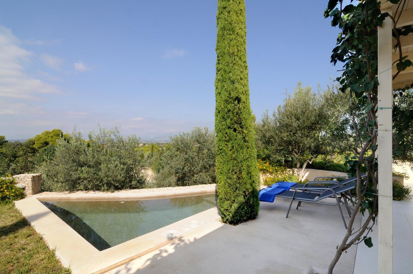 Spend your mornings chilling in the pool, before lounging on the sun beds underneath the afternoon sun. Come the evening, the dreamy home is shaped by charming seating areas. Enjoy some bread and hummus under the pergola or move to one of the balconies for spectacular views.