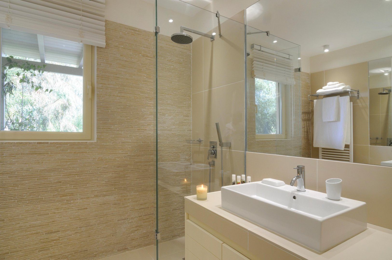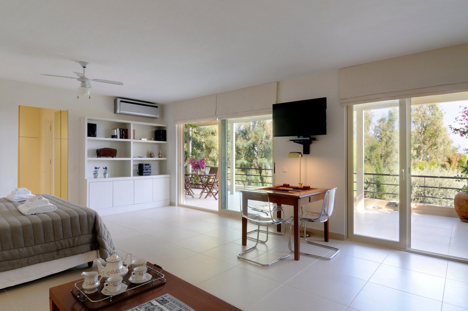 In the outside space, the view of the Aegean Sea can be admired from the alfresco dining table on the terrace or from the cool waters of the swimming pool. There are further shady spots to be discovered in the garden filled with Mediterranean vegetation.