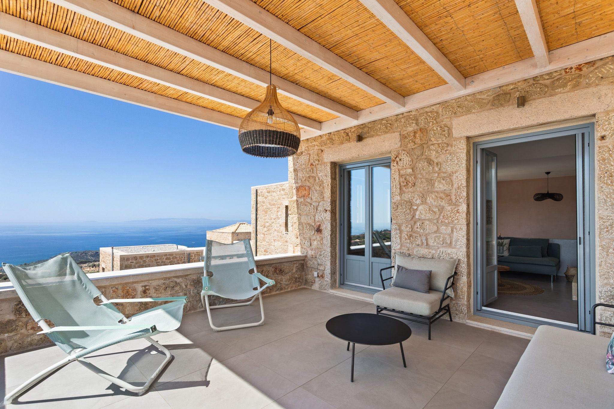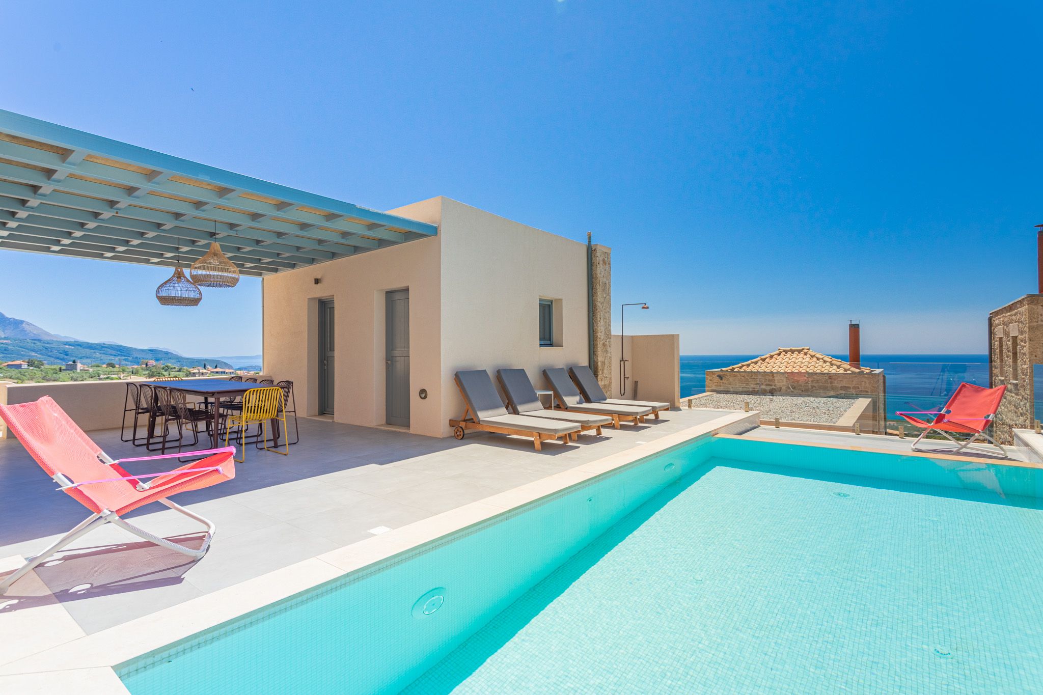 This beautiful stone villa is in Neochari, fifteen minutes from the traditional village of Kardamili. The beach and harbour of Agios Nikolaos are ten minutes away, should you fancy a dip in the sea. The villa has a private swimming pool with sun loungers around it, and several spots for dining alfresco – is there anything better than fresh grilled seafood? Inside, the villa is cool and comfortable, with a fully-equipped kitchen. Ideal for groups, this home has plenty of space inside and out.