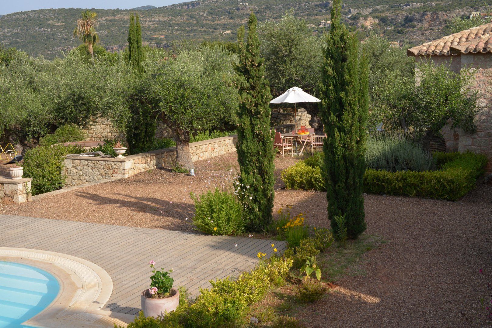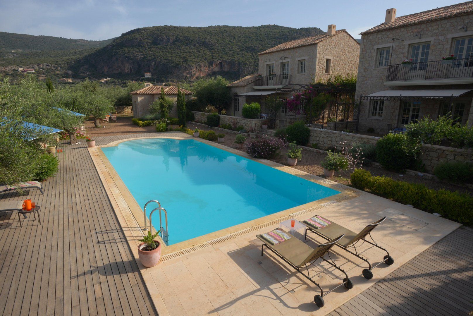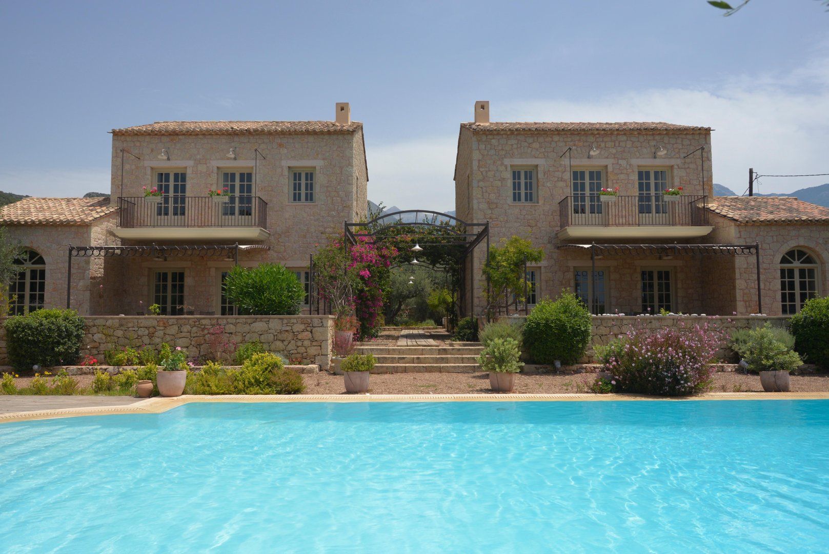 Two handsome villas made from local Mani stone and Byzantine tiles stand side by side at the centre of the plot, separated by a picturesque foliage-covered pergola leading to the garden. Out here, you'll find a long swimming pool, as well as plenty of loungers with views of the Greek countryside. Add to this a stone barbecue and a children's play area, and it's not hard to see where summer afternoons will be passed.