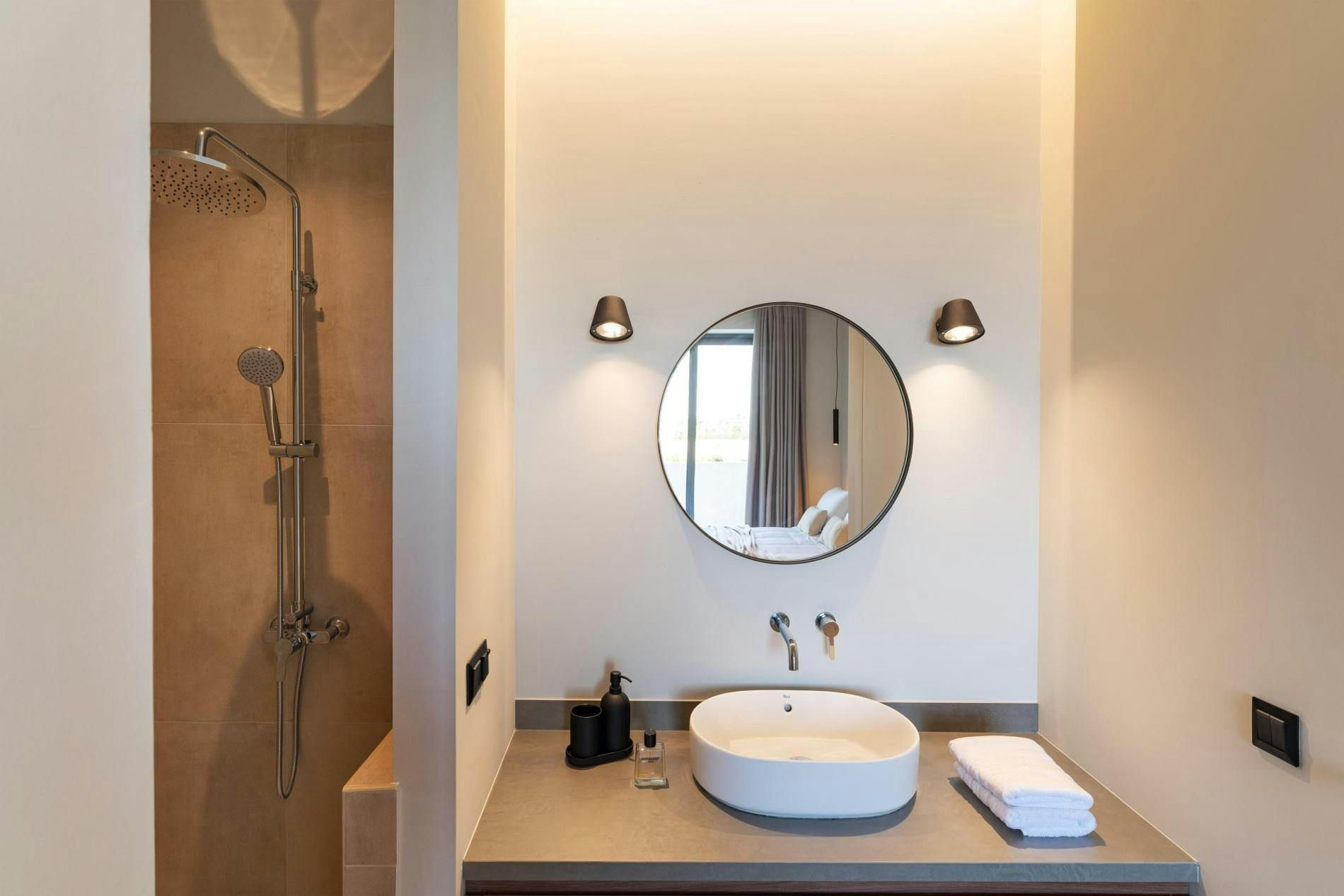 Set on a hill, this modern villa has wonderful views of the Aegean Sea and Lindos from its private pool and terrace. There’s also a shared outdoor gym with a treadmill, fitness bike and weights. Plus, to keep everyone entertained, there’s a communal table tennis, foosball and a pool table – this place is great for families. Inside, there’s an open-plan living space with more of those fantastic vistas and a sofa bed for guests seven and eight. Location-wise, Charaki beach is only a five-minute drive away, while Lindos is around fifteen minutes by car.