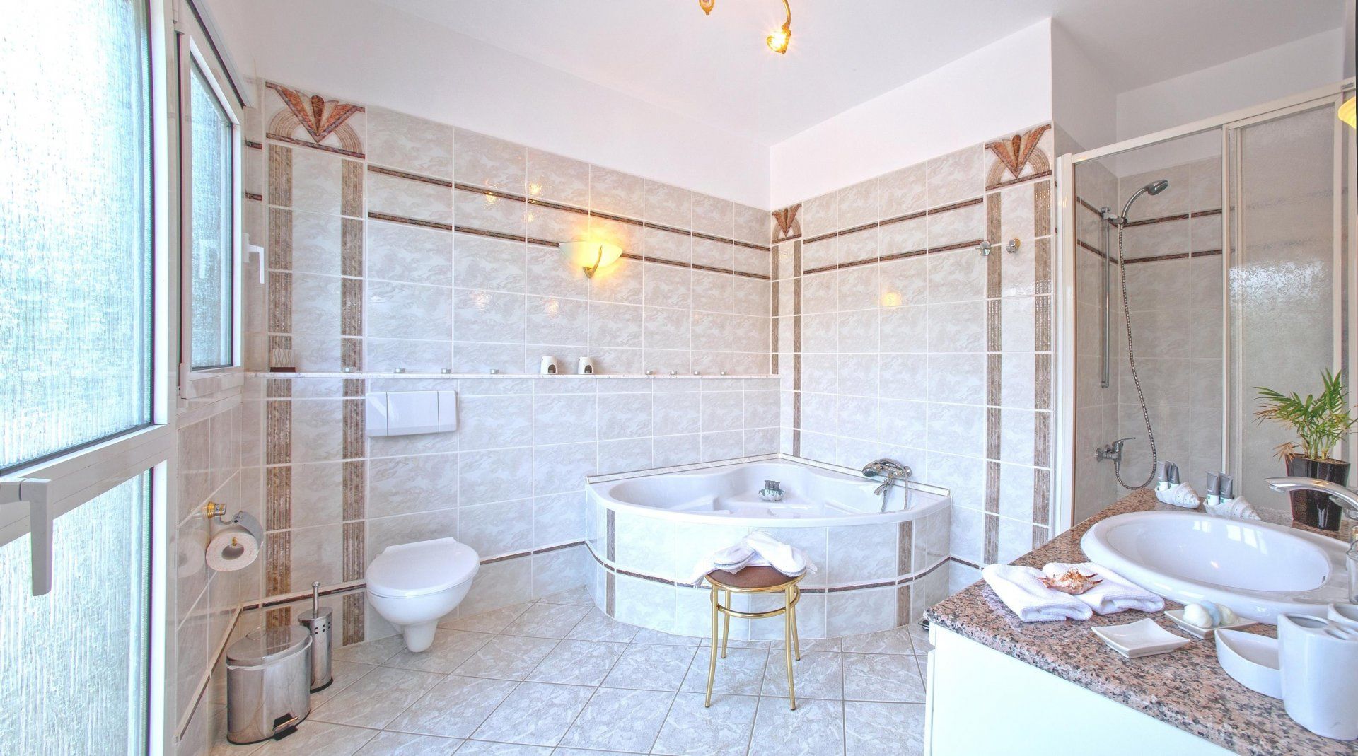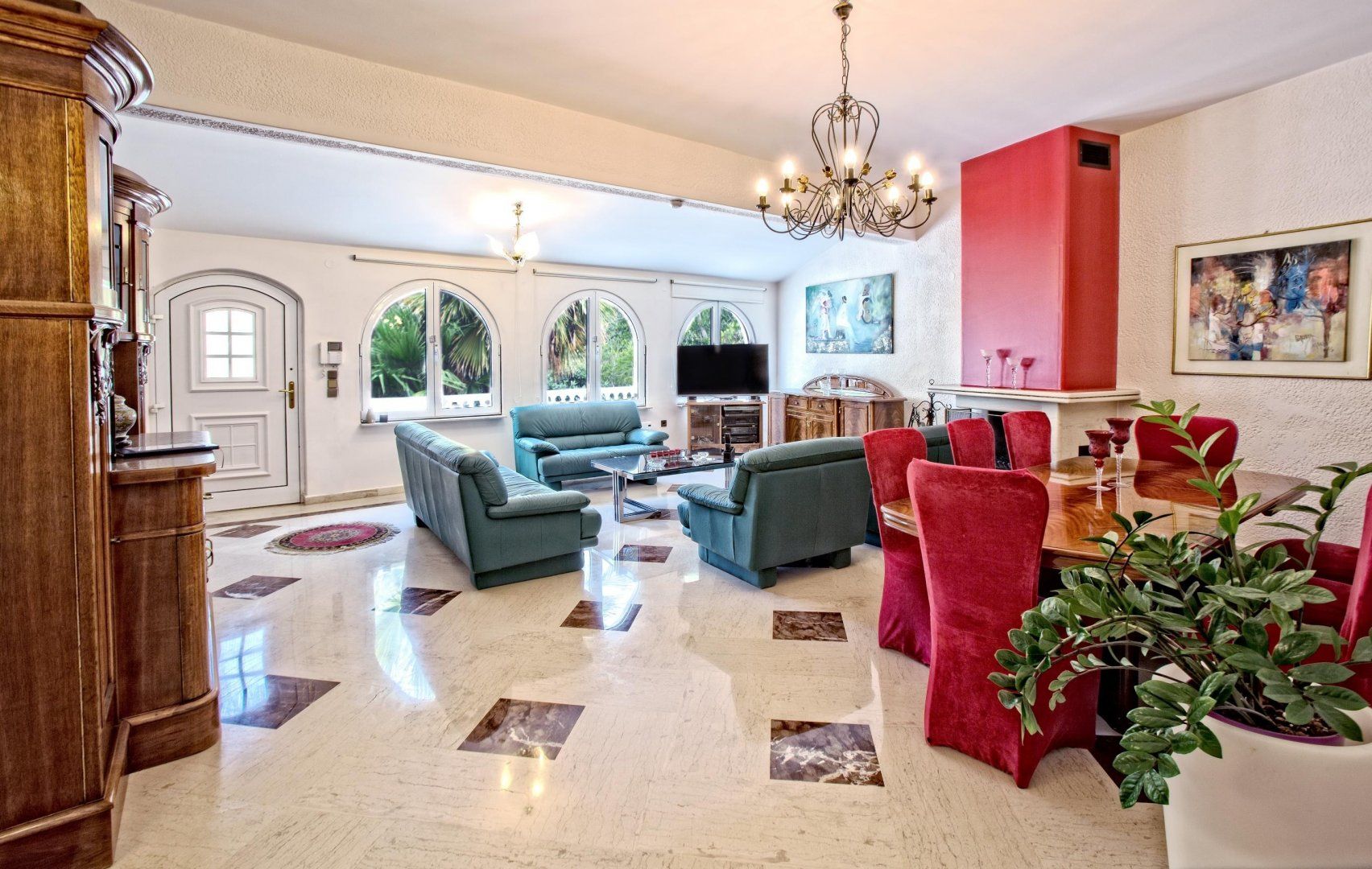 Inside, a sense of seaside-chic and grandeur combine. The dark-wood dining table lined with velvet chairs is a nod to 19th-century splendour, alongside a marble fireplace, candelabra and hand-carved dresser in the lounge. Bedrooms open up to private balconies and terraces, and the master ensuite comes with a glorious corner Jacuzzi tub.