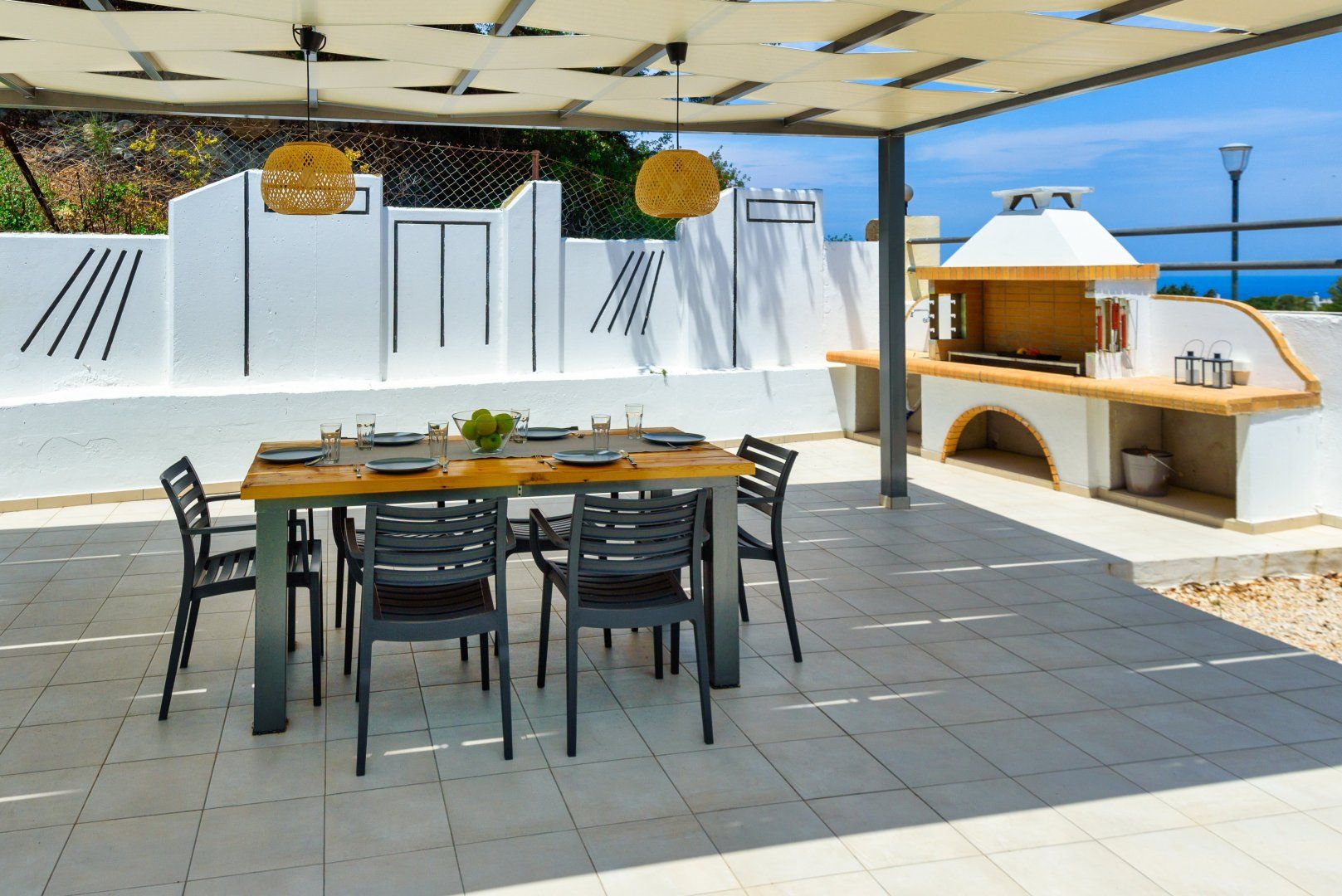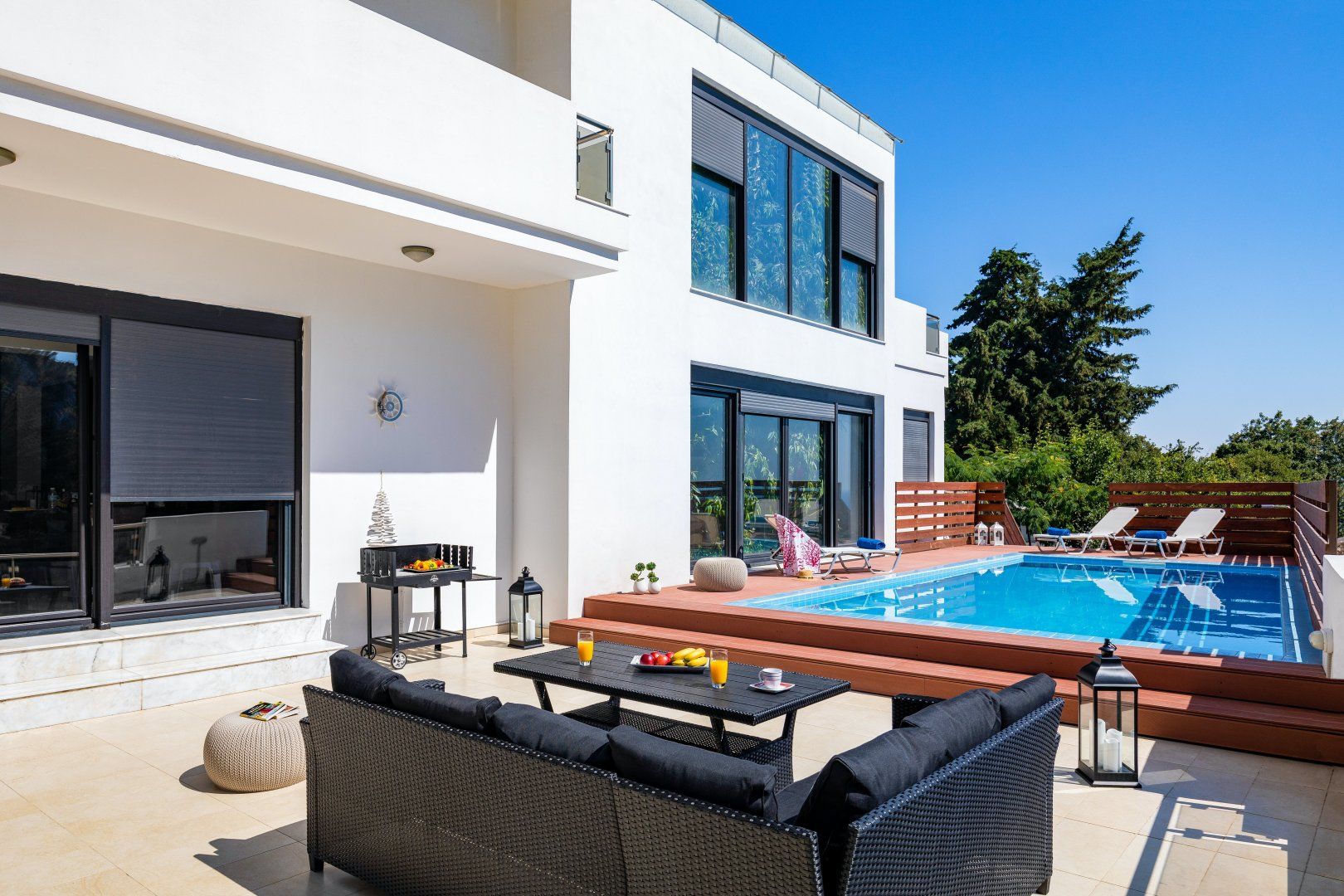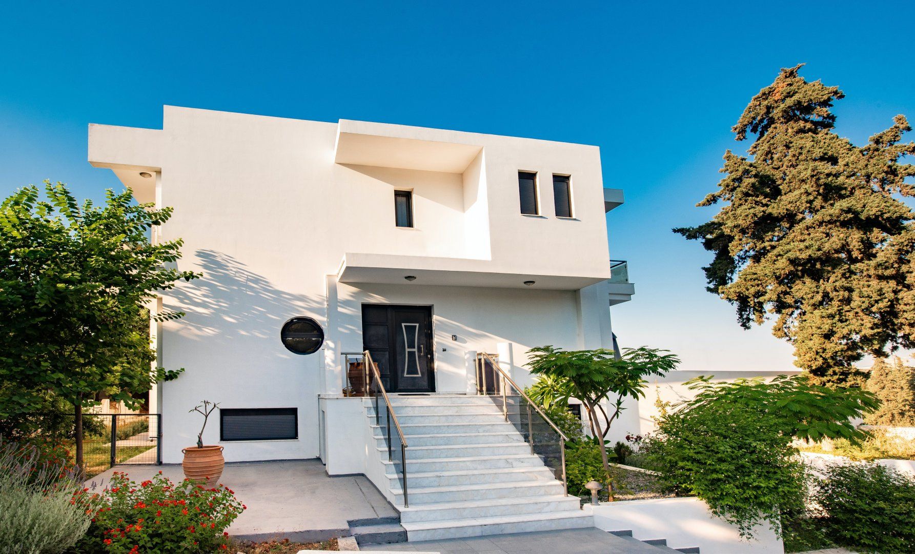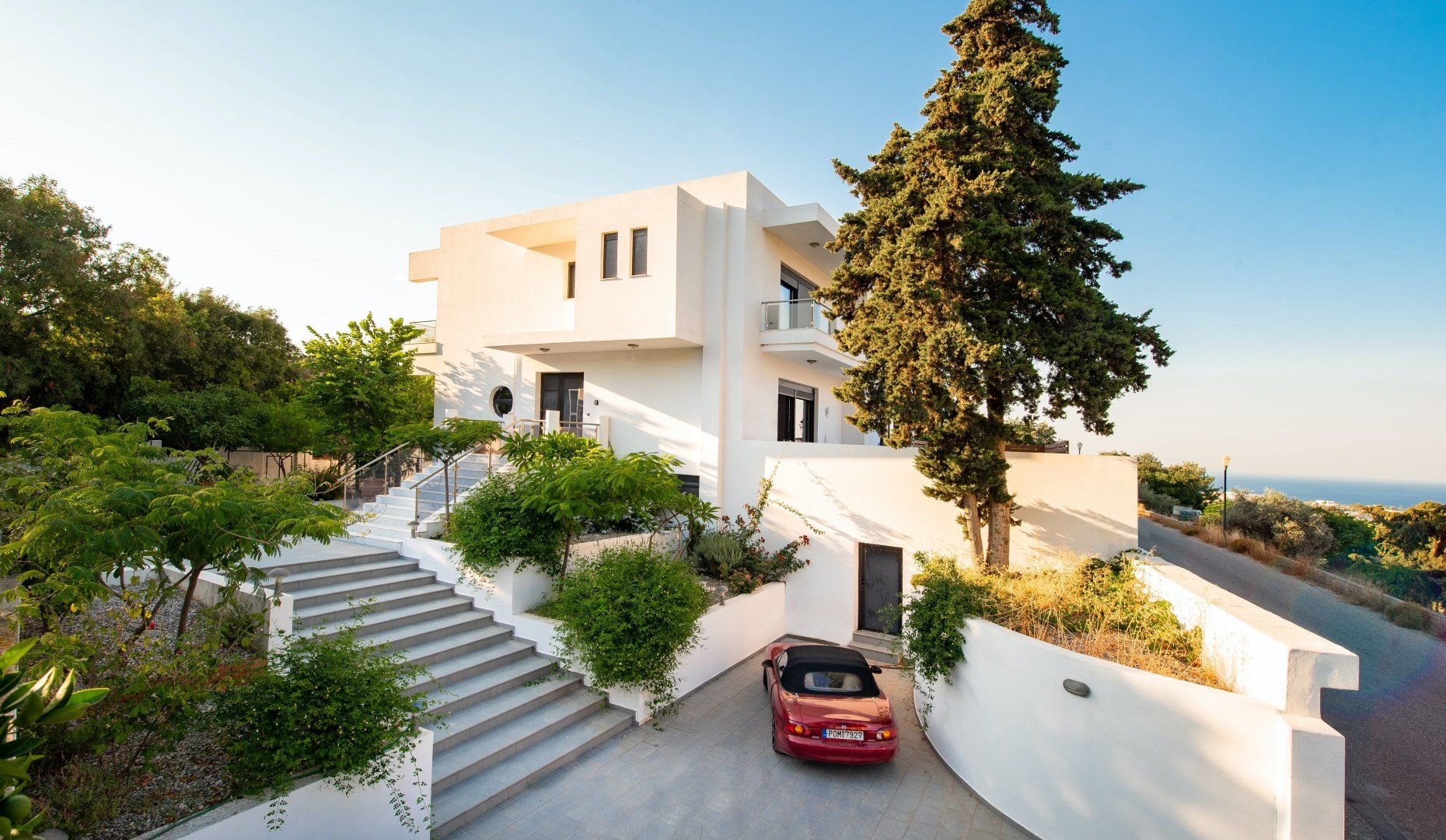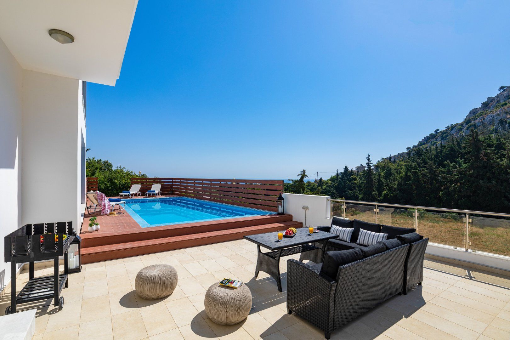 Melograno Villa is a magnificent property located in the charming village of Koskinou, Rhodes. Offering breathtaking views of the sparkling sea, this villa provides the ideal escape for up to 10 guests. Step inside and discover spacious and elegantly designed interiors, exuding a warm and welcoming atmosphere. With five beautiful bedrooms, including three ensuite bathrooms, you'll have plenty of space to relax and unwind. Enjoy the fully equipped kitchen, two inviting living rooms, library, gym area and game console. Outside, the large well-tended gardens surround the stunning pool area, complete with parasols and sun beds. Indulge in outdoor relaxation on the spacious verandas or gather around the BBQ installation in the garden for a unique dining experience. Koskinou village is conveniently located near Rhodes town and major attractions such as Kallithea Springs and Lindos acropolis. Experience a truly unique holiday at Melograno Villa.