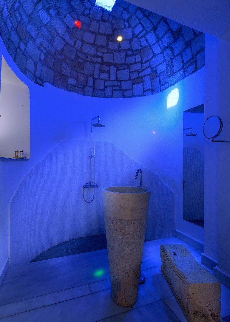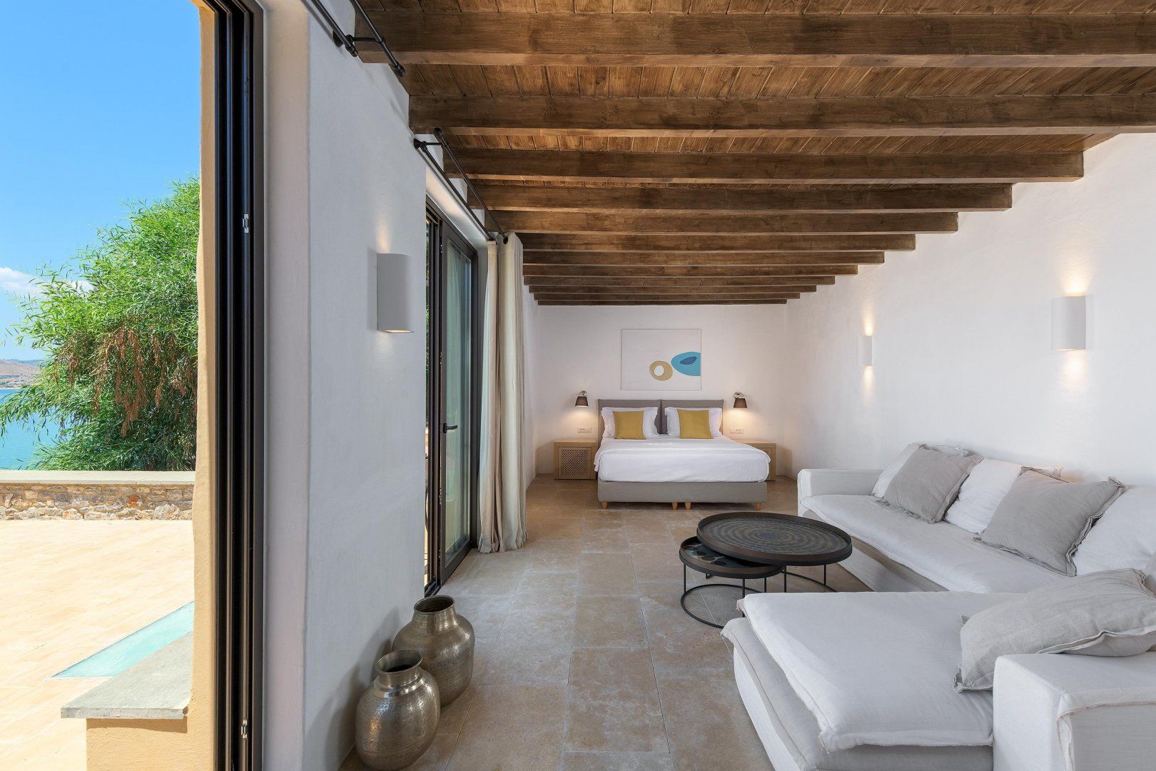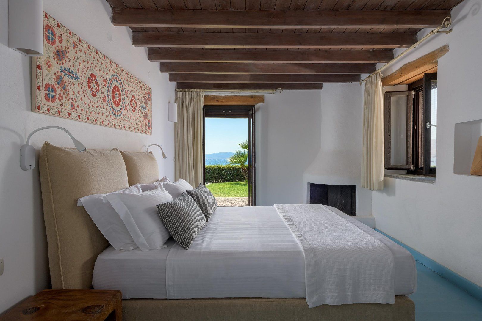 The villa’s interior combined contemporary minimalism and Dodecanese tradition with vibrant works of modern art adorning white stone walls. Each piece of furniture feels as though it’s been picked from an interior design magazine, with a Southeast Asian feel to hand-carved wardrobes and lacquered desks. Slate floors keep things cool underfoot and exposed stone archways and fireplaces are a nod to tradition.